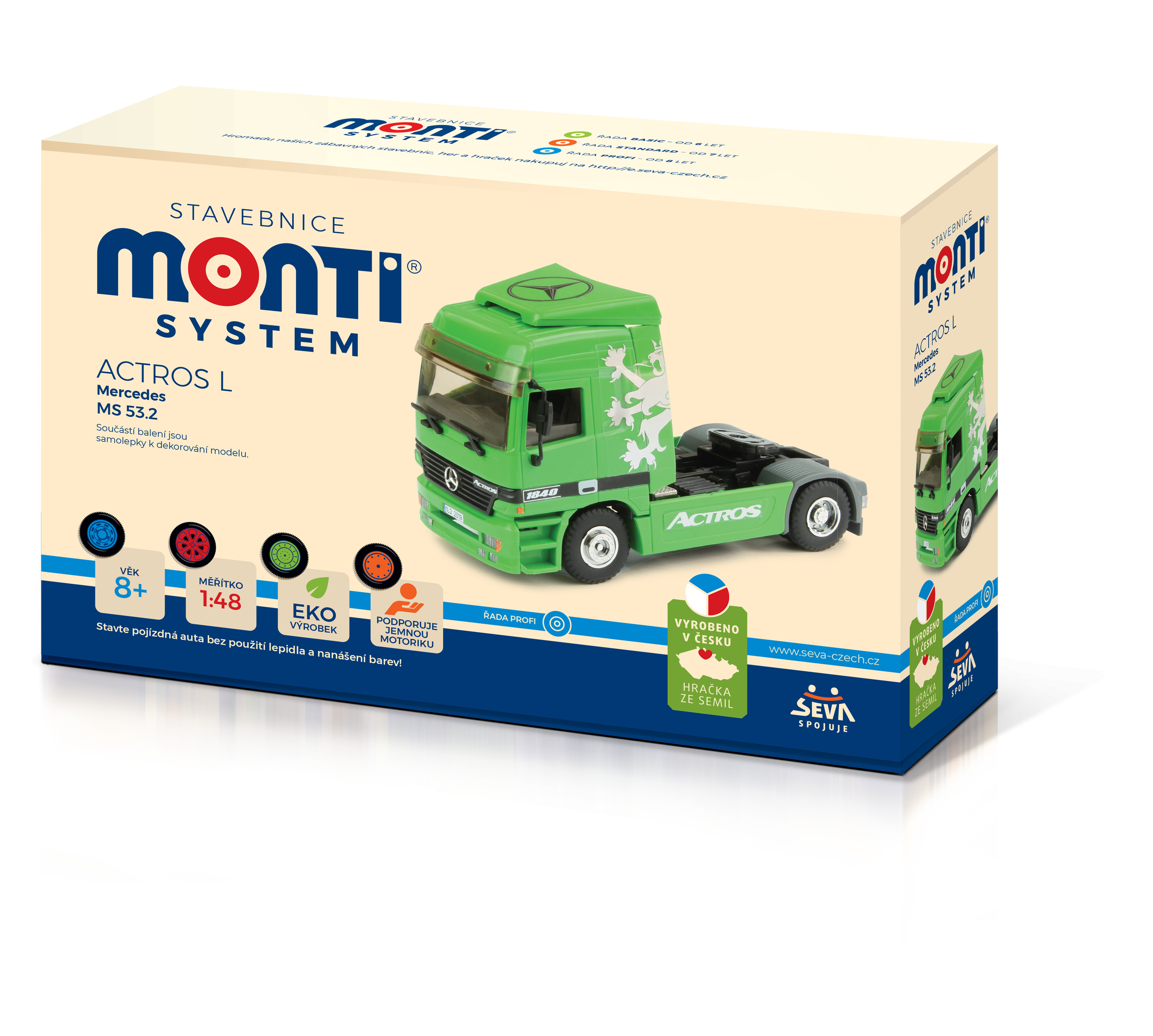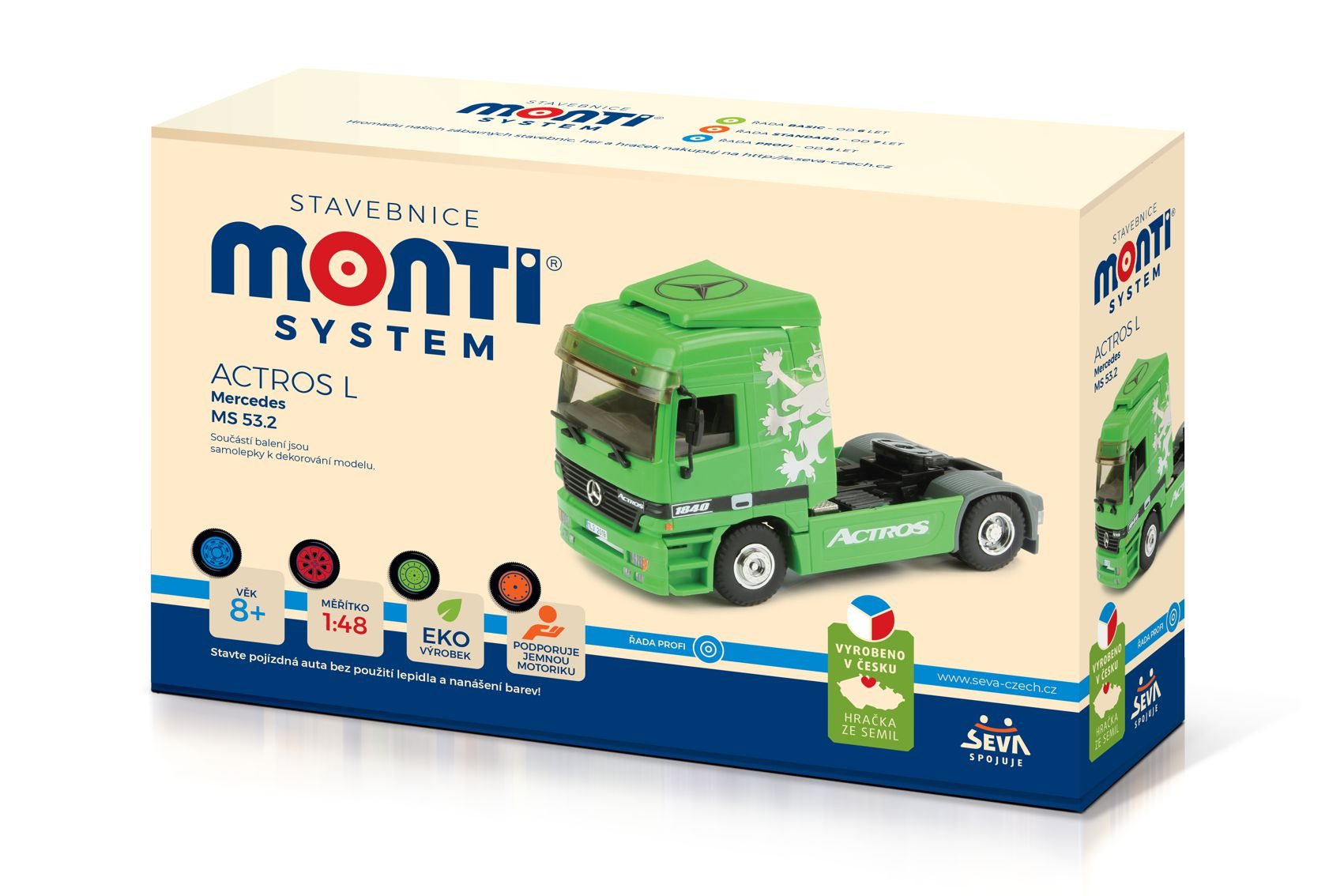 Postavte si model MS 53.2 - Actros L (zelený) bez použití lepidla a nanášení barev. Jednotlivé dílky jsou tak důmyslně vyrobeny, že s pomocí různých zacvakávacích zámků, úchytů a dalších pružných mechanismů sestavíte model bez jediné kapky lepidla. Vše do sebe jen zacvaknete nebo zasunete. Výsledkem je funkční model s úžasnými detaily, který je dokonalou replikou skutečné předlohy. Jednotlivé dílky jsou lisovány již barevné, takže nemusíte nic barvit. Rozměr krabice: 22 x 15 x 6 cm Vhodné od 8 let