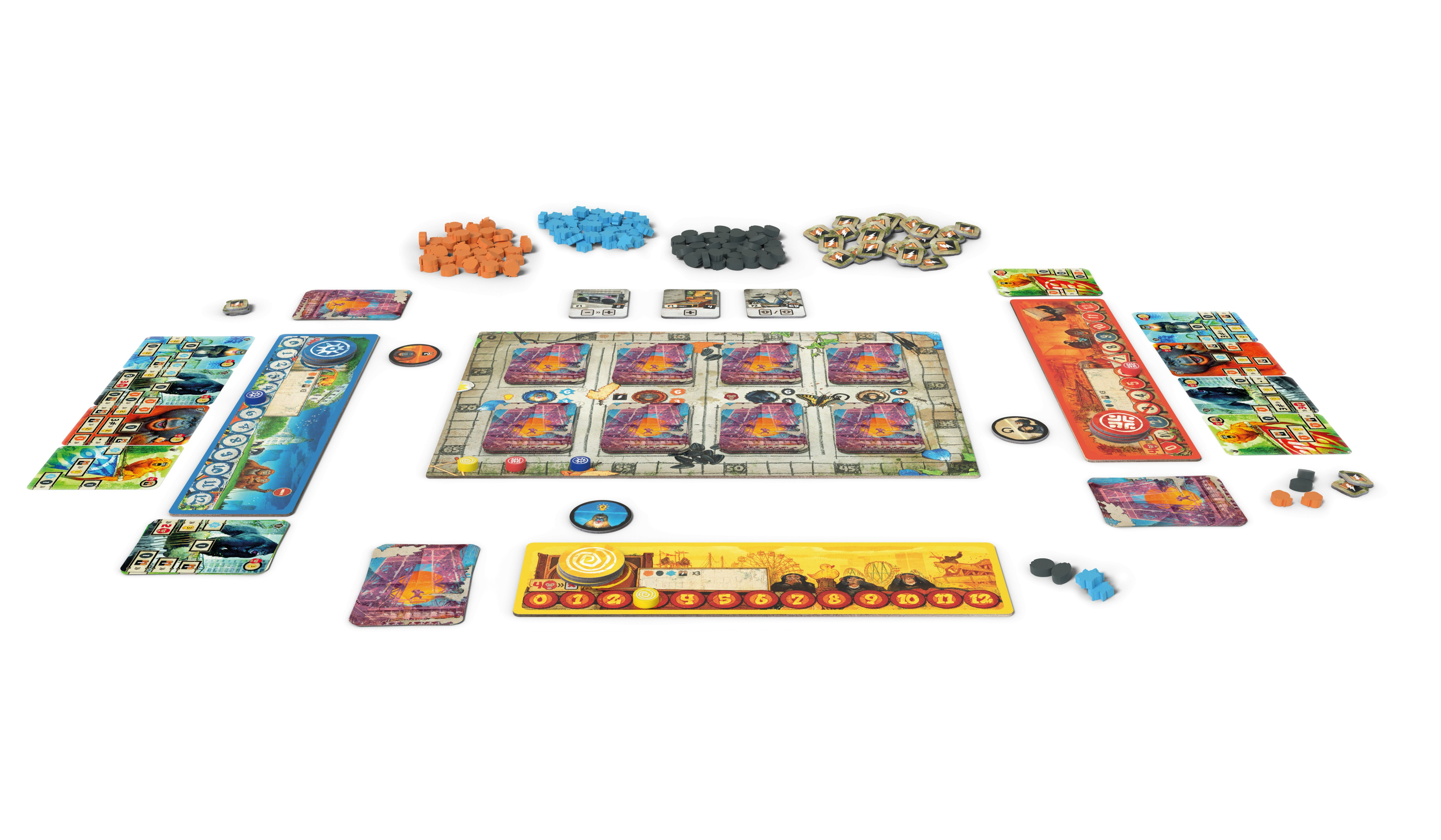 Obsah balení: 1 hlavní deska 6 desek hráčů 12 dřevěných žetonů hráčů 24 akčních disků 48 počátečních karet 120 karet kmene 6 pomocných karet 120 dřevěných žetonů potravy 47 žetonů energie 7 dílků předmětů pravidla