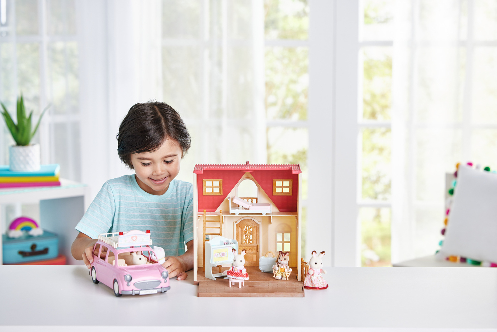 Patrový dům se světly má červenou střechu a béžové stěny, které tvoří nádherný domov rodinky Čokoládových králíčků. Pokoje jsou vybaveny 3 světly, z nichž každé lze zapnout. Dům může být otevřen pro hraní 90 stupňů, 180 stupňů i jakýkoli jiný úhel mezi nimi. Uzavření domu vytváří vzhled nádherného domova, bez ohledu na to, z jakého úhlu se na něj podíváte, a světlo se rozlévá skrz okna. Místnost druhého patra na levé straně a střecha na pravé straně jsou odnímatelné. Umístění tohoto pokoje na střechu nebo umístění střechy na terasu vytváří velký třípodlažní dům, kde si můžete hrát. Spojte dům se základním patrovým domečkem a vytvořte velký, třípatrový dům ( základní patrový dům se prodává samostatně). Umístění nábytku a figurek zvířátek do těchto místností umožňuje ještě zábavnější hru (figurky a nábytek se prodává samostatně).Věk: 3+ Dům neobsahuje figurky a nábytek.