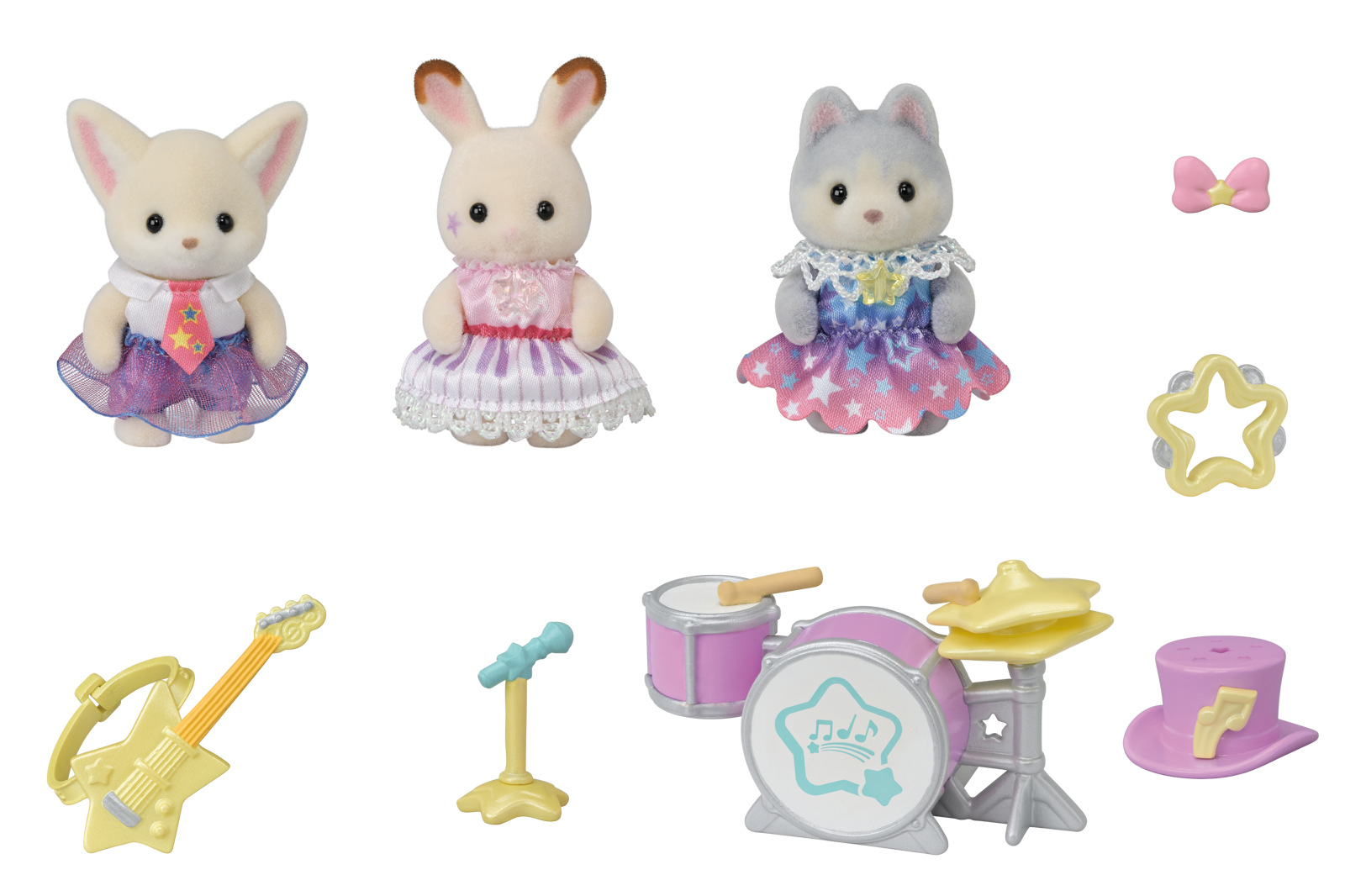 Oslavte 40. výročí Sylvanian Families s exkluzivní edicí figurek. Sada obsahuje tři miminka – baby čokoládového králíka, baby fenka a baby huskyho – oblečená v kostýmech s hvězdnou tematikou a s nástroji jako buben, kytara a tamburína. Jejich koncertní vystoupení jistě oživí publikum. Hračky Sylvanian Families rozvíjejí představivost a povzbuzují děti k hraní rolí. Hra s figurkami rozvíjí kreativitu a učí emocím vytvářením a vyprávěním příběhů založených na každodenních zážitcích a pozorování světa. Vyznačují se nejvyšší kvalitou a výjimečným důrazem na detaily. Figurky Sylvanian Families jsou pokryté měkkým semišem, mají pohyblivé končetiny a hlavu. Oblečení lze z figurek sundat a vyměnit za jiný outfit. Baleno v krabičce. Rozměry balení: 13 x 16 x 5 cm. Věk: 3+