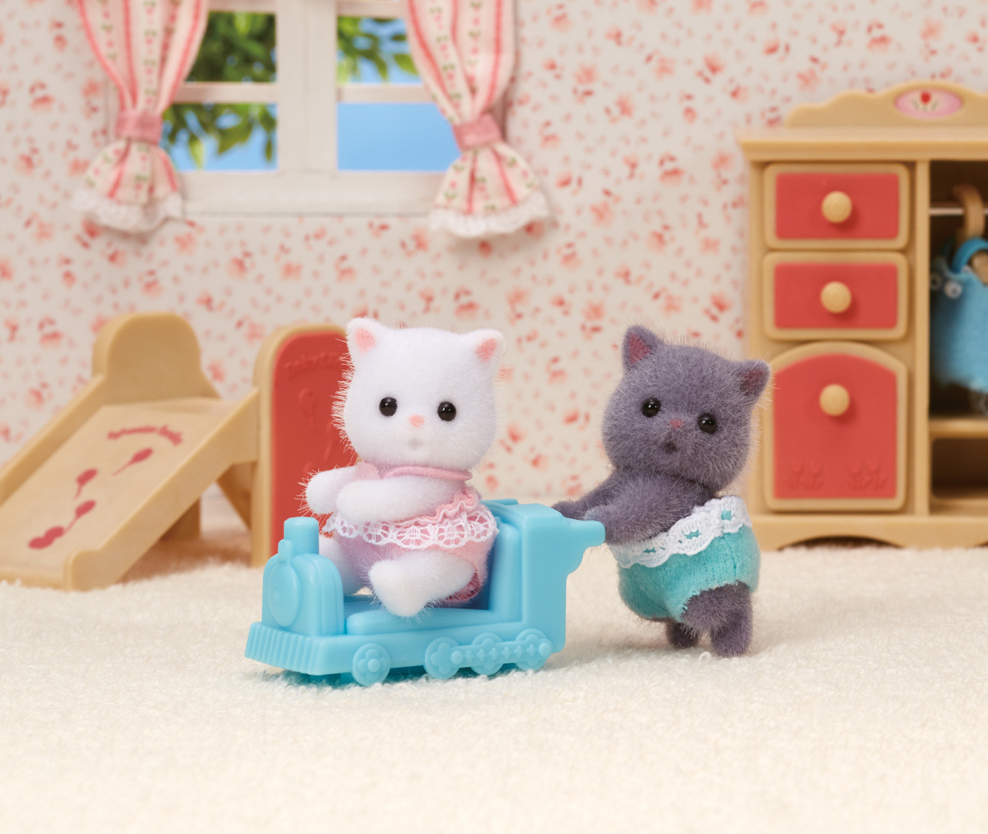 Sada roztomilých figurek dvojčat králíčků s padajícími oušky z rodiny Flora Rabbit a s vozítkem, které lze tlačit. Dívka jmenuje Viola a lezoucí chlapec jmenuje Runo. Figurky mají pohyblivé hlavičky. Obě figurky dvojčat lze umístit do vozidla (sedící a lezoucí). Vozidlo-tlačítko lze kombinovat s vozidly s dalšími sadami s dvojčaty Sylvanian Families.