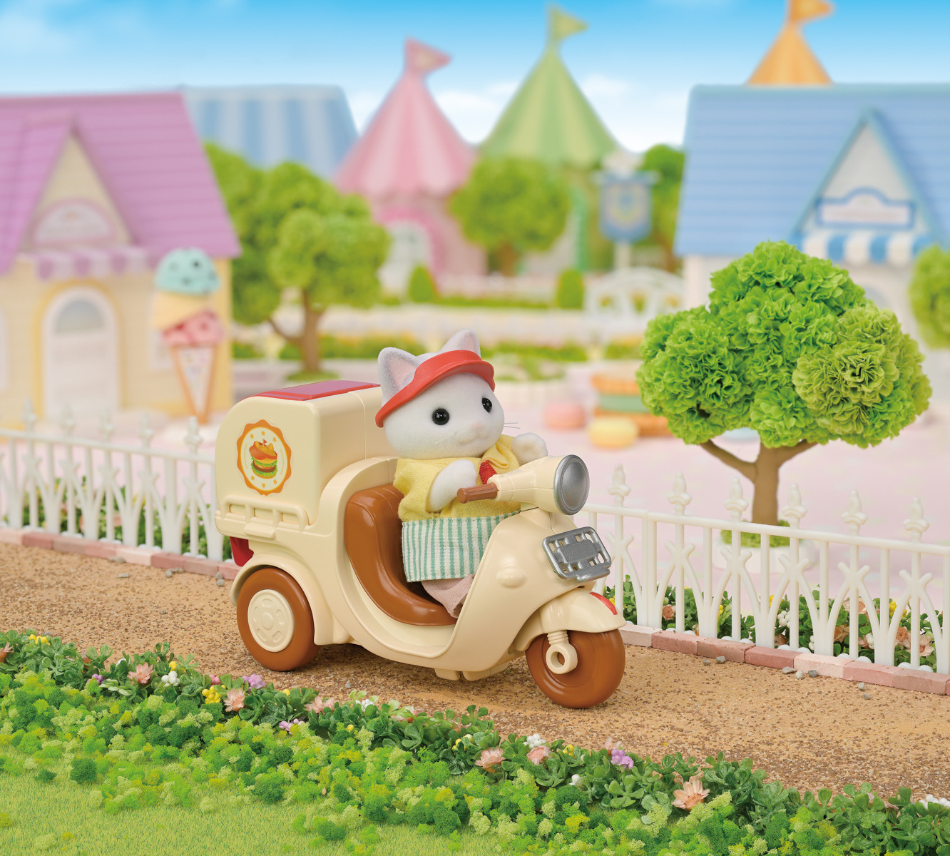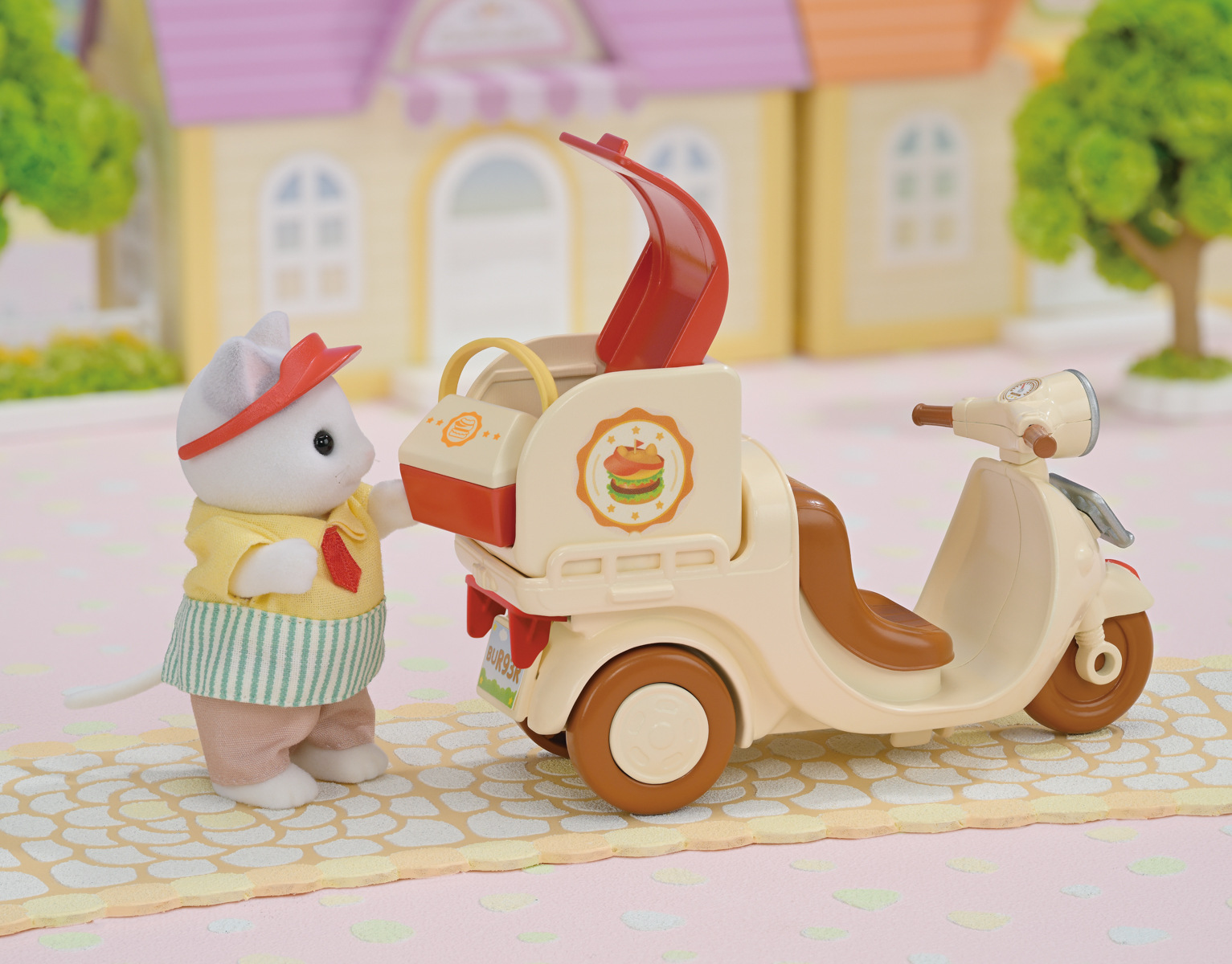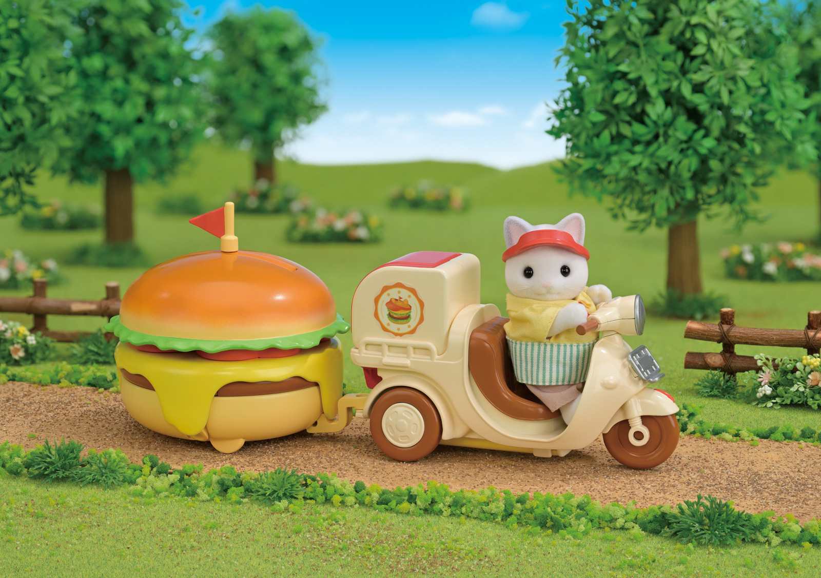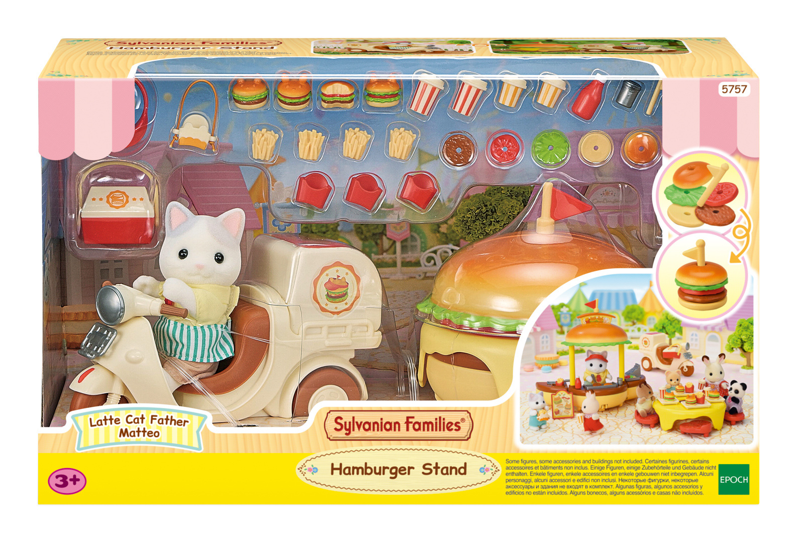 Sada Pojízdný stánek s hamburgery obsahuje figurku tatínka z rodiny Latte Cat Familly, restauraci ve tvaru obřího hamburgeru, rozvážkový skútr a spoustu doplňků. Hamburger se promění v restauraci se stolem a židlemi. Sada obsahuje více než 30 dílů, včetně lahodných hamburgerů v houskách ve tvaru kočičích uší a nápojů. Můžete si pochutnat na grilovaných karbanátcích a horkých bramborách. Pojízdný stánek s hamburgery lze složit do tvaru velkého hamburgeru a pro snadnou přepravu ho připevnit na skútr tatínka Latte Cat. Tatínek Latte Cat je majitelem hamburgerové restaurace a dodává všem obyvatelům země Sylvanian Families vynikající hamburgery. Tatínek si do restaurace s hamburgery oblékl speciální oblečení. Figurka s tímto oblečením je k dispozici pouze v této sadě. Hračky Sylvanian Families vyrábí japonská společnost Epoch již více než 35 let. Vyznačují se výjimečnou kvalitou a smyslem pro detail. Doporučujeme od 3 let věku.