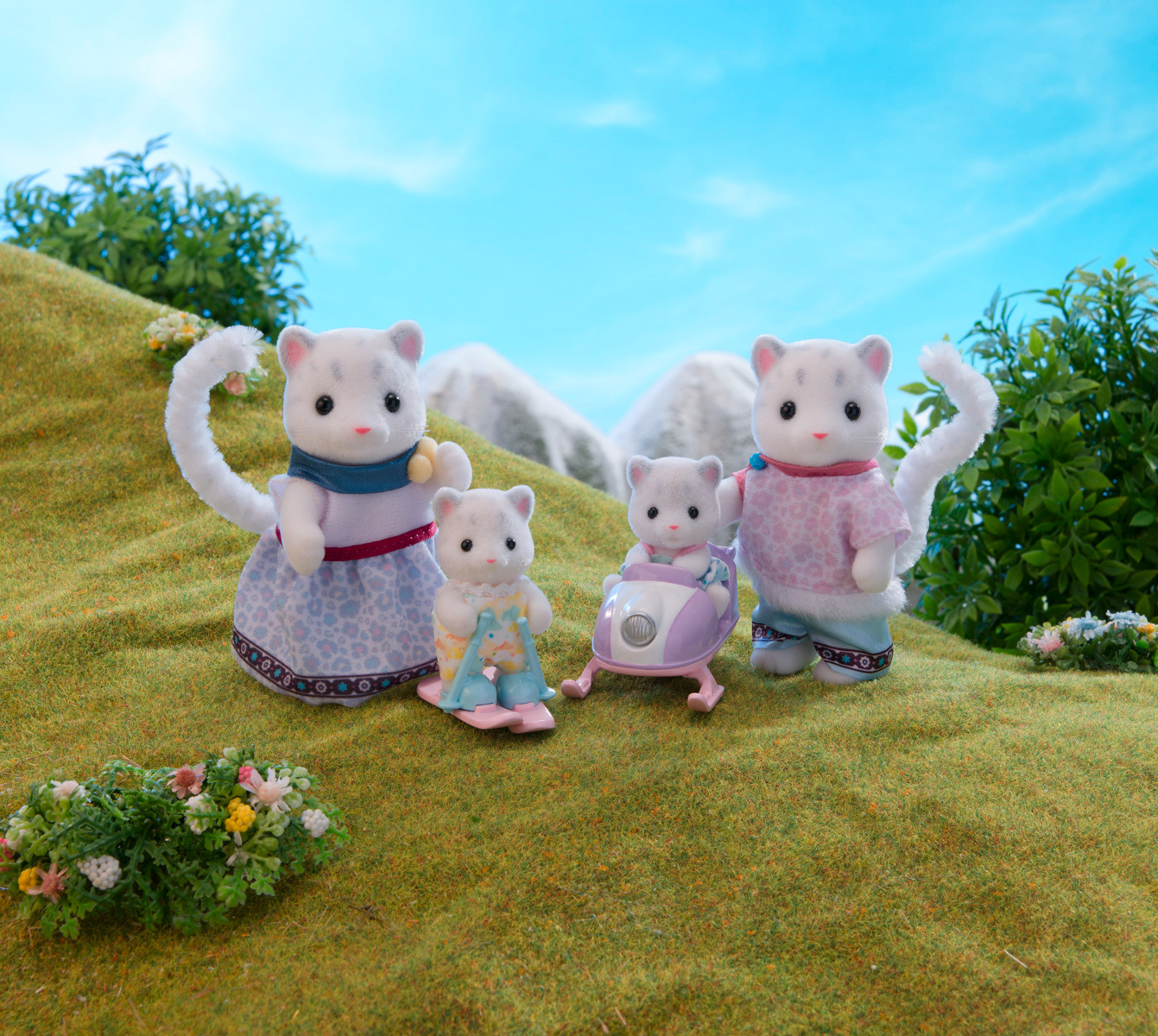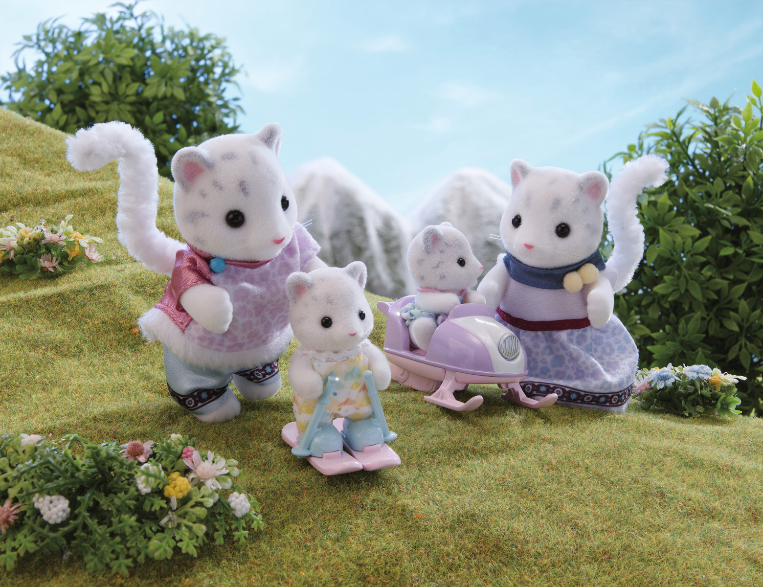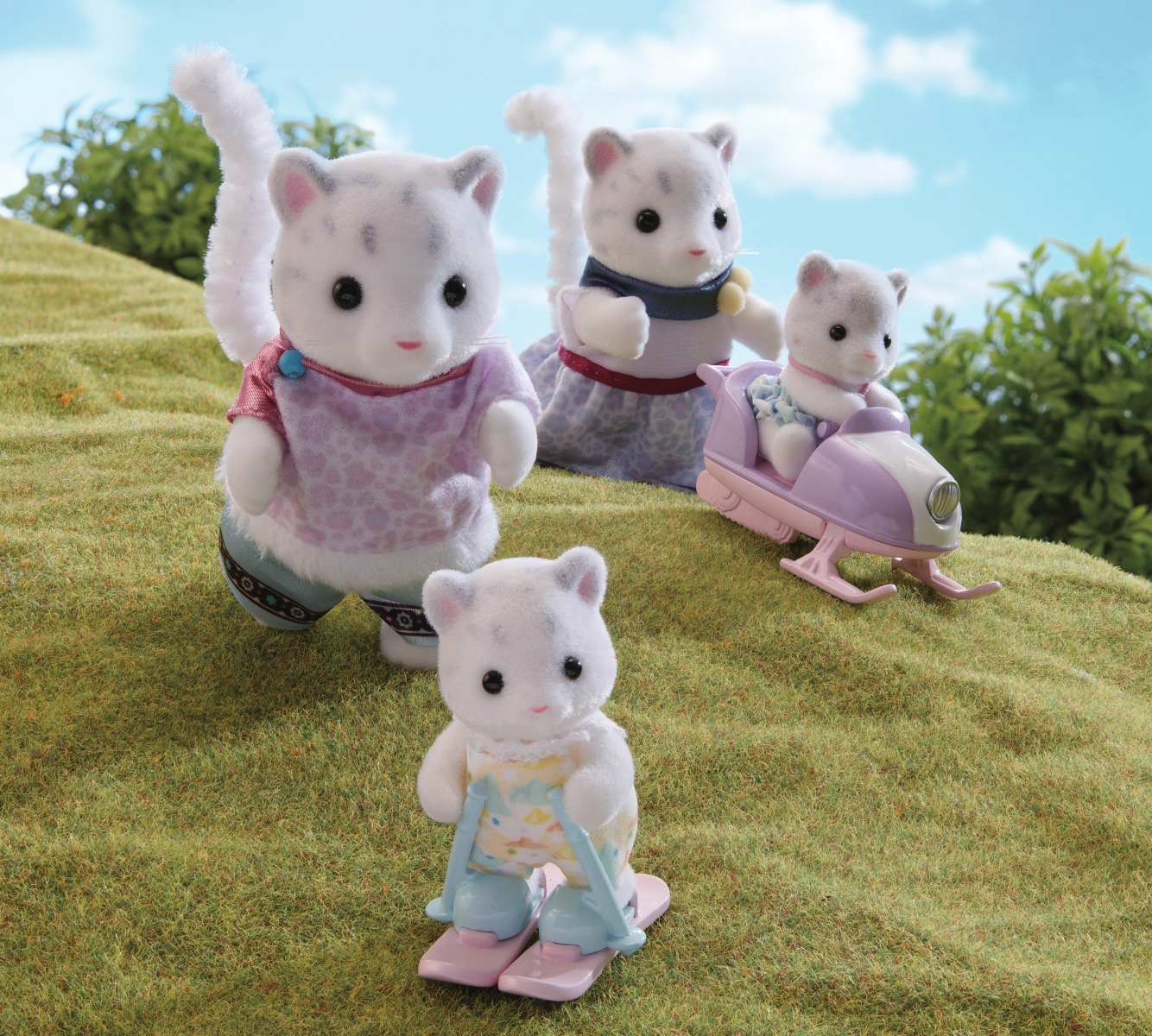 Poznejte rodinu sněžných levhartů Sylvanian Families. Sada obsahuje 4 roztomilé figurky rodiny sněžných levhartů pokryté měkkým semišem. Tato sada obsahuje tatínka, maminku, dvě dcery a doplňky v podobě sněžného skútru a jednoho páru lyží. Rodiče sněžných levhartů mají charakteristický dlouhý ocas. Celá rodinka má oblečení v jemných pastelových barvách. Táta Gerald miluje rybaření u jezera Kira a zároveň se rád dívá na hory.