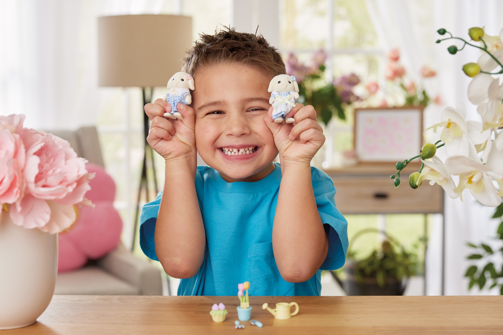 Květinový set Flora Rabbit obsahuje roztomilé figurky holčičky a chlapečka z rodiny Flora Rabbit s padajícími oušky a zahradní doplňky. Děti milují květiny. Sada obsahuje tulipány, lopatku a konev a další doplňky pro péči o květiny. Kytičky na uších figurek lze vyměnit. Na uši chlapce a dívky můžete umístit jednu ze čtyř květin. Květiny lze umístit i do květináče. Děti Flora Rabbit se oblékají do stylových kostkovaných oblečků. Alice, dívka z rodiny Flora Rabbit, miluje prohlížení knih s obrázky rostlin rostoucích v zemi Sylvanian Families. Často tráví čas prohlížením alb s obrázky květinse svým přítelem Haydenem, chlapcem z rodiny Huskyho pejsků. Obvykle je velmi opatrná a mluví pomalu, ale když vypráví o květinách, slova jí vyletí z úst, aniž by si to pamatovala. Lennon, chlapec z rodiny Flora Rabbit, je tak trochu neohrabaný. Práce na zahradě ho natolik pohltí, že se mu stane, že zalévá prázdné květináče, ve kterých ještě nejsou ani semínka! Sadu lze kombinovat s rodinou Flora Ra