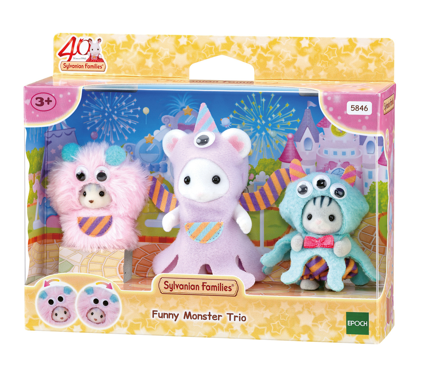 Vydejte se do zábavního parku Sylvanian na přehlídku kostýmů. Oblečeni do vtipných kostýmů speciálně pro tuto příležitost, baby Marshmallow myška Katherine, má na sobě fialový kostým mimozemšťana, baby šedý kocourek Ashton Harvey, je tříoká chobotnice a baby husky Linnea, je chlupaté růžové monstrum. Každý kostým má zábavné pohyblivé oči. Hračky Sylvanian Families rozvíjejí představivost a povzbuzují děti k hraní rolí. Hra s figurkami rozvíjí kreativitu a učí emocím vytvářením a vyprávěním příběhů založených na každodenních zážitcích a pozorování světa. Vyznačují se nejvyšší kvalitou a výjimečným důrazem na detaily. Figurky Sylvanian Families jsou pokryté měkkým semišem, mají pohyblivé končetiny a hlavu. Oblečení lze z figurek sundat a vyměnit za jiný outfit. Baleno v krabičce. Rozměry balení: 13 x 16 x 4,5 cm. Věk: 3+