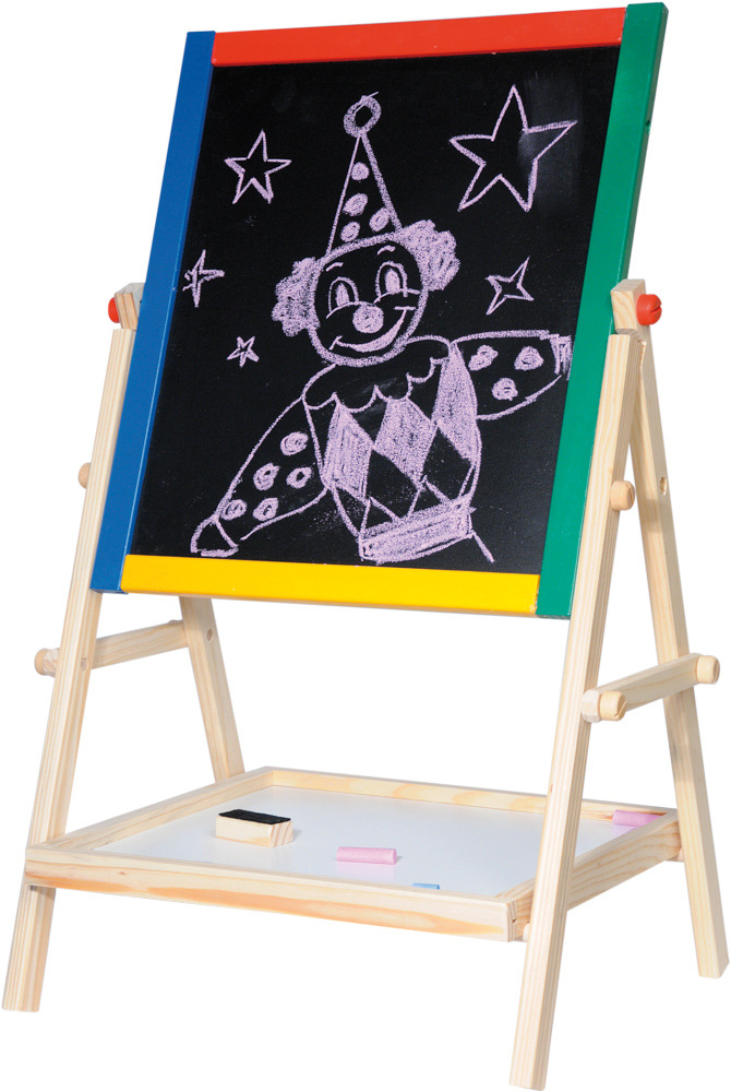 Tato dřevěná tabule je oboustranná. Jedna strana je bílá pro psaní suchými fixy a druhá černá pro klasické křídy. Bílá strana je vyrobena z kovového plechu, takže na ní drží magnetky. Plocha na kreslení má rozměry 30 x 35 cm a celková výška tabule je 65 cm. | Věk: 3+ | Rozměry: 41 x 65 x 33 cm