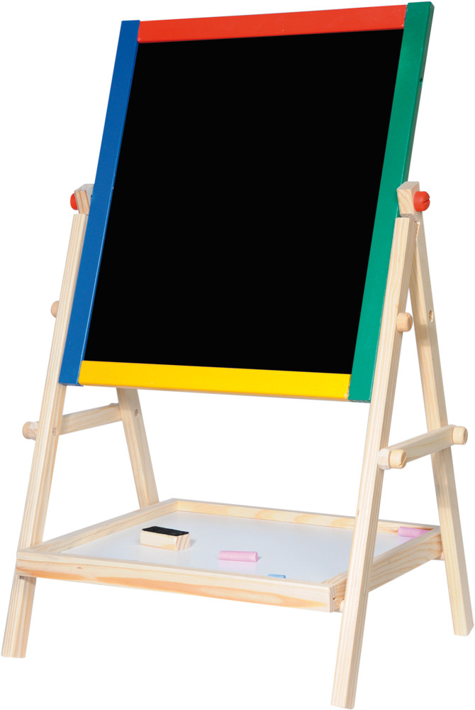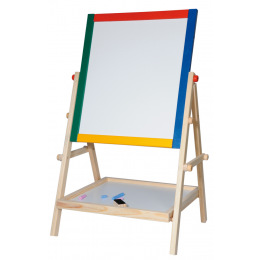 Oboustranná tabule s nastavitelnou výškou. Z jedné strany je zelená plocha pro psaní křídami, z druhé bílá magnetická plocha pro psaní fixou. Nad tabulí je do konstrukce zabudovaná tyčka pro upevnění role papíru, který lze odvíjet a malovat na ploše, kterou poskytují desky tabulí. Obsahuje magnetická písmena, bílé křídy, fix, houbičku a kelímky na vodu a barvy. Obsahuje: 31 dílků. Rozměr: 59 x 57 x výška 111-129 cm. Spodní hrana kreslící plochy: 60-77cm. Rozměr balení: 56,5 x 9 x 71,5 cm. Věk: 3+