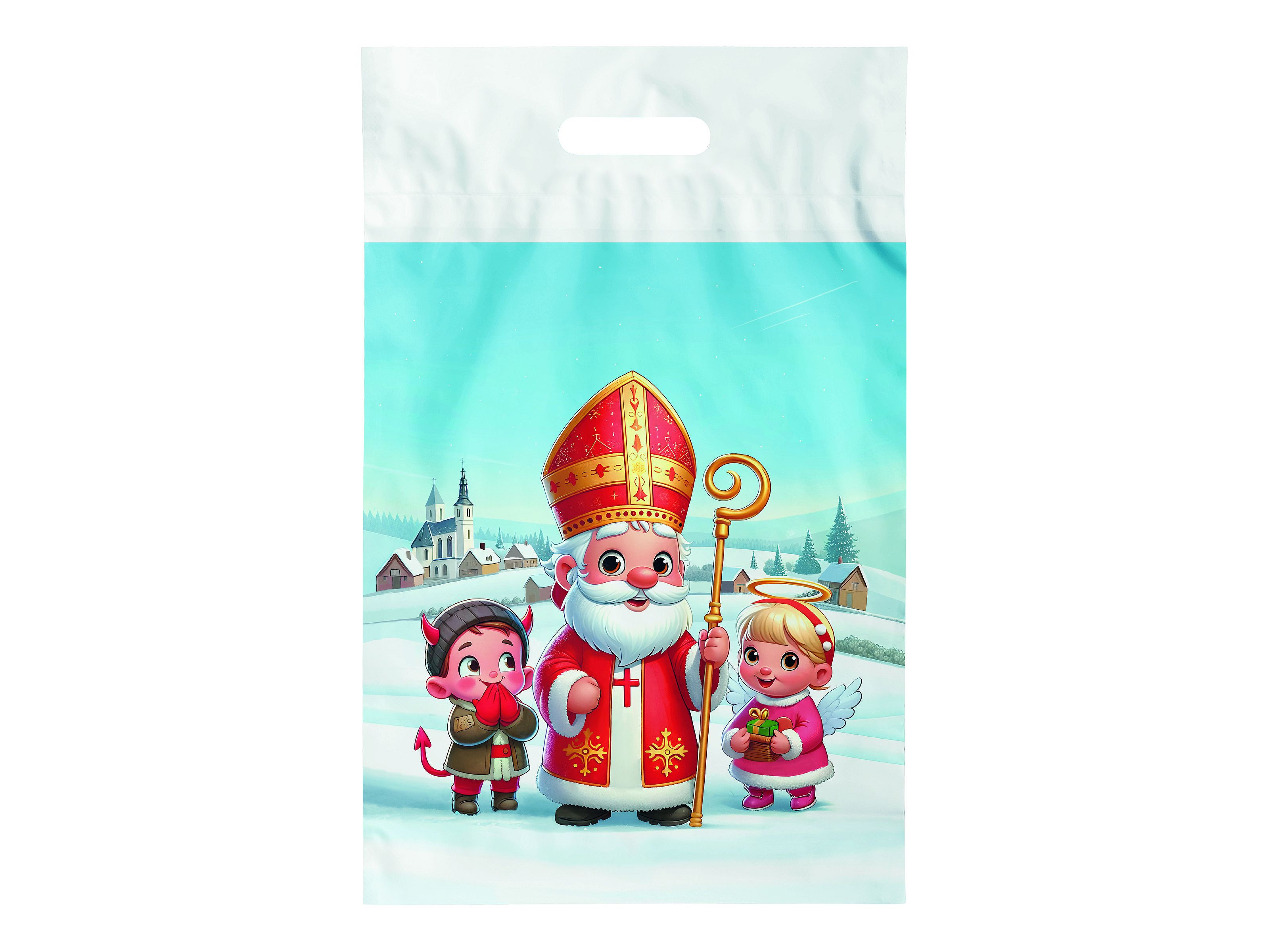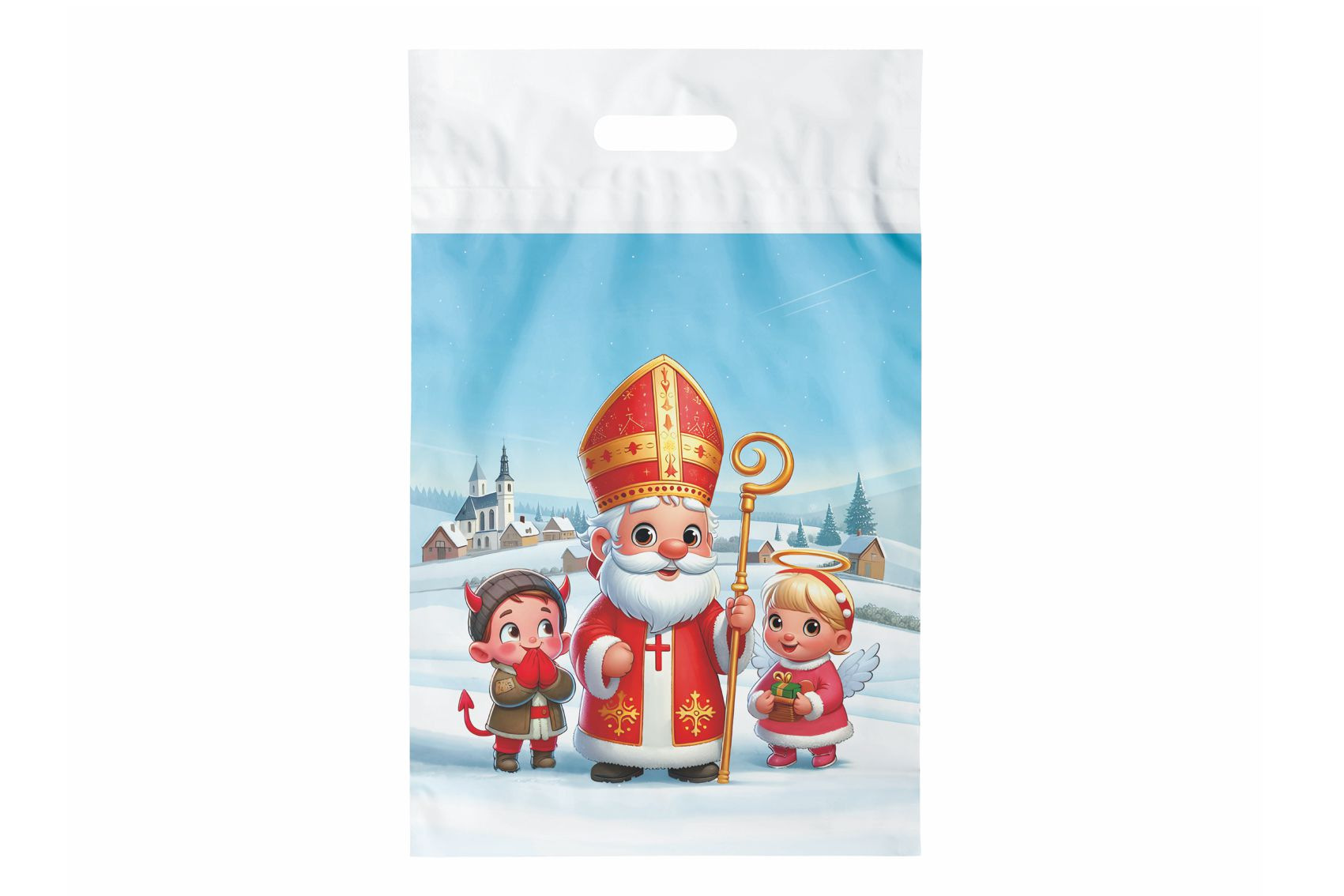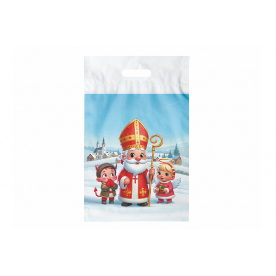 Igelitová taška s průhmatem a barevným mikulášským motivem. Je ideální pro různé typy dárků, od malých sladkostí a hraček až po větší předměty. Na tašce je obrázek Mikuláše, anděla a čerta. Taška je vybavena průhmatem, což je otvor v horní části tašky, který slouží jako rukojeť. Tento průhmat umožňuje snadné a pohodlné přenášení tašky. Díky pevnému plastovému materiálu je taška odolná proti roztržení a vlhkosti, čímž zajišťuje, že dárky uvnitř zůstanou v bezpečí a suchu.