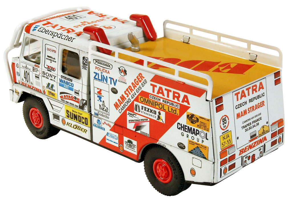 Model soutěžního automobilu - nejslavnější a vítězné Tatry 815 Rallye Paris-Dakar-Paris z roku 1994 (startovní číslo 401) je vyroben z potištěného plechu v měřítku 1:43. Délka modelu je 16 cm Vhodné od 3 let