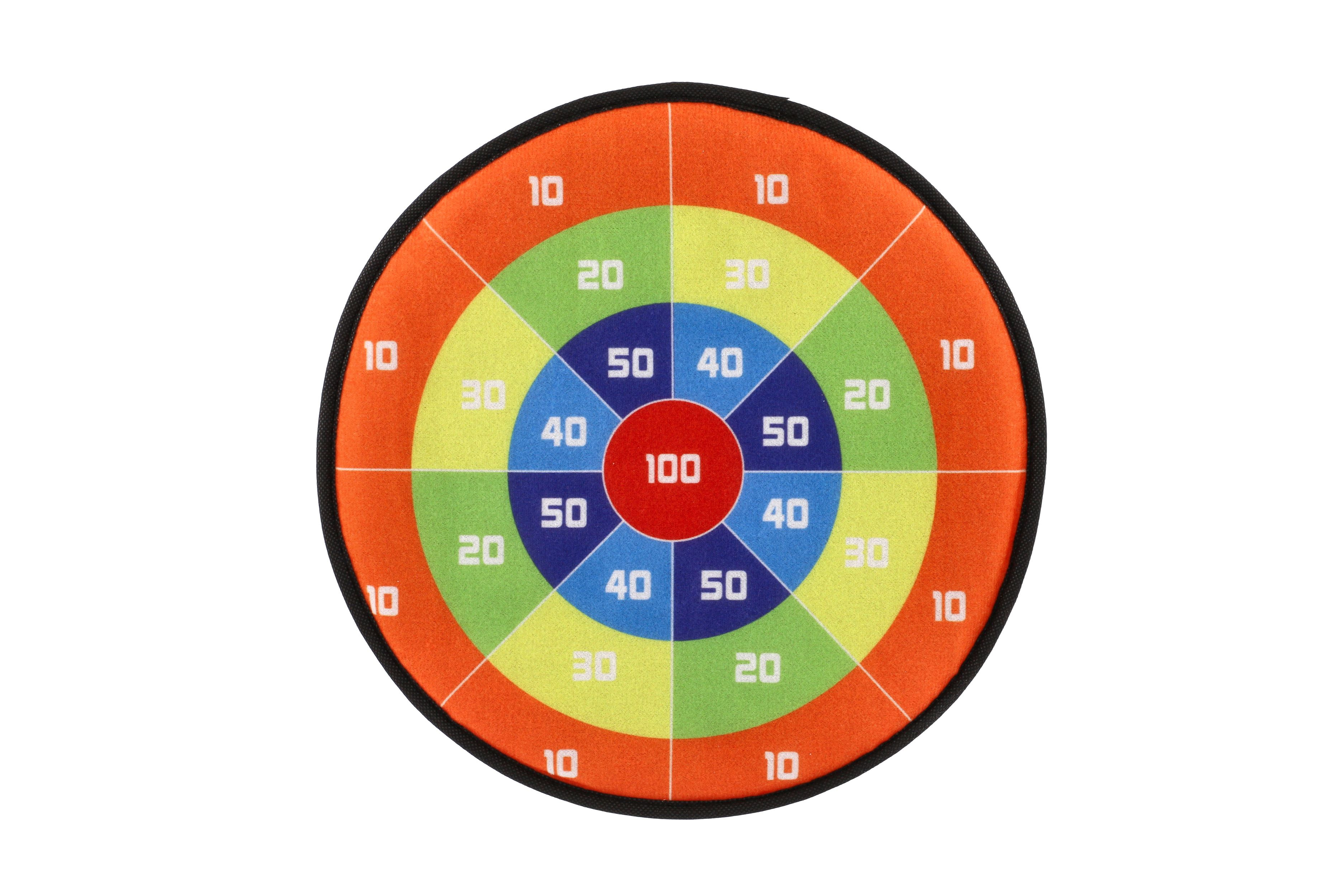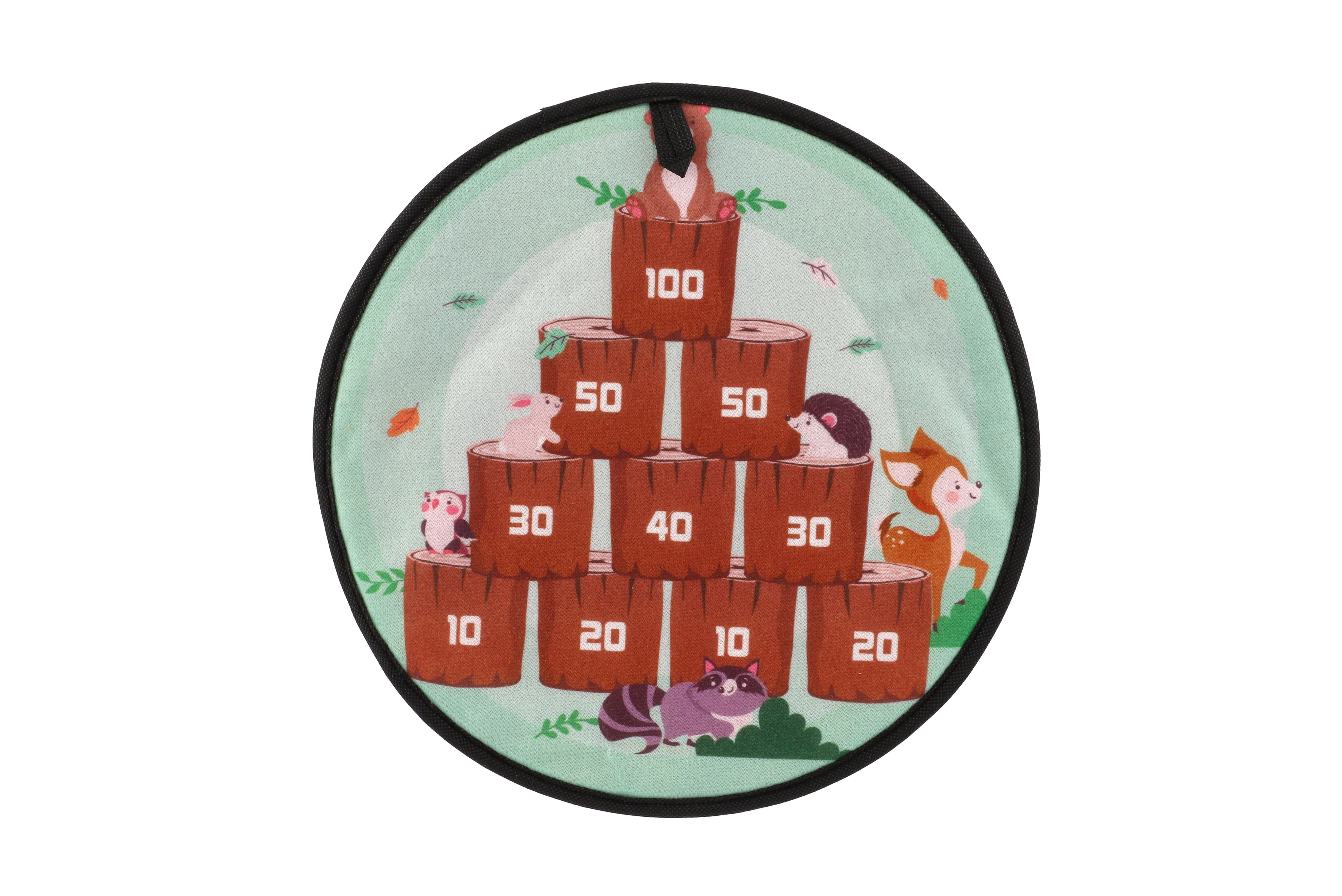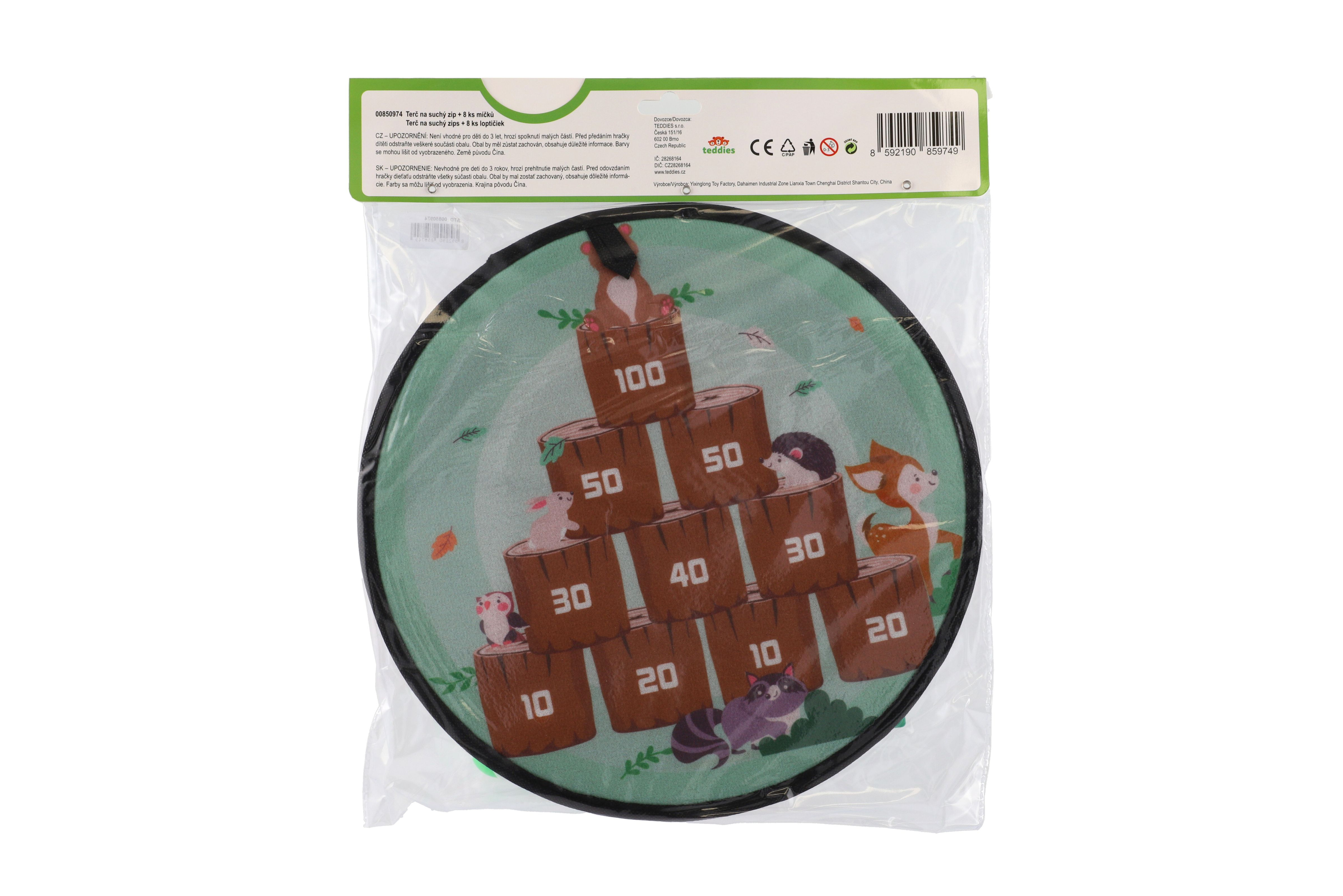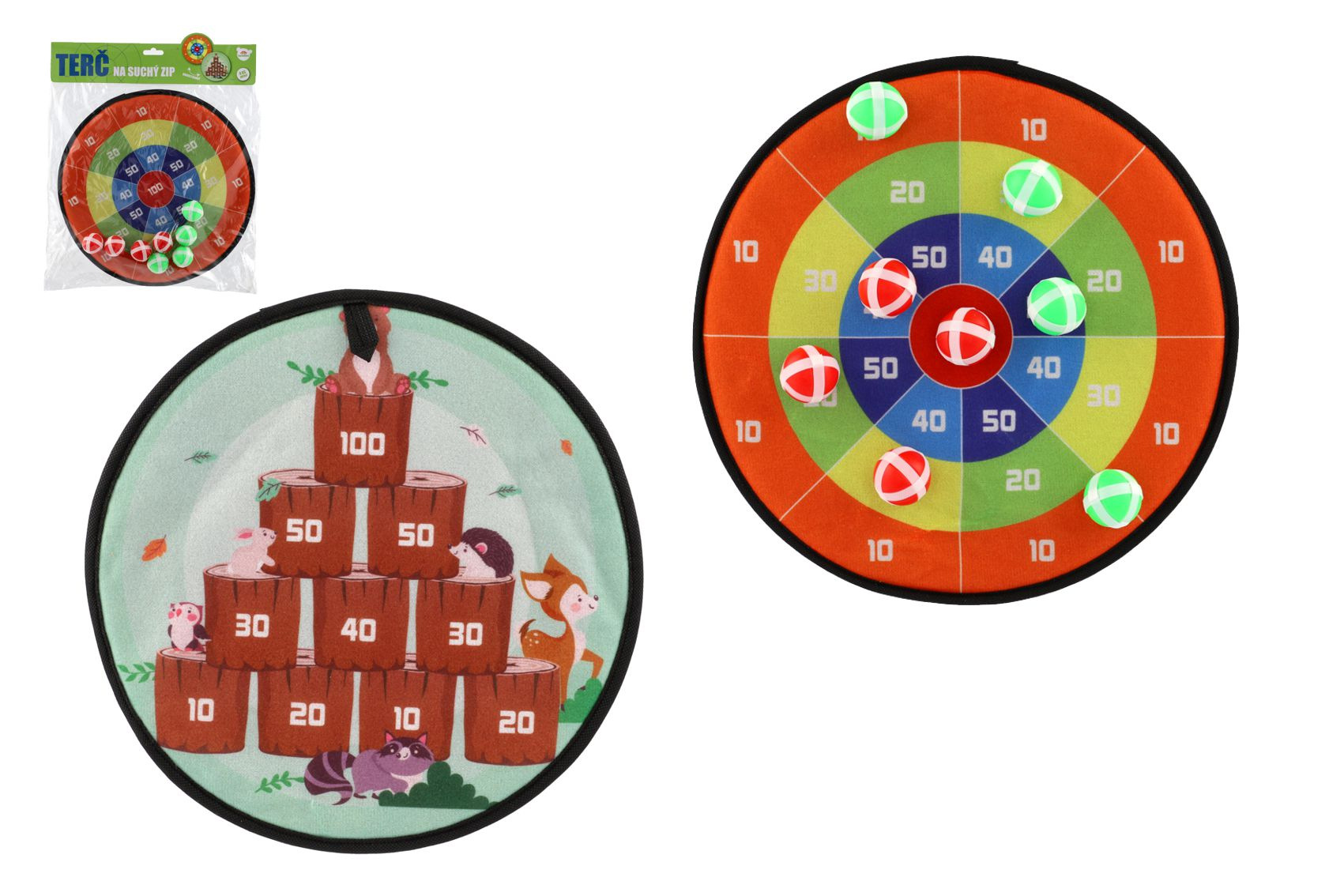 Terč na suchý zip dostane kluky i holky. Je to veselá hra, při které se vaše děti naučí mířit a házet . Nechte vaše děti soupeřit mezi sebou. Cílem hry je hodit co největší čísla. Jejich sčítáním se děti procvičí i v matematice. Terč na suchý zip má dva designy. Jedna strana terče je barevná s čísly, druhá je v motivu zvířátek v lese. Terč má očko na zavěšení. Balení obsahuje: Terč na suchý zip oboustranný + 8 ks míčků se suchým zipem. Průměr terče: 34 cm Vhodné pro děti od 3 let