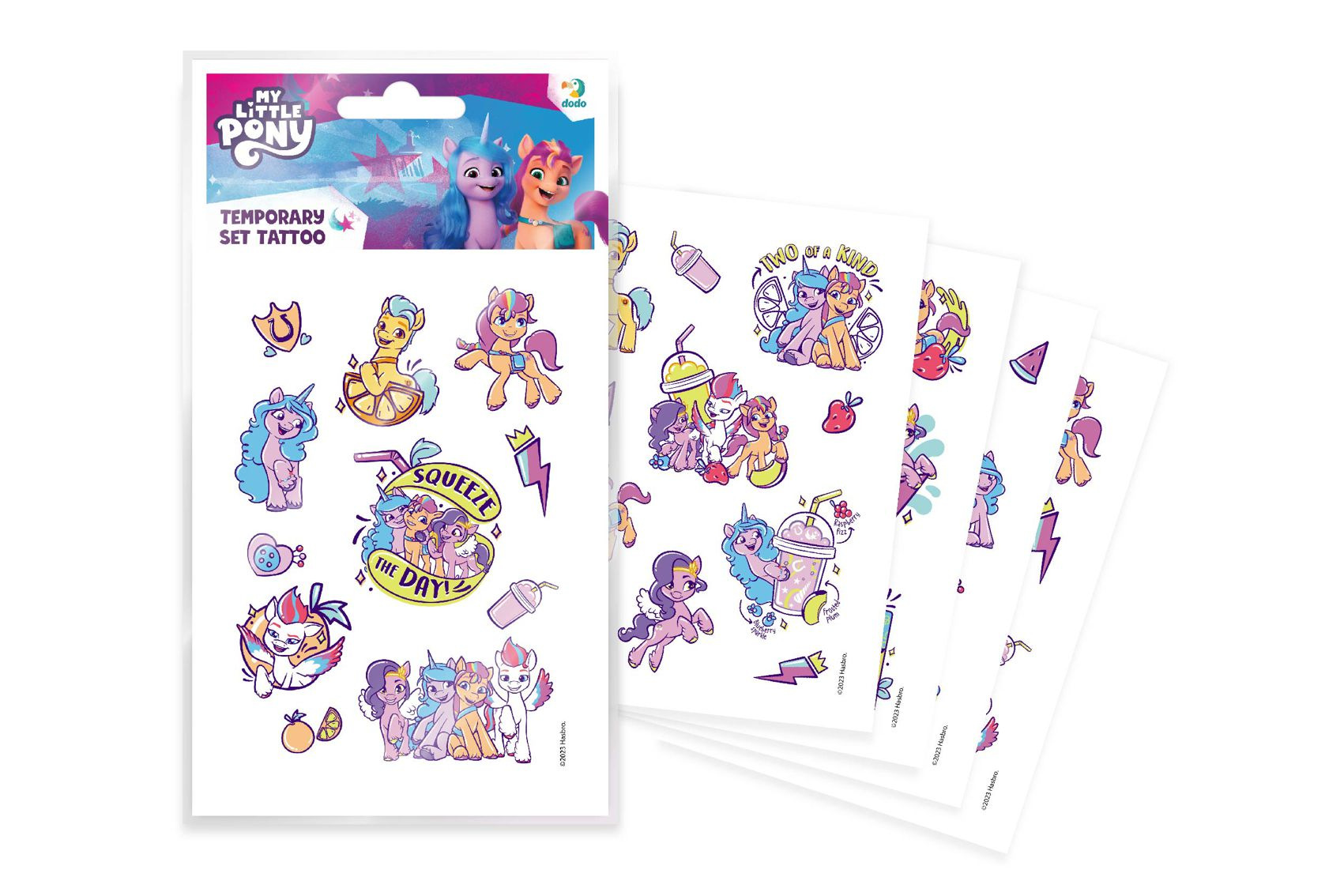 Tetování s motivem My Little Ponny. Vyber si obrázek, nalep na místo, kde ho chceš mít, jemně potři vodou, sloupni papírek a je to! Rozměr obalu: 10,5 x 15 cm Vhodné pro děti od 3 let