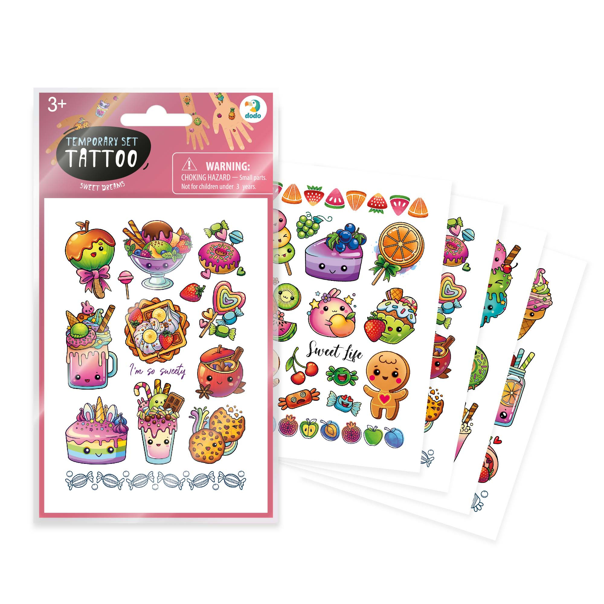 Ozdobte si své tělo krásným barevným tetováním. Vystřihněte vybraný obrázek. Přitiskněte ho na čistou a suchou pokožku Navlhčete ho vodou a po 30ti sekundách odstraňte papírek. Tetování lze odstranit mýdlem nebo olejíčkem. Vybrat si můžete z několika motivů oblíbených cukrovinek. Obsahuje 4 listy tetovaček. Rozměry balení 11,5 x 20 x 0,01 cm. Vhodné pro děti od 3 let.