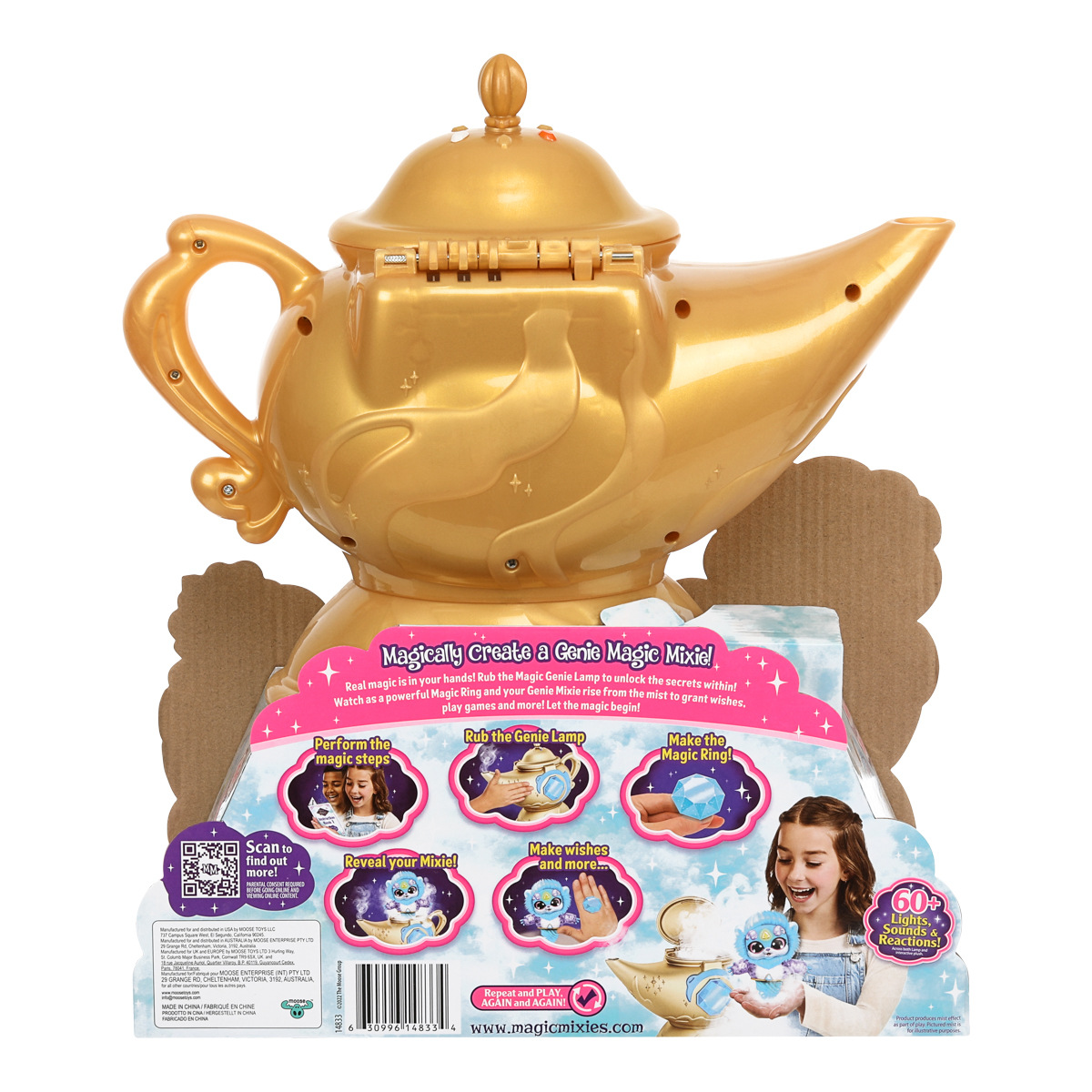 "Skutečná kouzla se vrátila v podobě kouzelné lampy Magic Mixies! Uvnitř této tajemné zlaté kouzelné lampy se skrývá džin Mixie, který čeká na vypuštění! Je čas, aby vaše dítě provedlo kouzelné kroky a vytvořilo skutečné kouzlo z této funkcemi nabité kouzelné mlžící lampy s džinem s více než 60 různými světly, zvuky a reakcemi. Nejprve musí probudit džina a vytvořit kouzelný prsten, který je v něm ukrytý. Jakmile dítě lampu potře, začne z výlevky proudit skutečná kouzelná mlha a její drahokam se rozsvítí! Děti si zamilují interakci s hravým džinem Mixie, když budou objevovat a odkrývat tajemství lampy. Po splnění všech úkolů se modrý džin Mixie kouzelně vynoří z lampy! Vyjměte si roztomilého interaktivního plyšového džina! Kouzlo a zábava teprve začínají. Po vyjmutí džina Mixieho z lampy mohou děti použít kouzelný prsten a komunikovat se svým Mixiem. Jakmile dítě svého džina pojmenuje, může si hrát pomocí 3 různých režimů džina - režim plnění přání, režim hraní a režim povídání. Pomocí