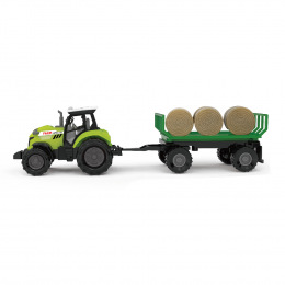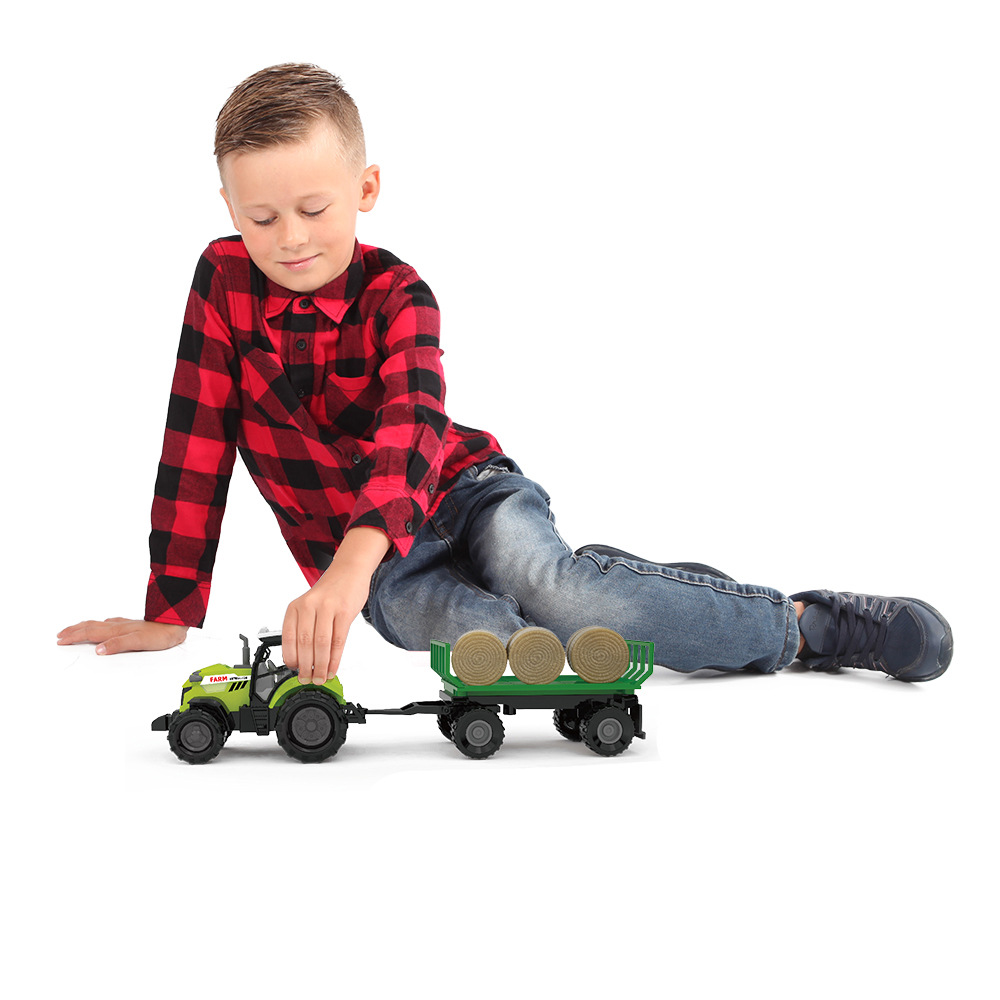 Moderní plastový farmářský traktor s vlečkou a balíky slámy, hračka z kolekce Moje malá farma. Vlečka se dá jednoduše odpojit a balíky sundat. Traktor jezdí na volný chod a jeho délka je 10 cm. Přívěs je v délce 12 cm, celková délka včetně přívěsu je 25 cm. Zmáčknutím tlačítka na traktoru vydává reálné zvuky spolu se světelným efektem. Traktor vyžaduje 3 ks baterií typu AG13/LR44, které jsou součástí balení.