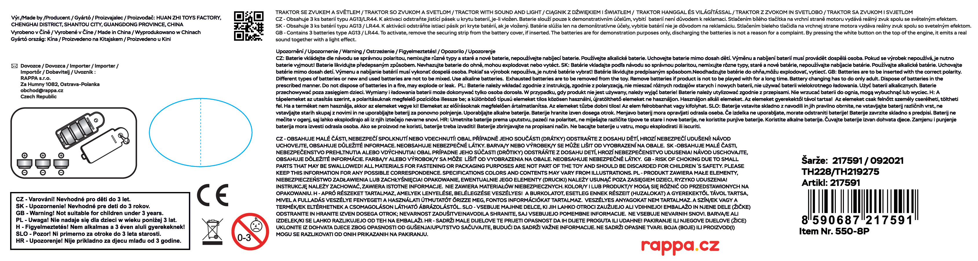 Moderní plastový farmářský traktor s vlečkou, hračka z kolekce Moje malá farma. Vlečka se dá jednoduše odpojit a otevřít. Traktor jezdí na volný chod a jeho délka je 10 cm. Přívěs je v délce 11 cm, celková délka včetně přívěsu je 25 cm. Zmáčknutím tlačítka na traktoru vydává reálné zvuky spolu se světelným efektem. Traktor vyžaduje 3 ks baterií typu AG13/LR44, které jsou součástí balení.