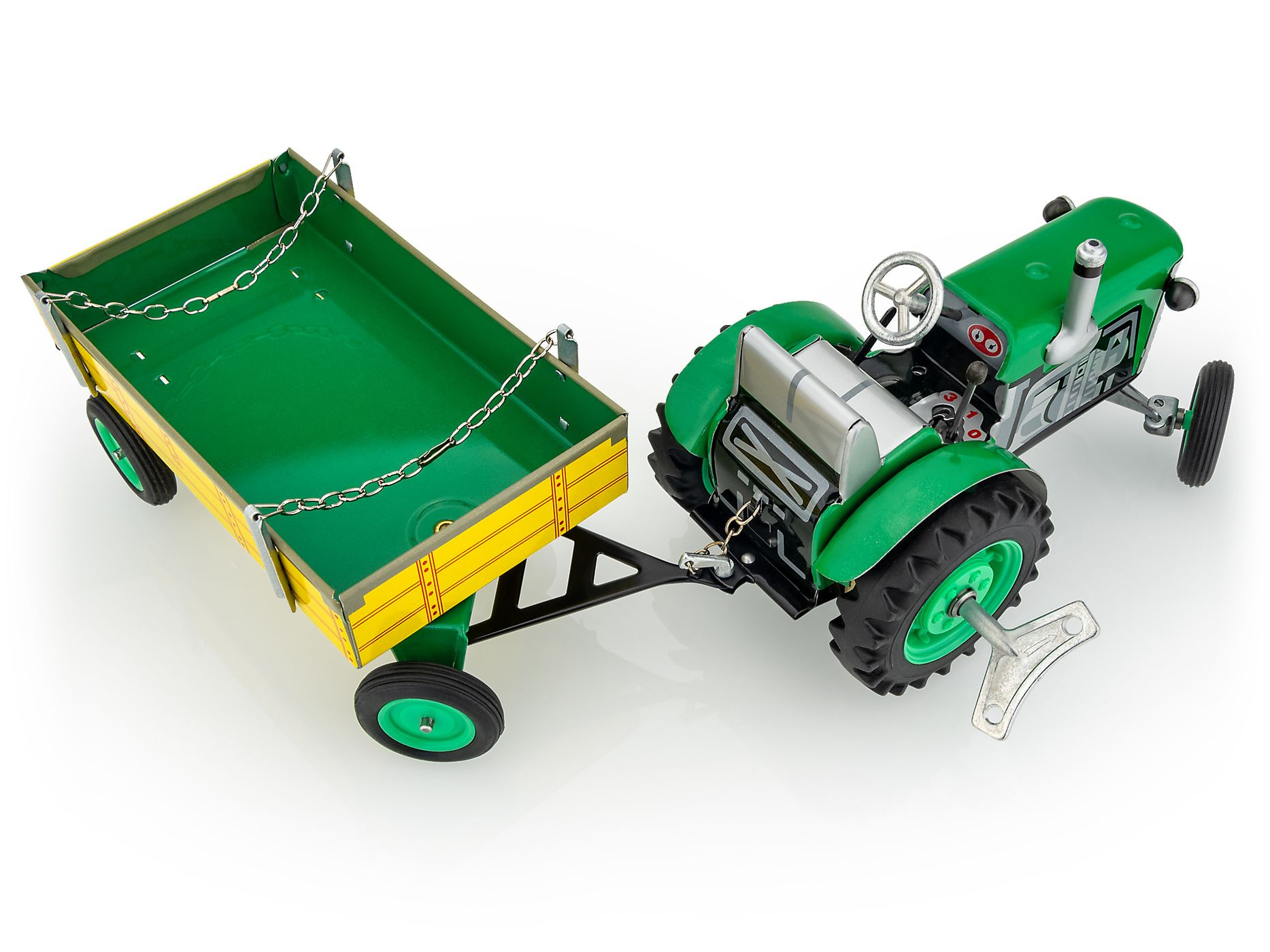 Traktor Zetor s valníkem zelený od značky Kovap. Pohyb traktoru zajišťuje unikátní pérový strojek natahovaný klíčkem. Funkční převodovka má tři rychlosti dopředu a zpátečku. Traktor lze volantem skutečně řídit a navíc ho i zabrzdit ruční brzdou. Měřítko 1:25. Rozměry balení 30 x 9 x 9 cm. Vhodné pro děti od 3 let.