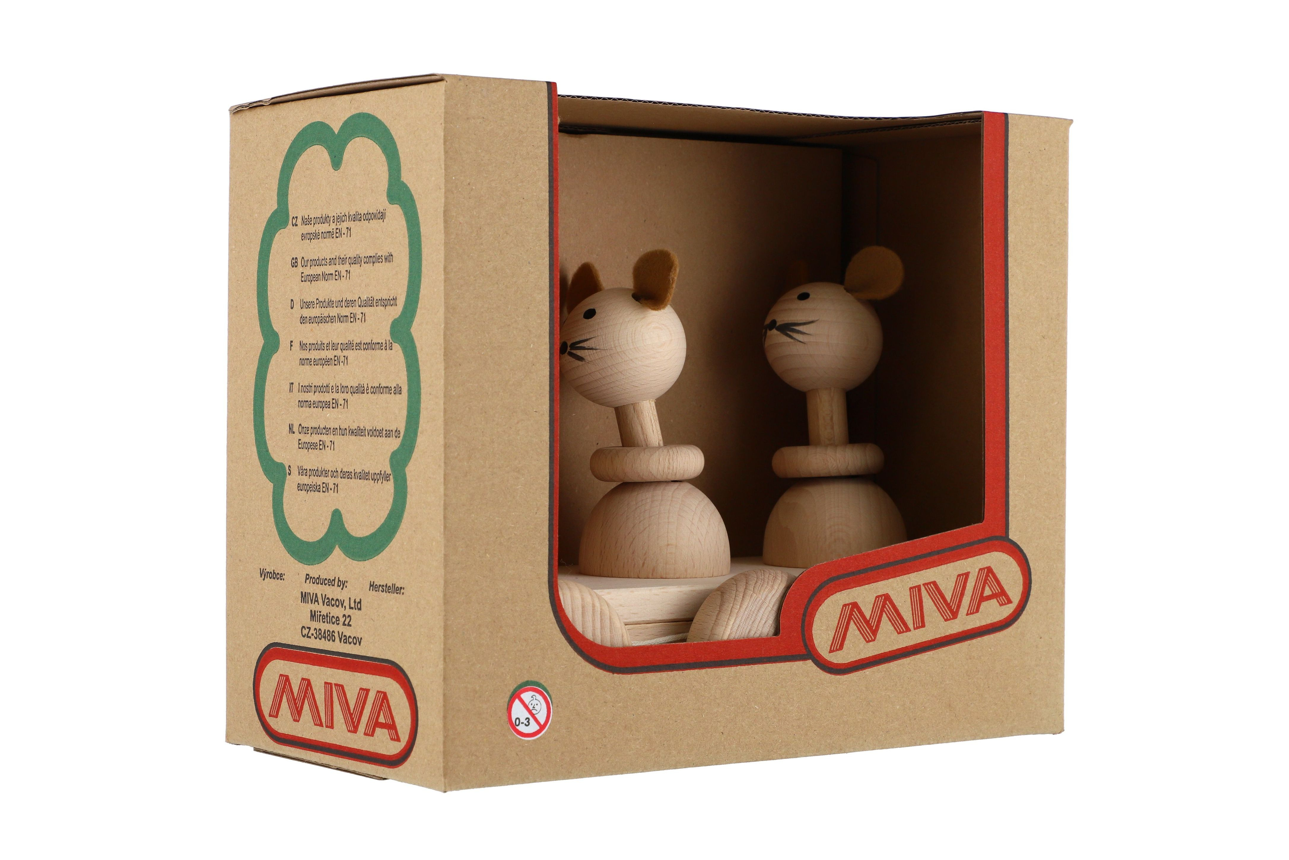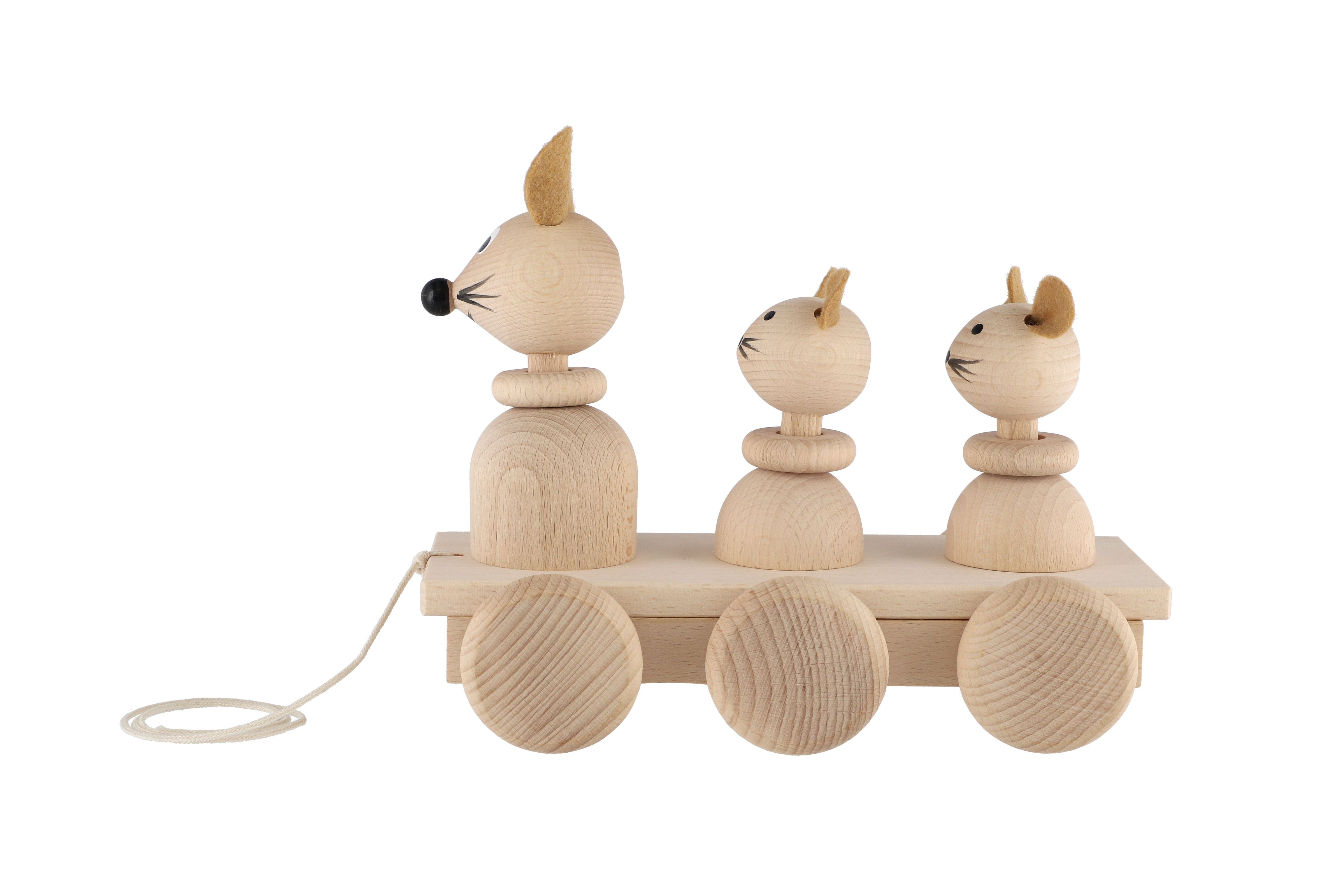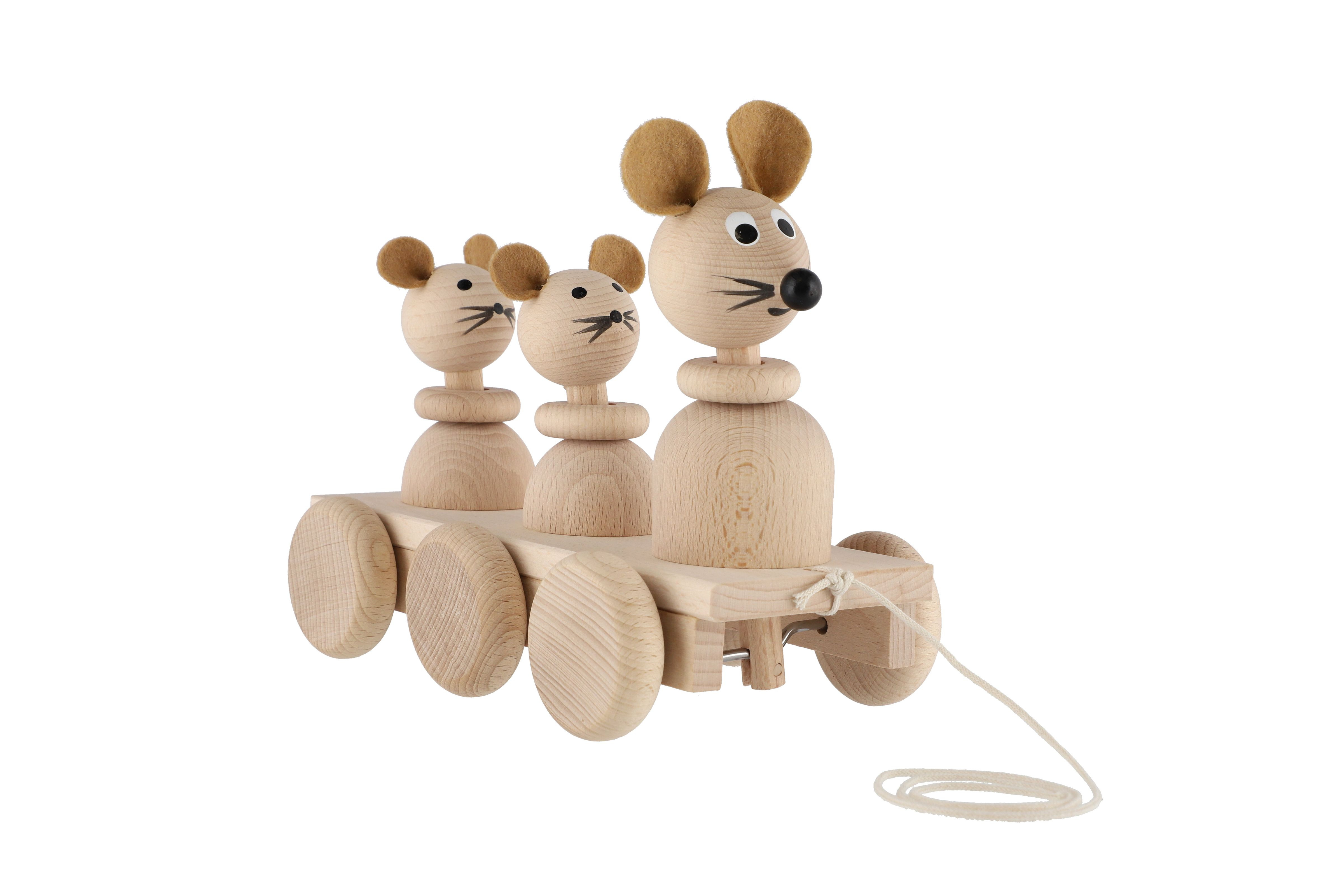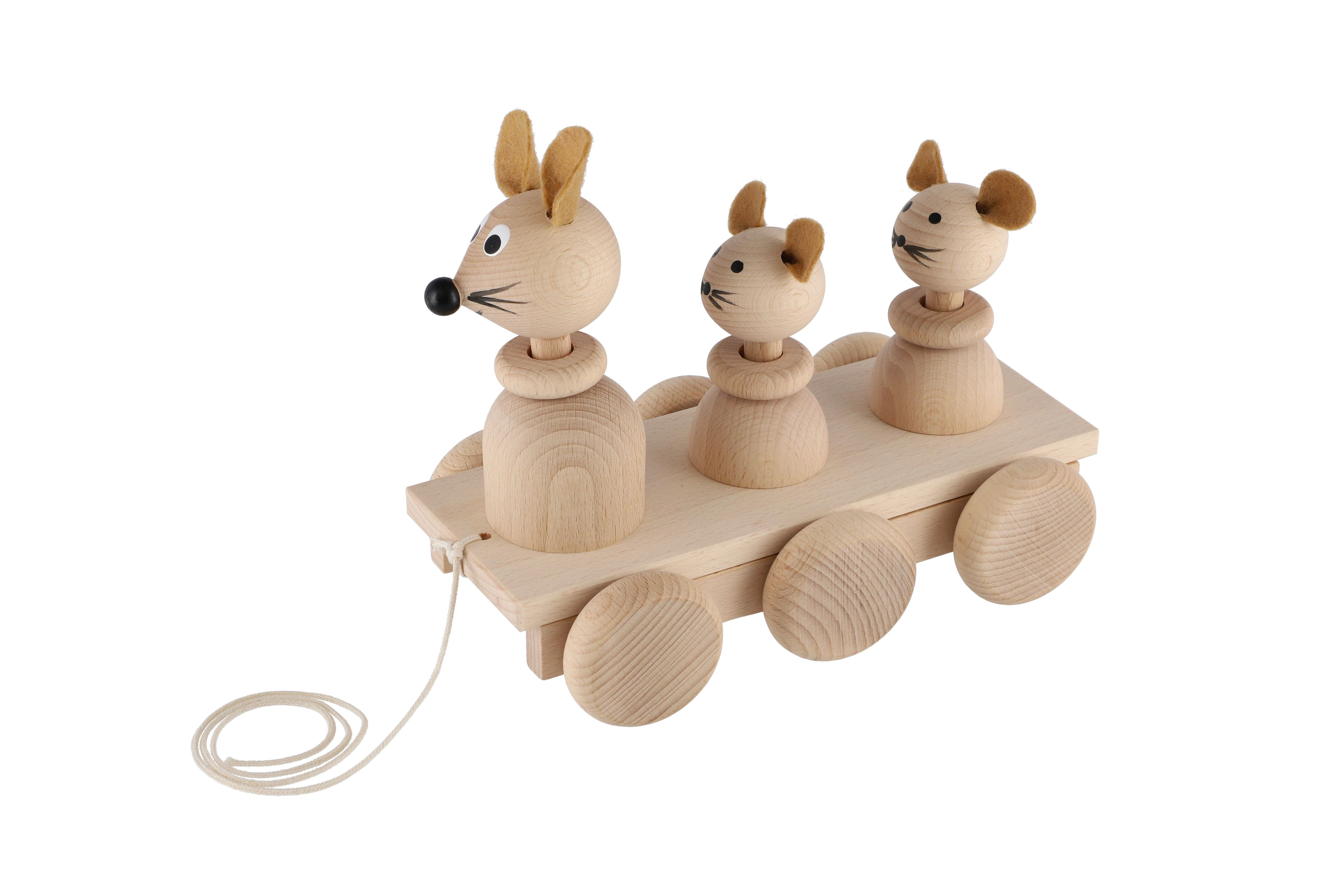 Tři myšky tahací přírodní dřevo 22cm v krabici 22x18x12cm