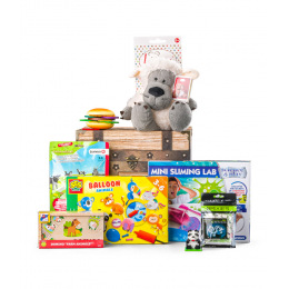Truhla obsahuje celé spektrum zábavy pro kluky: montování, stavění, hru s vláčky, dobývání dinosaura i plyšové mazlení.