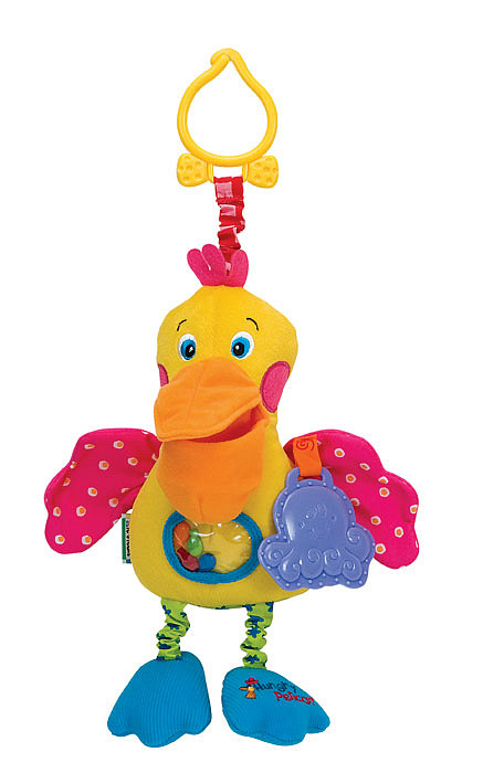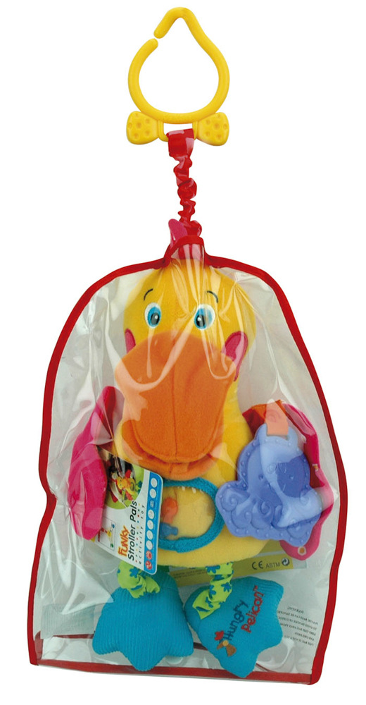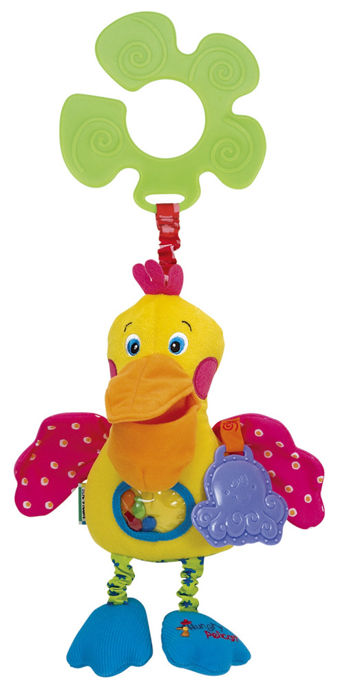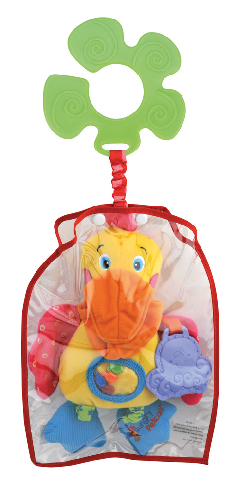 Pelikán k zavěšení na kočárek nebo postýlku je vhodný již od raného dětství, kdy díky tomu, že je ušitý z různých materiálů, podporuje vizuální hmatové i sluchové vjemy dítka. Při pohmatu šustí a chrastí a zároven dítě vnímá hmatem různé typy povrchů.