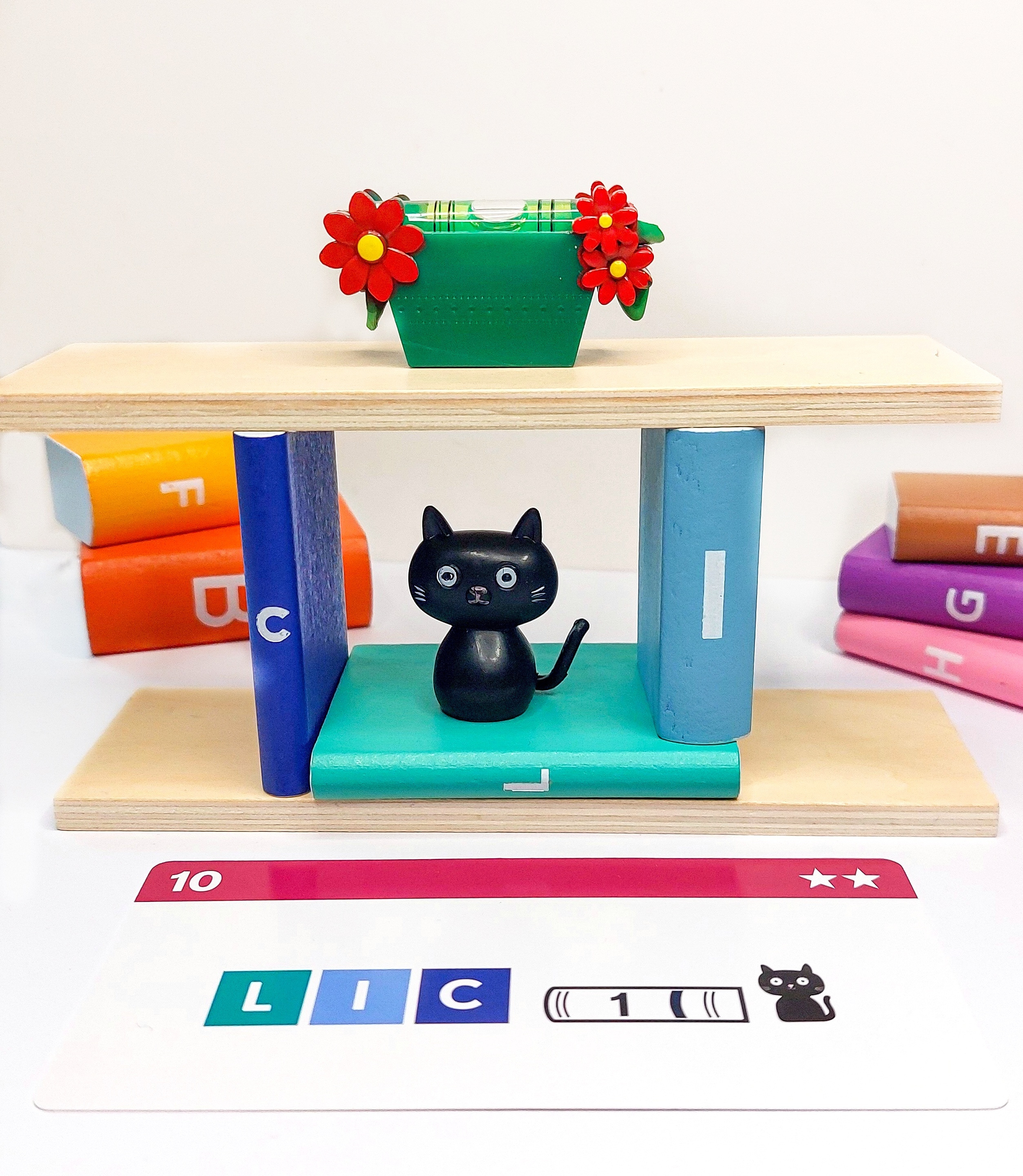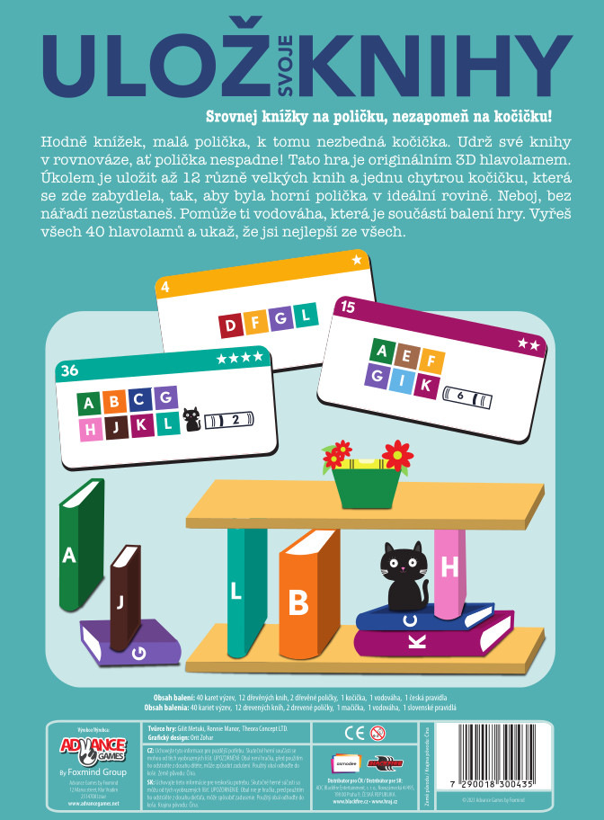 Srovnej knížky na poličku, nezapomeň na kočičku! Hodně knížek, malá polička, k tomu nezbedná kočička. Udrž své knihy v rovnováze, ať polička nespadne! Tato hra je originálním 3D hlavolamem. Úkolem je uložit až 12 různě velkých knih a jednu chytrou kočičku, která se zde zabydlela, tak, aby byla horní polička v ideální rovině. Neboj, bez nářadí nezůstaneš. Pomůže ti vodováha, která je součástí balení hry. Vyřeš všech 40 hlavolamů a ukaž, že jsi nejlepší ze všech.
