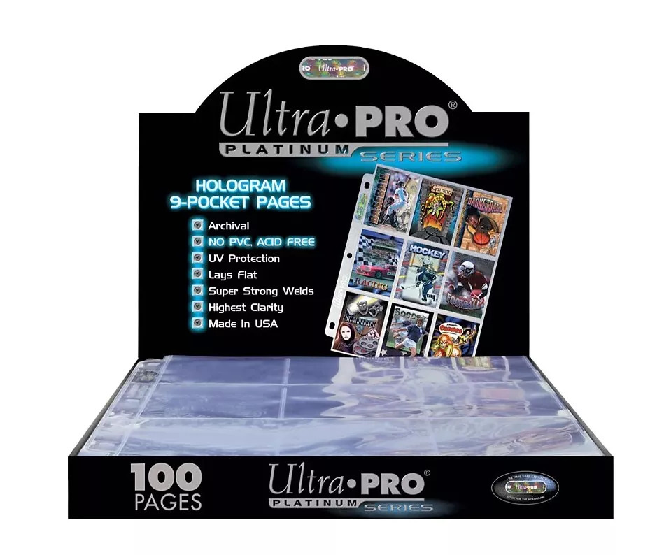 Ultra PRO Platinum Hologram stránkové obaly na 9 karet. Kvalitní stránkové obaly pro archivaci vaší sbírky sběratelských karet a jiných sběratelských předmětů. Stránky obsahují kapsy na 9 karet standartizovaných rozměrech 6,35 x 8,89 cm ( 2-1/2" x 3-1/2"). Stránky jsou na obou stranách průhledné a jsou předlisované 11-dírovým hřbetem pro flexibilní přizpůsobení.