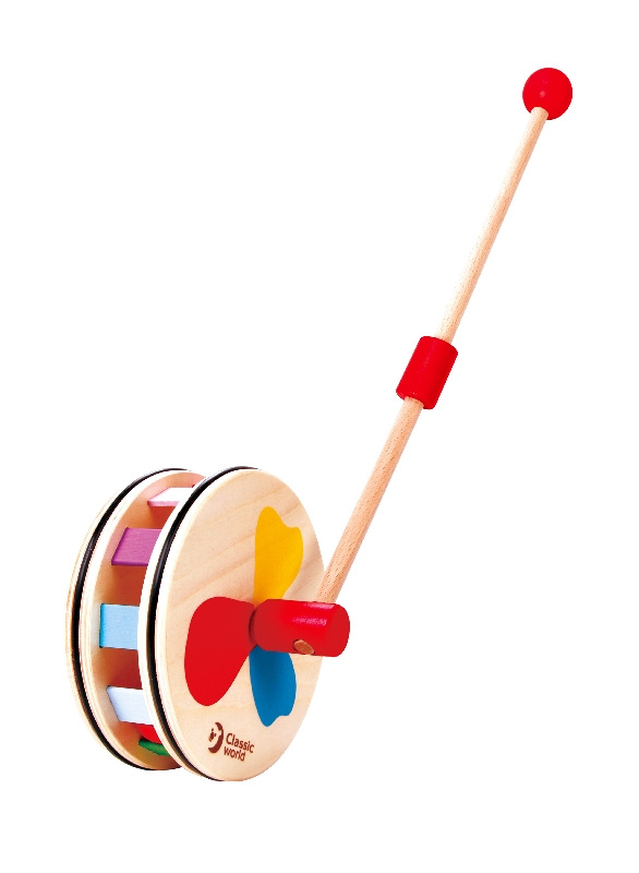 Hračka pro nejmenší v podobě strkadla s duhovým kolečkem s korálky uvnitř. Při jízdě se kolečko točí a díky korálkům uvnitř působí příjemný zvuk. Tím upoutá pozornost dítěte a stimuluje ho k dalšímu pohybu. Sestavení hračky musí provádět dospělá osoba.