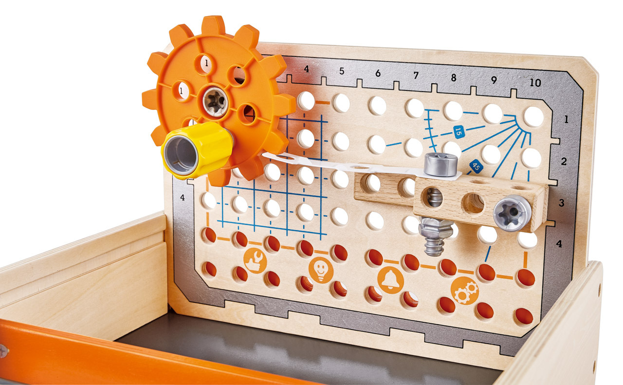 Tak toto je pracovní stůl pro opravdové profesionály! Regály a úložné prostory udržují veškeré nářadí v dosahu dětí. Hračka obsahuje nářadí, spojovací materiál, zádový díl pro ukotvení šroubků, celkem 40 dílků. Veselé barevné provedení. Každý malý kutil si bude připadat jako v opravdové dílně. Hračka rozvíjí jemné motorické dovednosti, podporuje obratnost a koordinaci rukou a očí. Velikost produktu: 55x28x81cm. Věková kategorie: 3y+.
