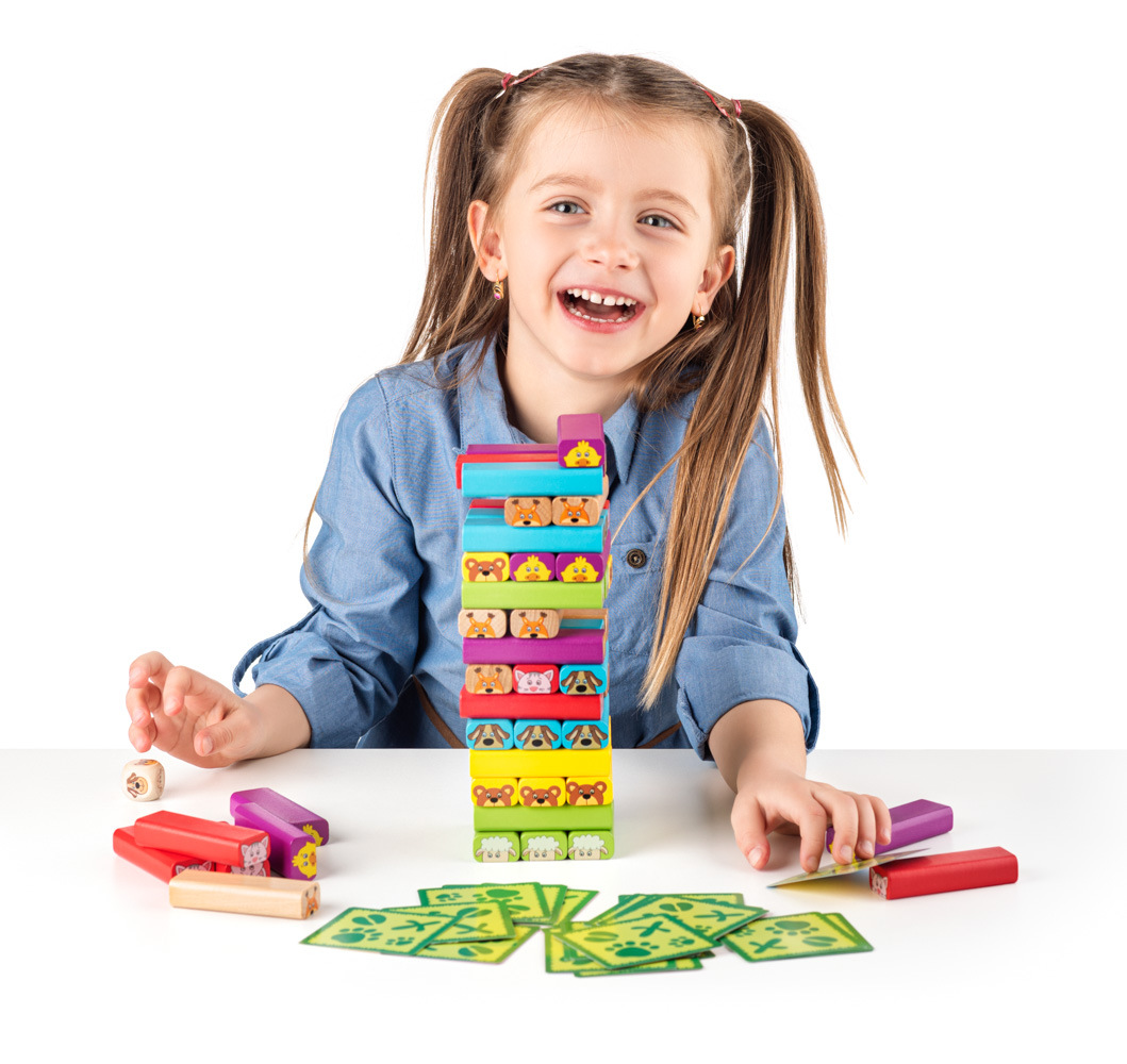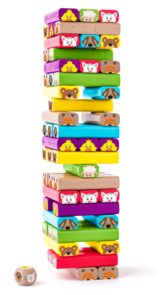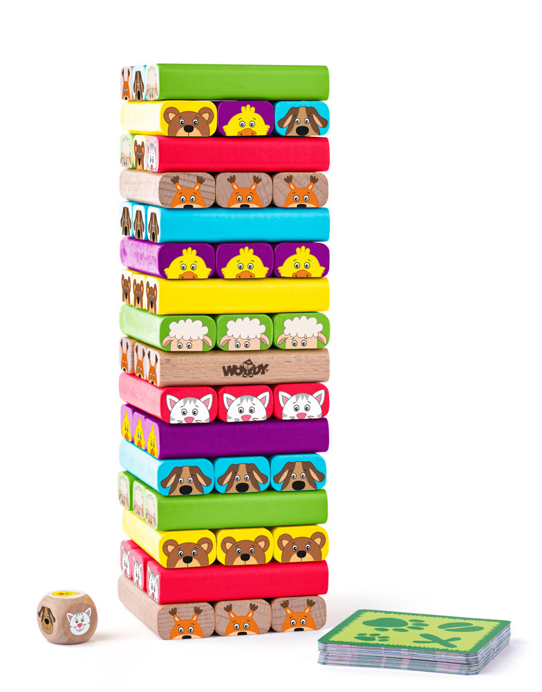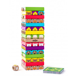 Napínavá hra pro celou rodinu. Hráči hází kostkou. Každé kolo postupně vytahují z věže hrací kameny s tím zvířátkem, které jim padne na hrací kostce. Kámen, který vytáhnou, položí navrch věže tak, aby věž nespadla. Obtížnější variantou je verze, kdy hráči vytahují z věže hrací kameny podle obrázků na kartách. Ty vytahují z hromádky, kterou umístí uprostřed stolu. Na kartách objeví nejen obrázky daných zvířat, ale i jejich siluety nebo obrázek potravy, kterou dané zvíře jí. Musí pak přemýšlet nad tím, kterýpak kámen to mají vlastně vytáhnout. Obsahuje: 49 dřevěných dílků + 24 ks kartiček. Rozměr věže: 23 x 7,5 cm. Rozměr balení: 8,5 x 8 x 27 cm. Věk: 3+
