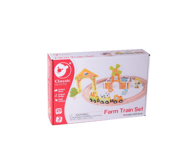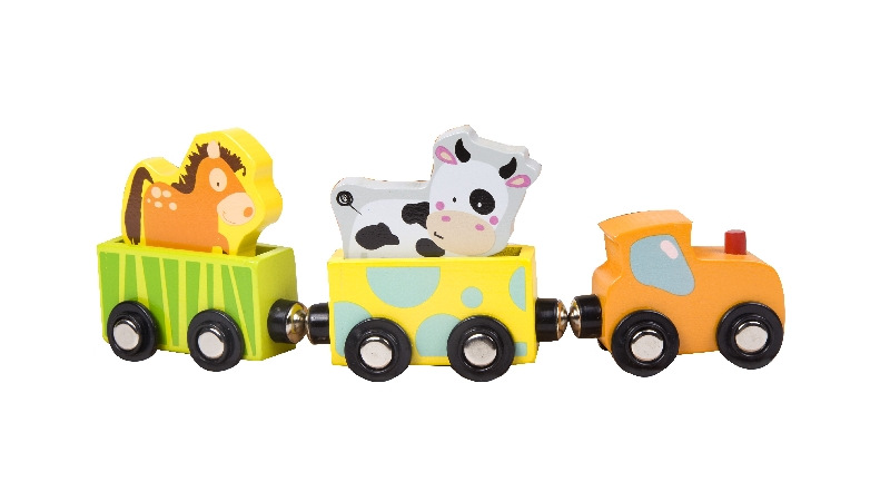 Postav si vláčkodráhu a můžeš ve vláčku vozit zvířátka ze statku. Dřevěná vláčkodráha pro všechny malé milovníky vláčků a zvířátek. Sada obsahuje koleje, mašinku se dvěma vagónky, zvířátka a další doplňky. Pozor! Tato hračka obsahuje magnety nebo magnetické části. Magnety přitahující se k sobě navzájem nebo ke kovovému předmětu uvnitř lidského těla mohou způsobit vážné zranění. V případě spolknutí či vdechnutí magnetů vyhledejte okamžitou lékařskou pomoc.