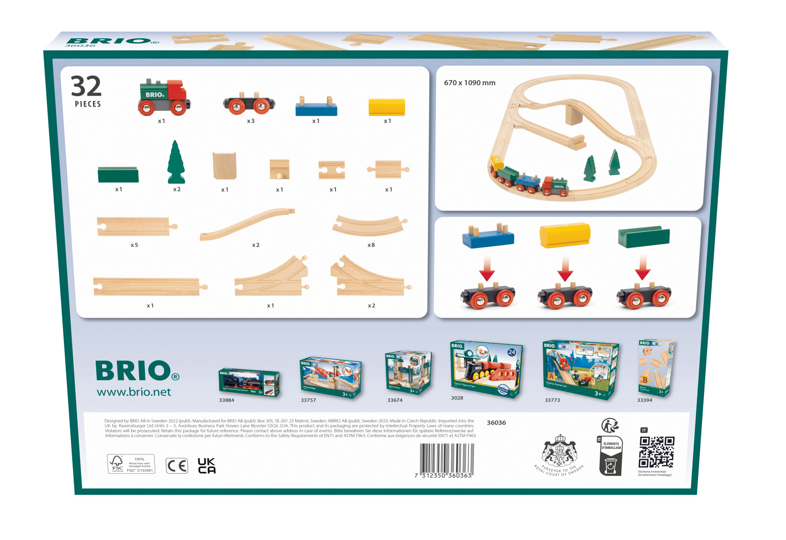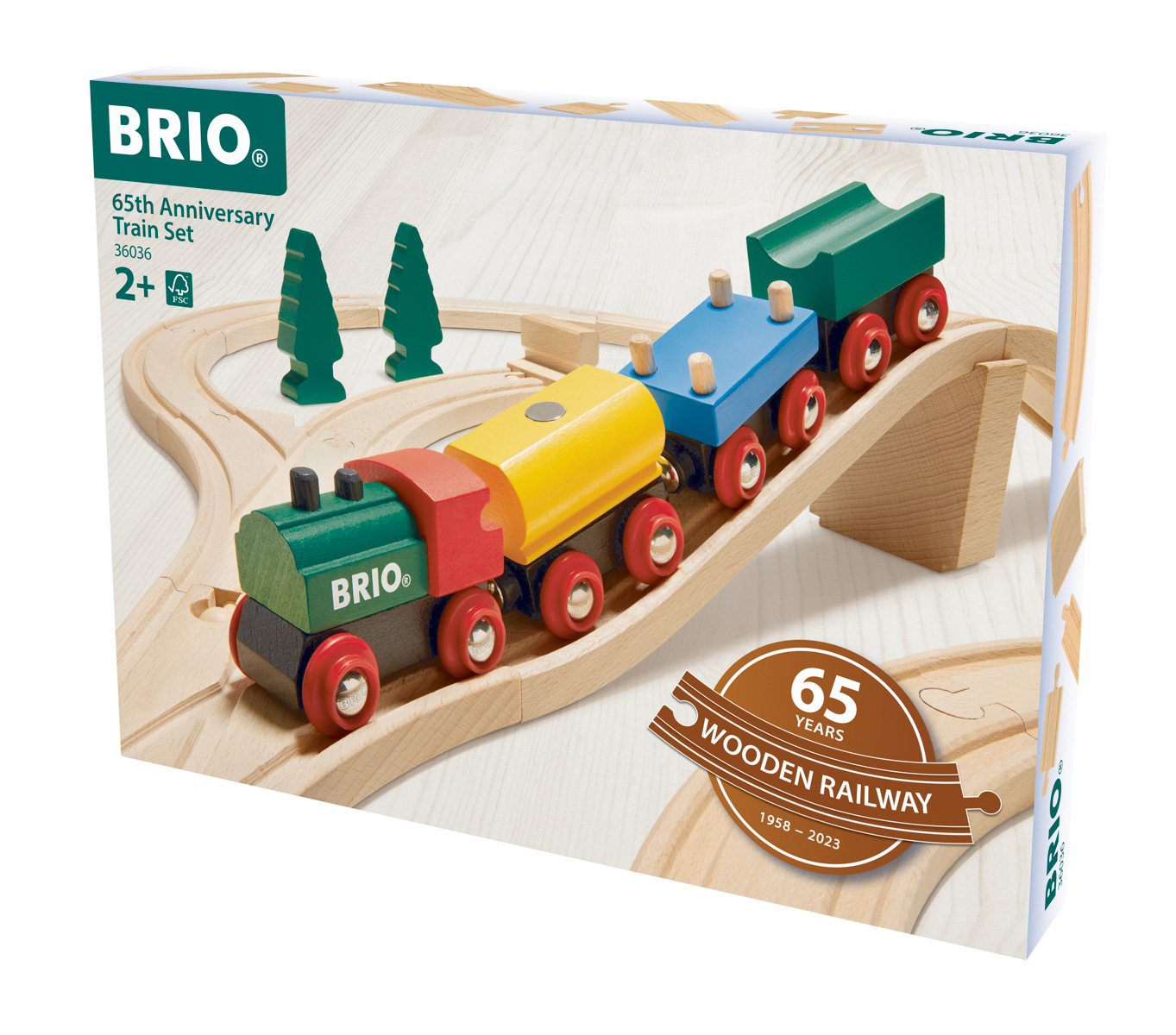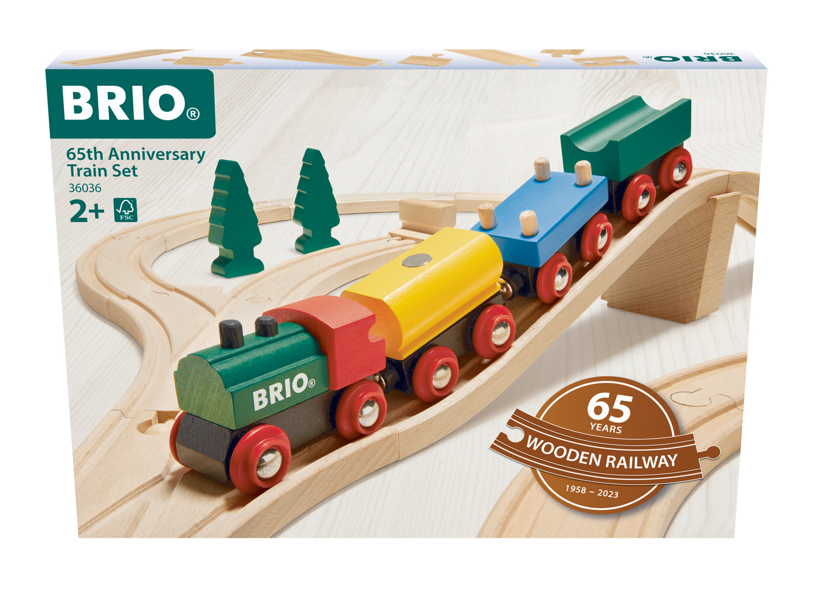 Oslava klasického vláčku se sadou k 65. výročí dřevěného vláčku. Vlaková souprava vyrobená výhradně ze dřeva je inspirována ikonickými železničními produkty BRIO, které byly poprvé uvedeny na trh v roce 1958. 32dílná sada je vyrobena z evropského bukového dřeva s certifikací FSC a obsahuje klasický vláček BRIO se 3 pestrobarevnými dřevěnými vagony, mostem, hroty a dřevěnými stromy pro scénickou dekoraci krajiny. Rozměry dráhy: 109x67x7,3cm. Věk: 2+