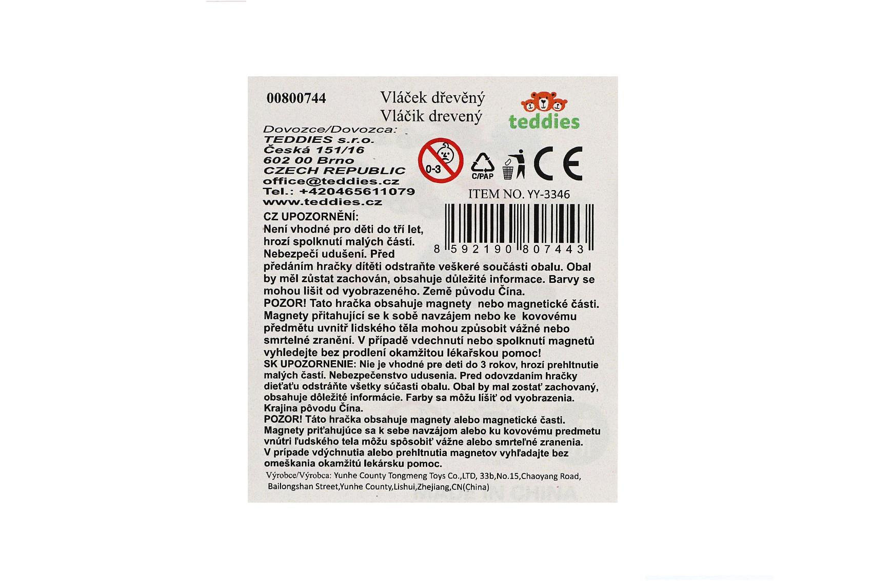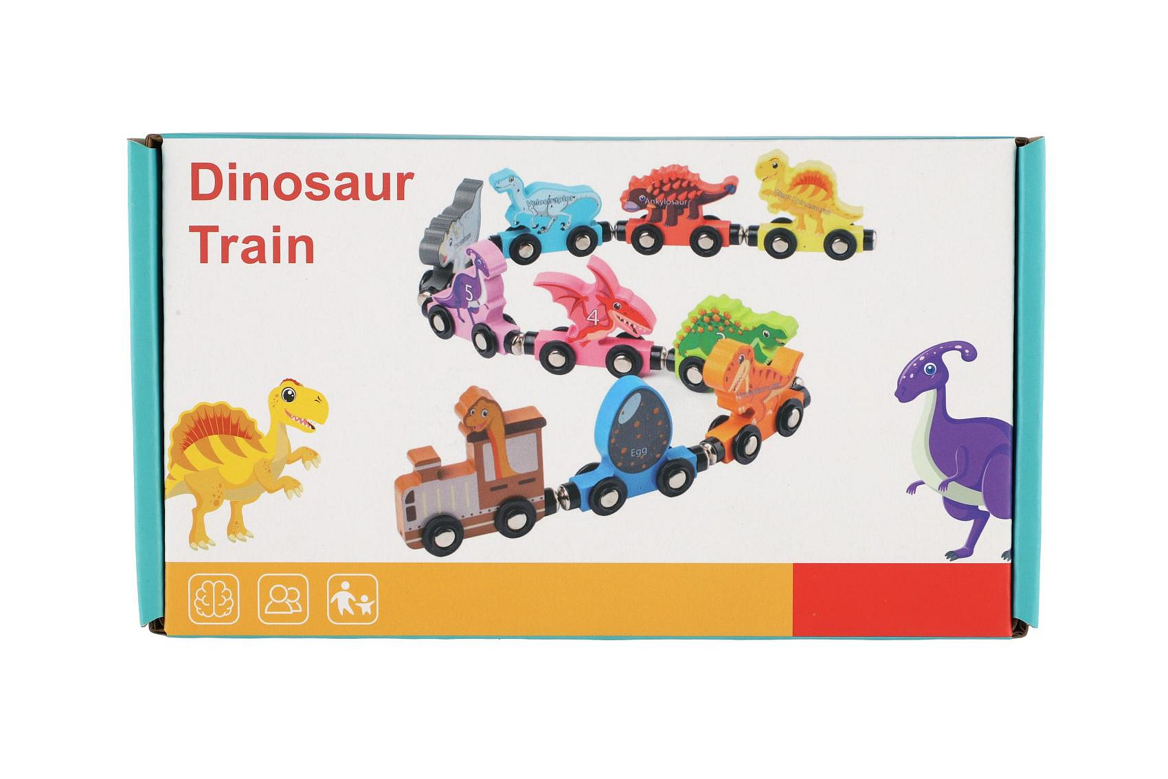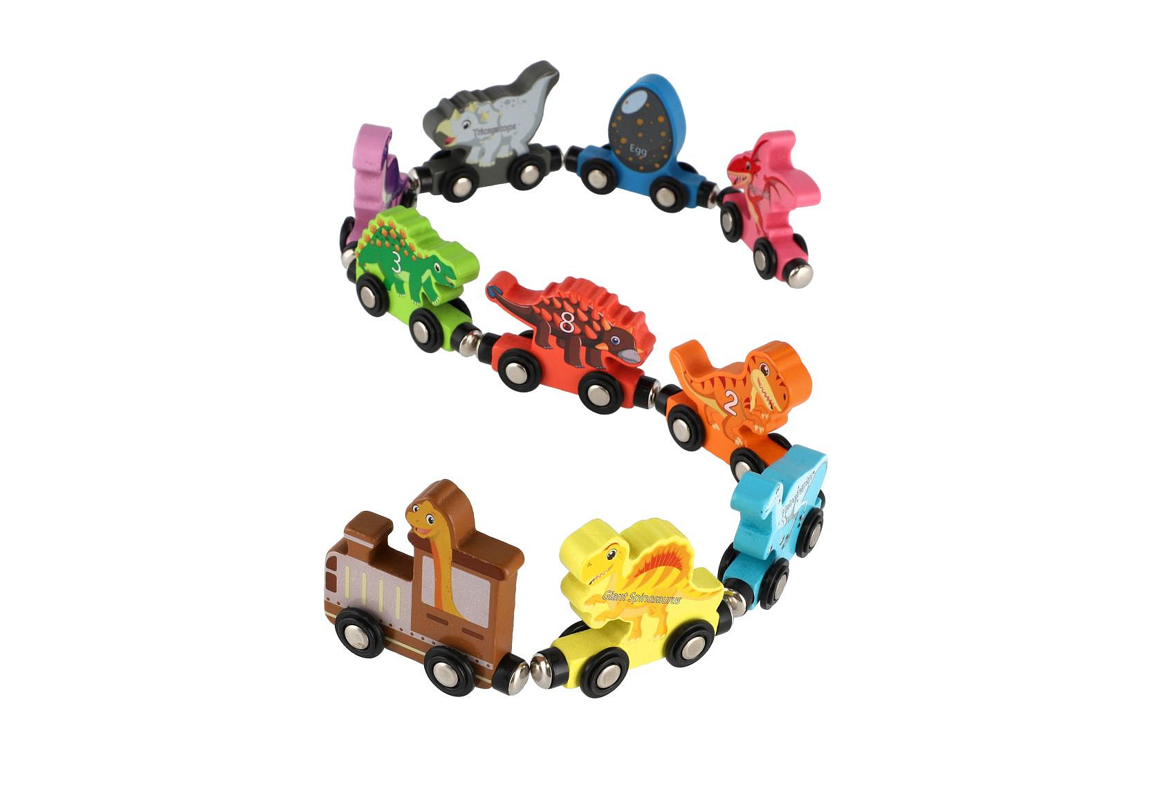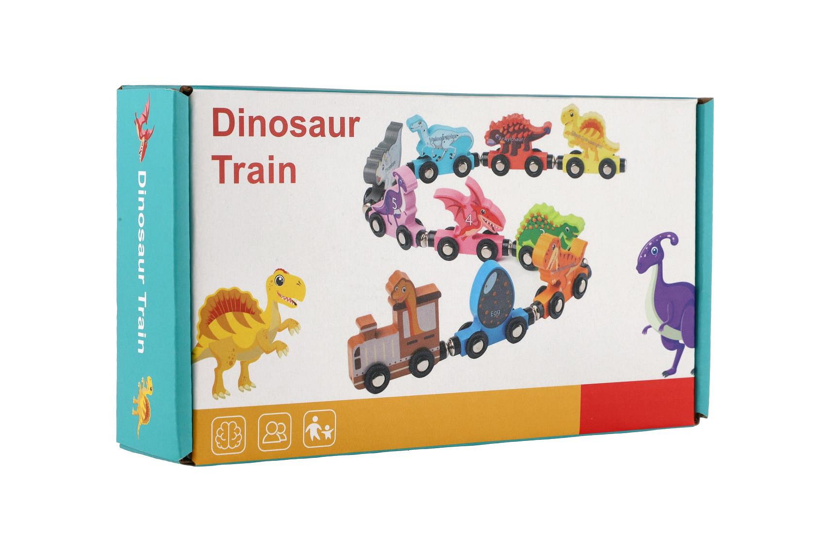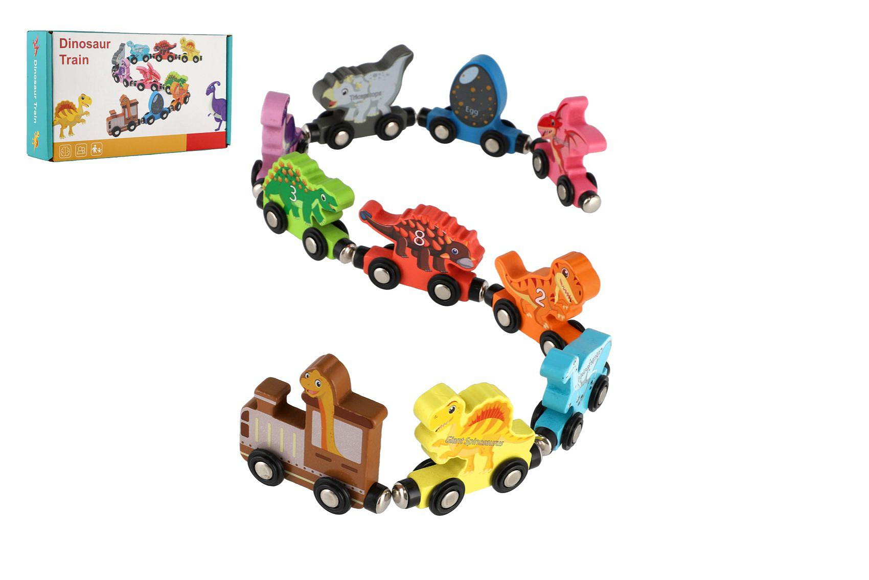 Popis Teddies Vlak/Vláček s vagóny dinosaurus na magnety 10ks dřevo v krabičce 20x11cm