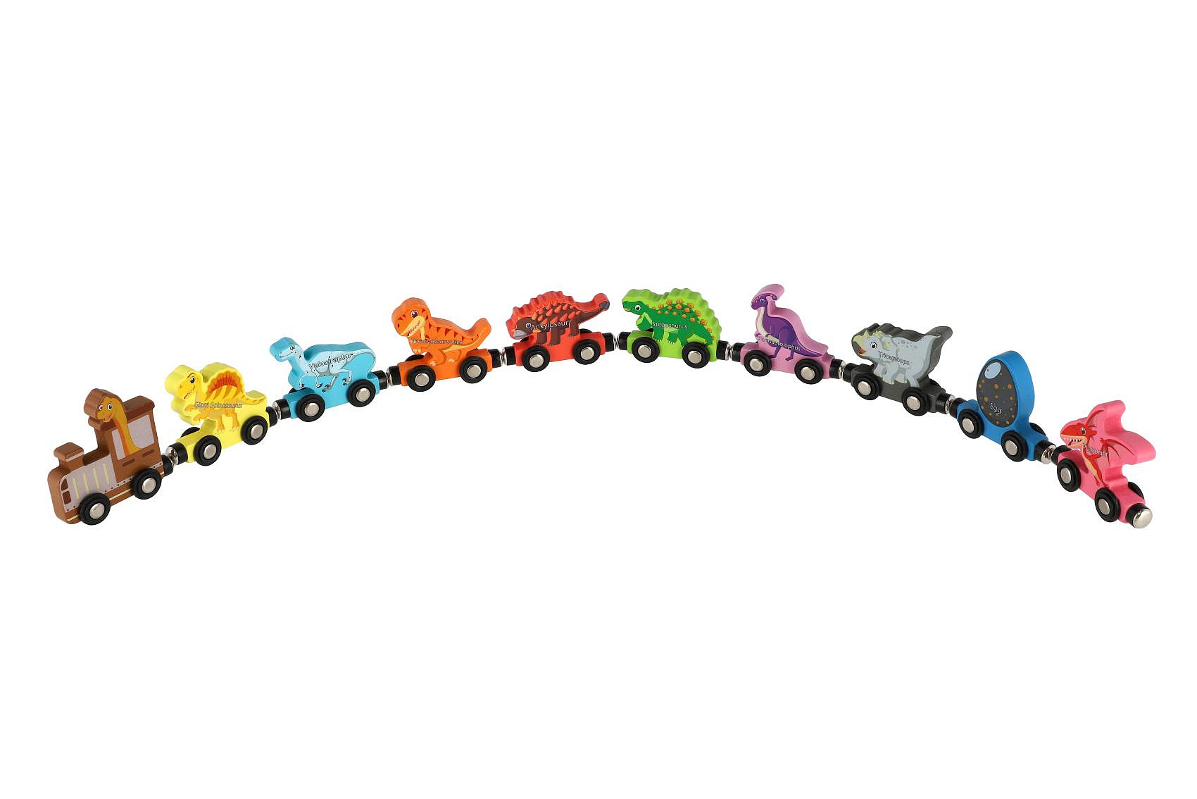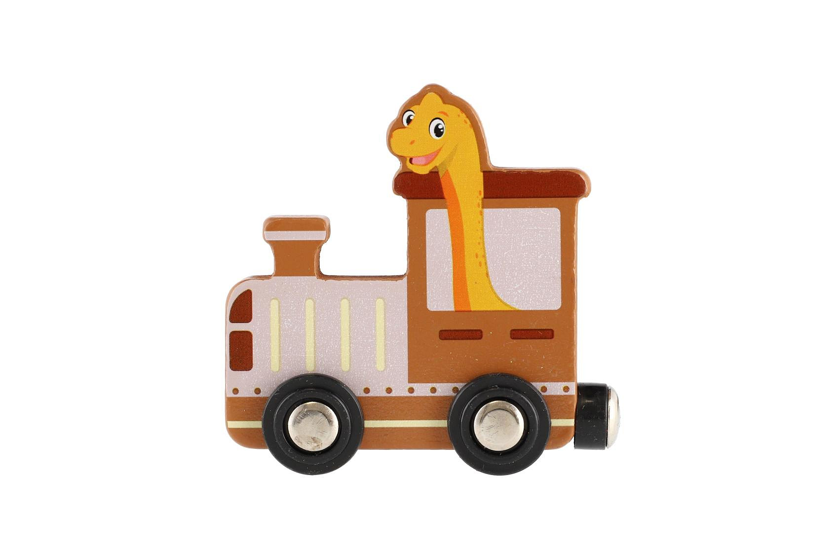 Barevný dřevěný vláček s motivy dinosaurů potěší všechny malé milovníky těchto prehistorických tvorů. Jednotlivé vagónky jsou propojené pomocí magnetů, takže je děti mohou snadno spojovat, rozpojovat a vytvářet vlastní soupravy. Hračka podporuje jemnou motoriku, představivost i logické myšlení a zároveň nabízí spoustu zábavy při hře.
