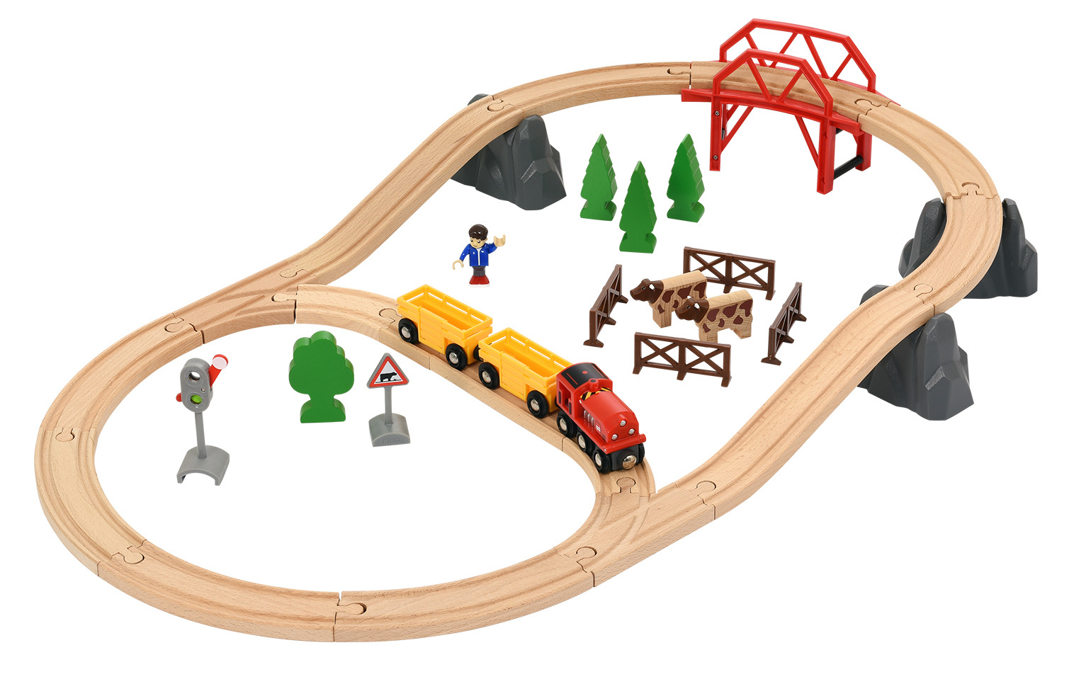 Dřevěná sada Countryside hill vláčkodráha s venkovskou krajinou. Se sadou Countryside Hill mohou malí strojvedoucí zažívat svá vlastní dobrodružství a příběhy. Kromě úžasných železničních prvků a vagónků je součástí sady také parádní most, krajinné prvky, jako jsou stromy a skály, a také figurka a dvě krávy. Krávy se mohou vozit ve vagónech pro dobytek a nechat se tak odvézt na pastvu. Dřevěné koleje – bukové dřevo s certifikací FSC. Atraktivní trasa – most a koleje vedoucí do kopce a z kopce. Funkční prvky – vagóny se sklápěcí rampou pro zvířátka, funkční signalizátor na páku. Rovné, zaoblené tvary; bezpečná, netoxická barva. Sada obsahuje 36 dílků. Obsah balení: 16 x dílek dráhy, 1 x můstek (cca. 19 x 11 cm), 2 x skála/ podpěra pod dráhu, 1 x lokomotiva (cca. 8 cm), 2 x vagón (cca. 8 cm), 1 x figurka muže (cca 5 cm), 2 x kravička, 10 x doplněk – stromy, dopravní značka, signalizace, plot. Rozměry dráhy cca.: 50,5 x 78 cm. Rozměry balení: 34,5 x 34,5 x 12 cm. Věk: 3+