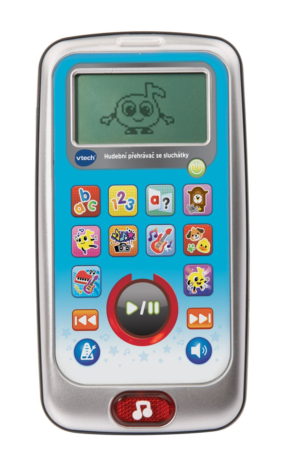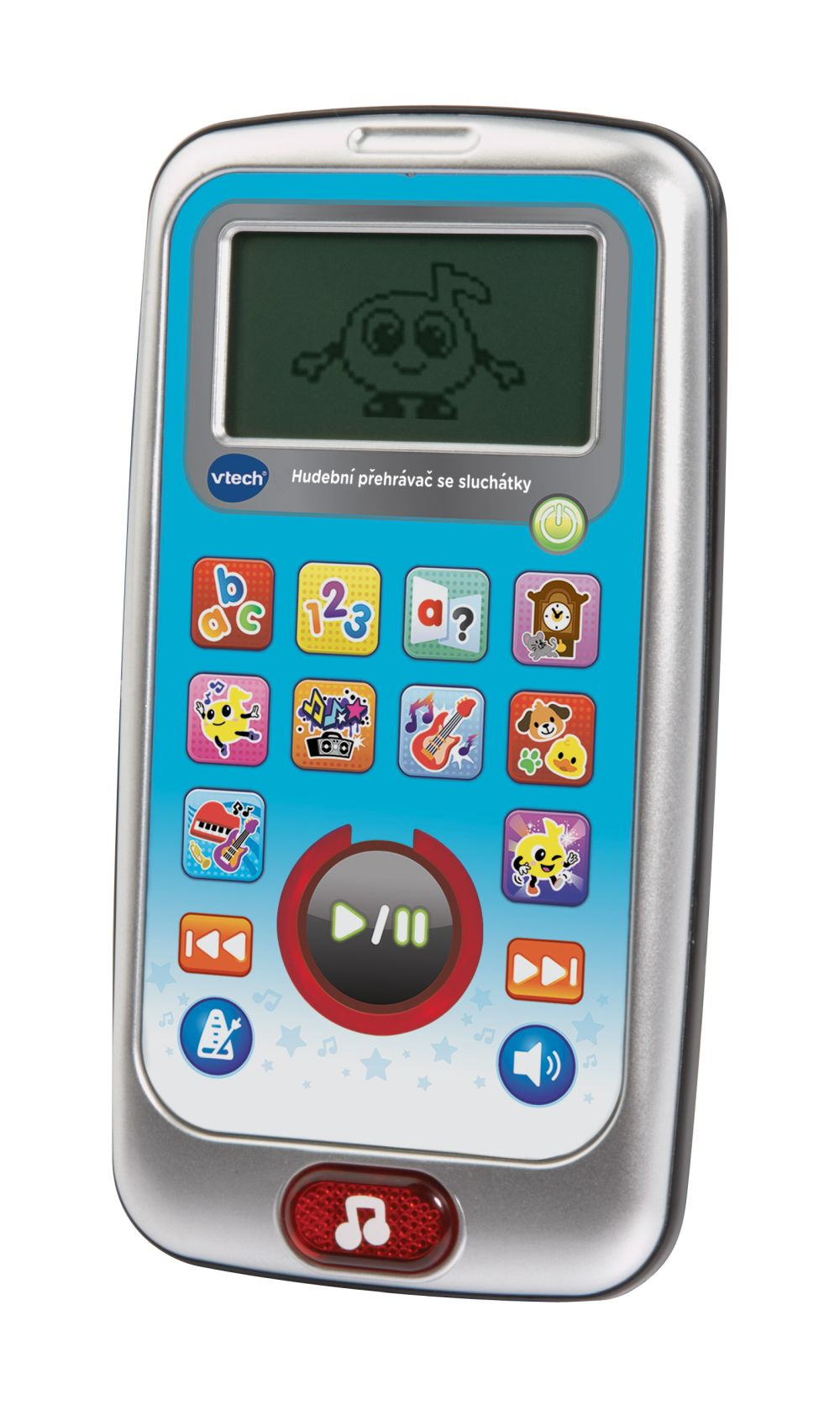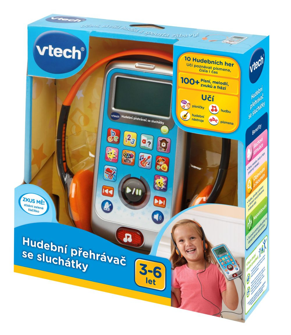Vtech Hudební přehrávač se sluchátky™ učí děti poznávat čas, písmena a čísla. Zároveň rozvíjí logické uvažování a hudební cítění. Učí děti rytmus a poznávat hudební nástroje. Obsahuje 10 hudebních a tanečních her. Součástí jsou i bezpečná sluchátka s omezenou hlasitostí, tak aby nepoškozovala sluch dítěte.