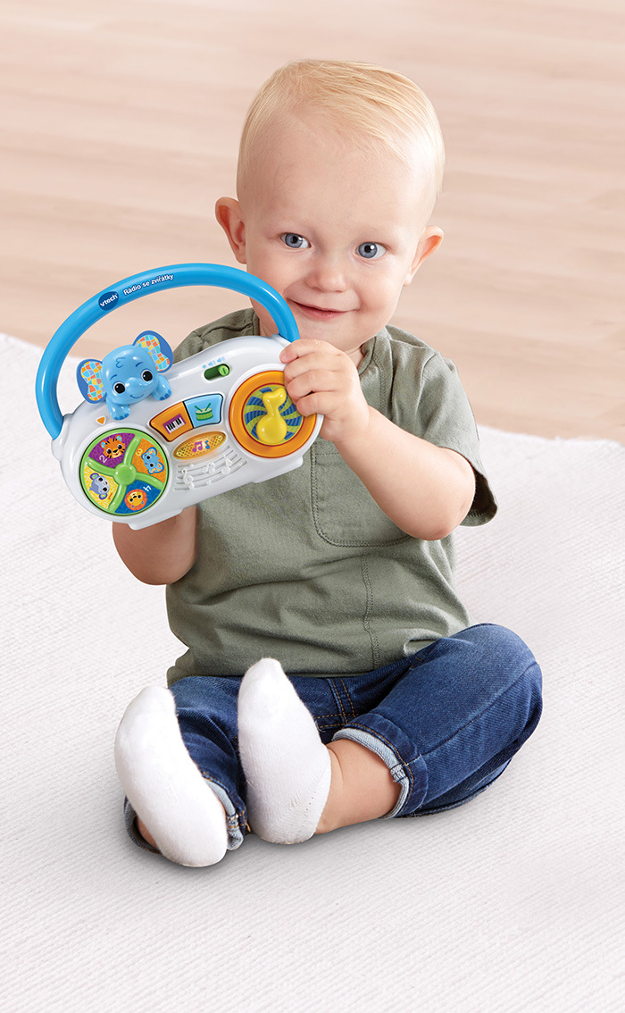 Rádio jako stvořené na báječné výlety!\nHračka Rádio se zvířátky od VTech® rozvíjí hravým způsobem hudební cítění dítěte. Obsahuje tři písničky a 30 poutavých melodií ve stylu popové a country hudby. Otáčením kolečka se zvířátky děti poznávají čísla, názvy a zvuky zvířátek. Po stlačení tlačítek s pianem a bubnem jsou slyšet zvuky nástrojů a melodie! \nOtáčením kolečka s notou dítě jistě pobaví další zábavné zvukové efekty. Všechny tyto vlastnosti přispívají v maximální míře k rozvoji jemné motoriky dítěte, podporují zvukovou stimulaci a koordinaci oko-ruka.