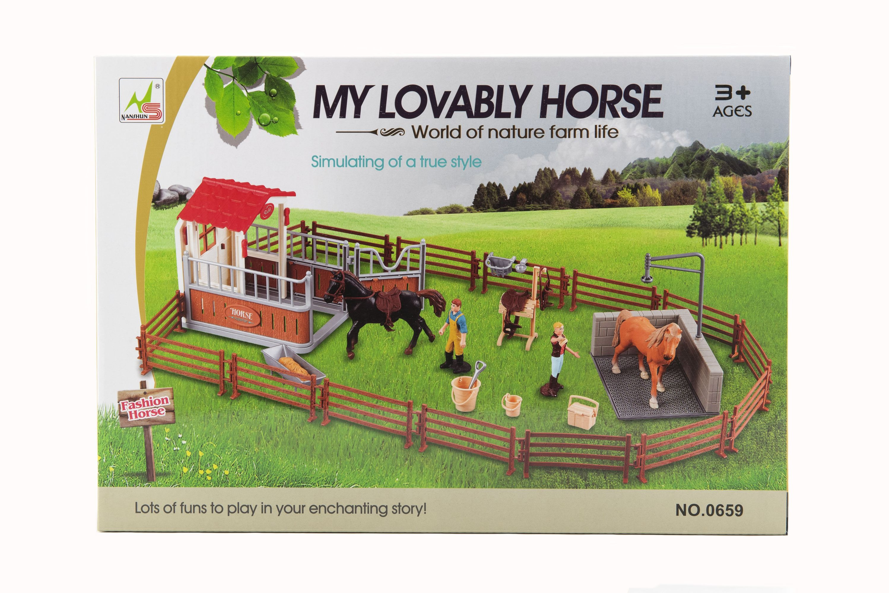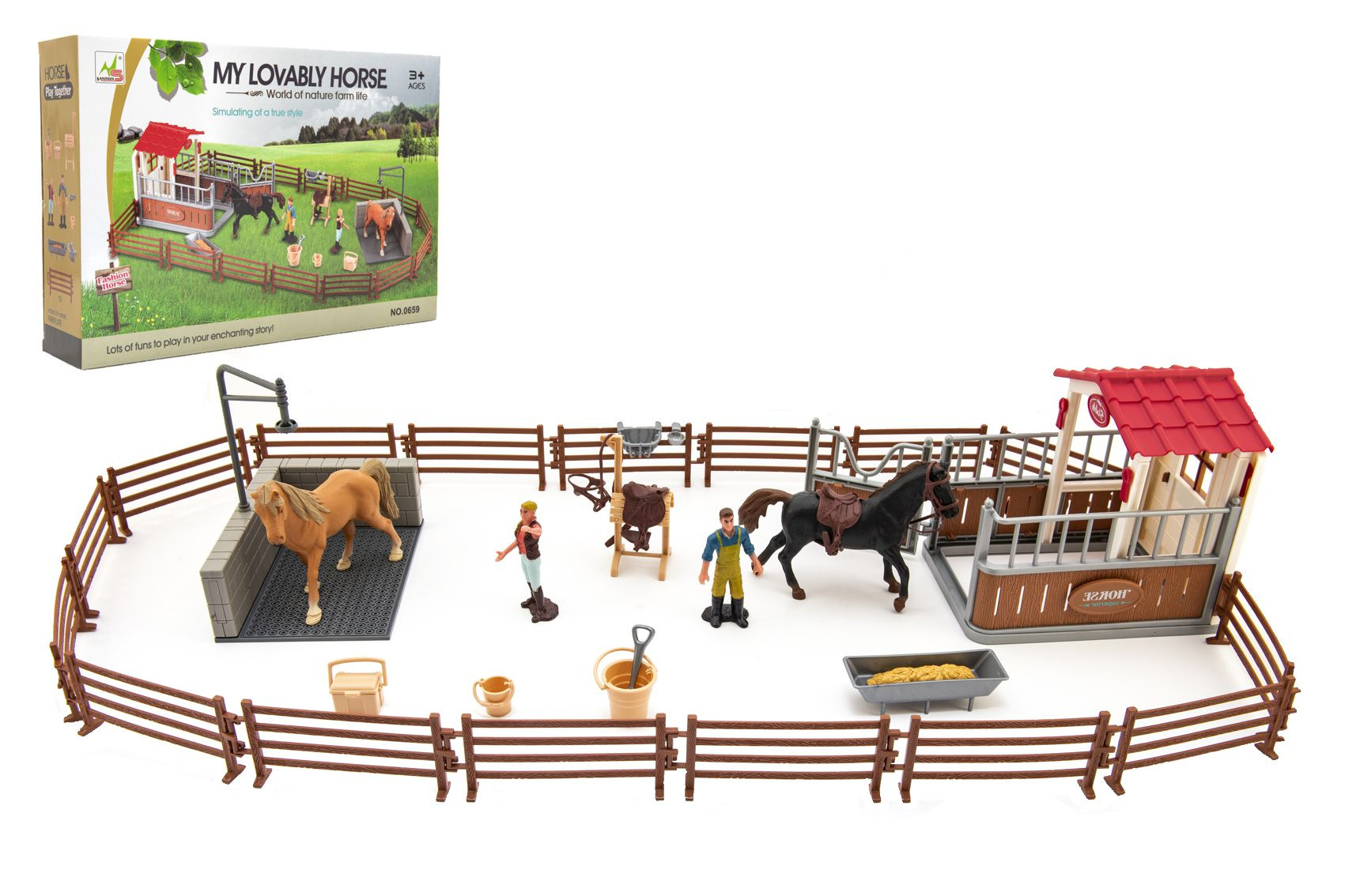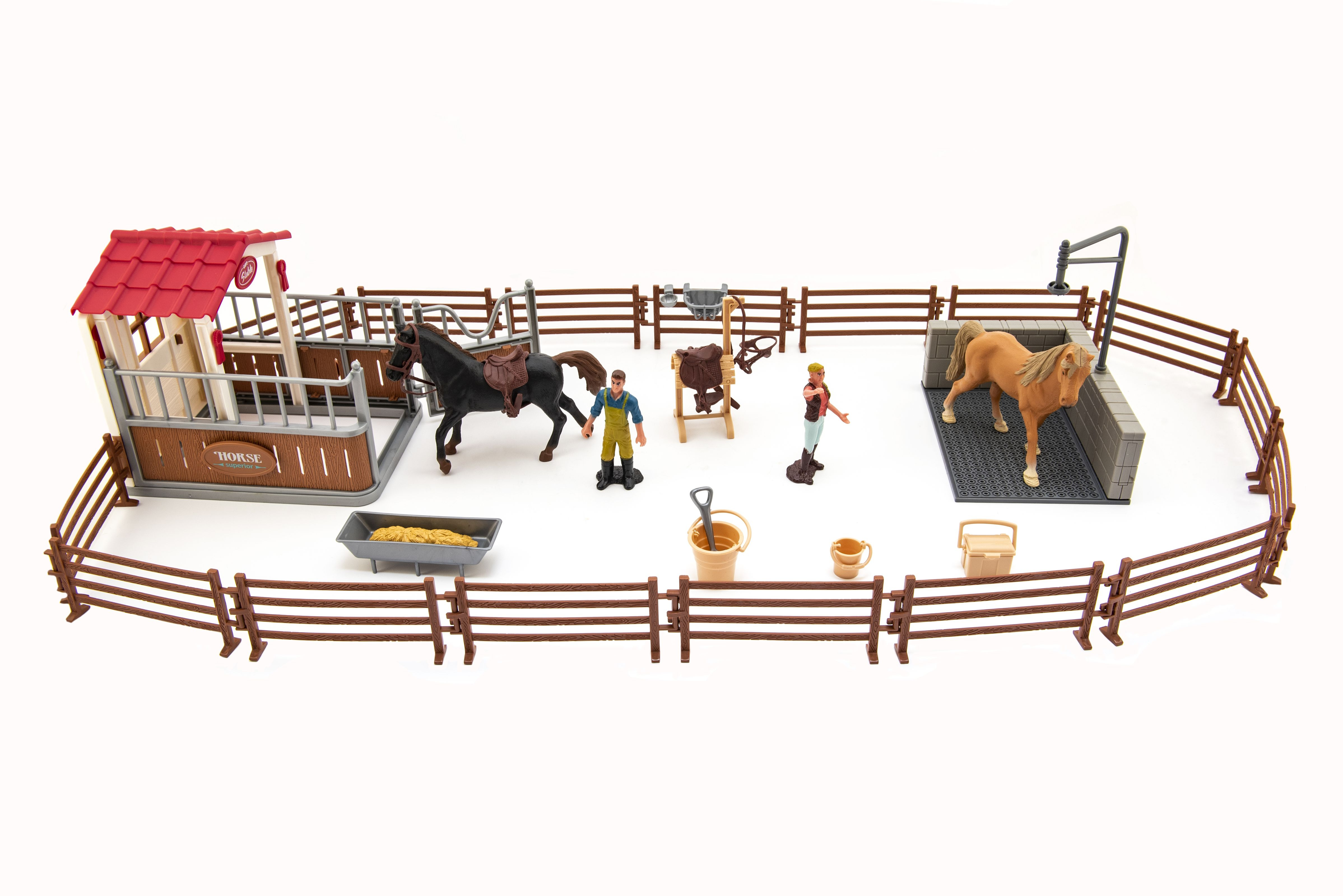 Sada pro všechny milovníky koní. Sestavte si vlastní stání s ohradou a mnoha doplňky, které potřebujete pro péči o koně. Koníčky můžete osedlat, osprchovat, vyčistit a nakrmit. Sestavte si reálnou koňskou farmu. Vše vyrobeno z kvalitního a odolného plastu. Rozměry balení 39 x 27 x 8,5 cm. Vhodné pro děti od 3 let.