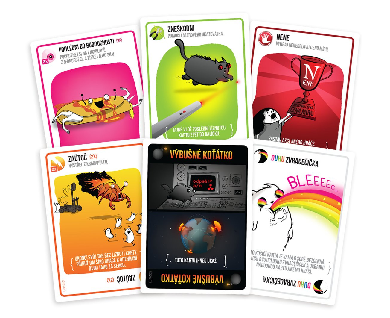 Vtipné ilustrace s ještě vtipnějšími texty vás pobaví a plně vtáhnou do hry, kterou budete chtít hrát stále dokola. Každá karta je originál. Pravidla hry jsou velice jednoduchá, vysvětlená za pár vteřin.