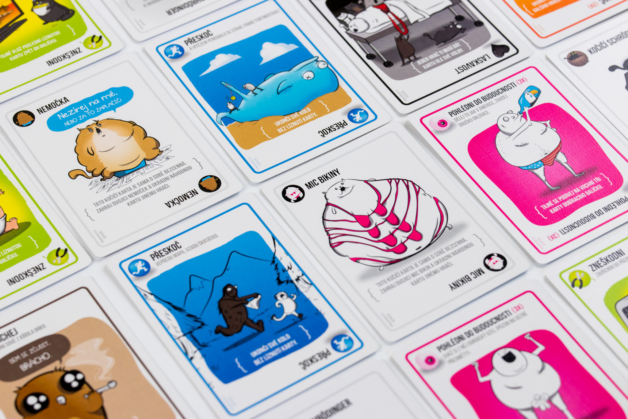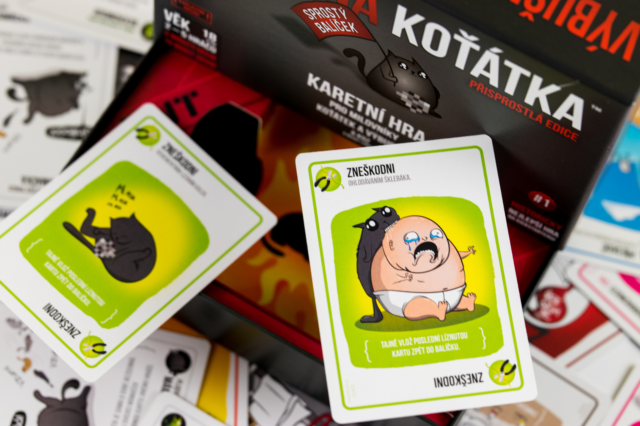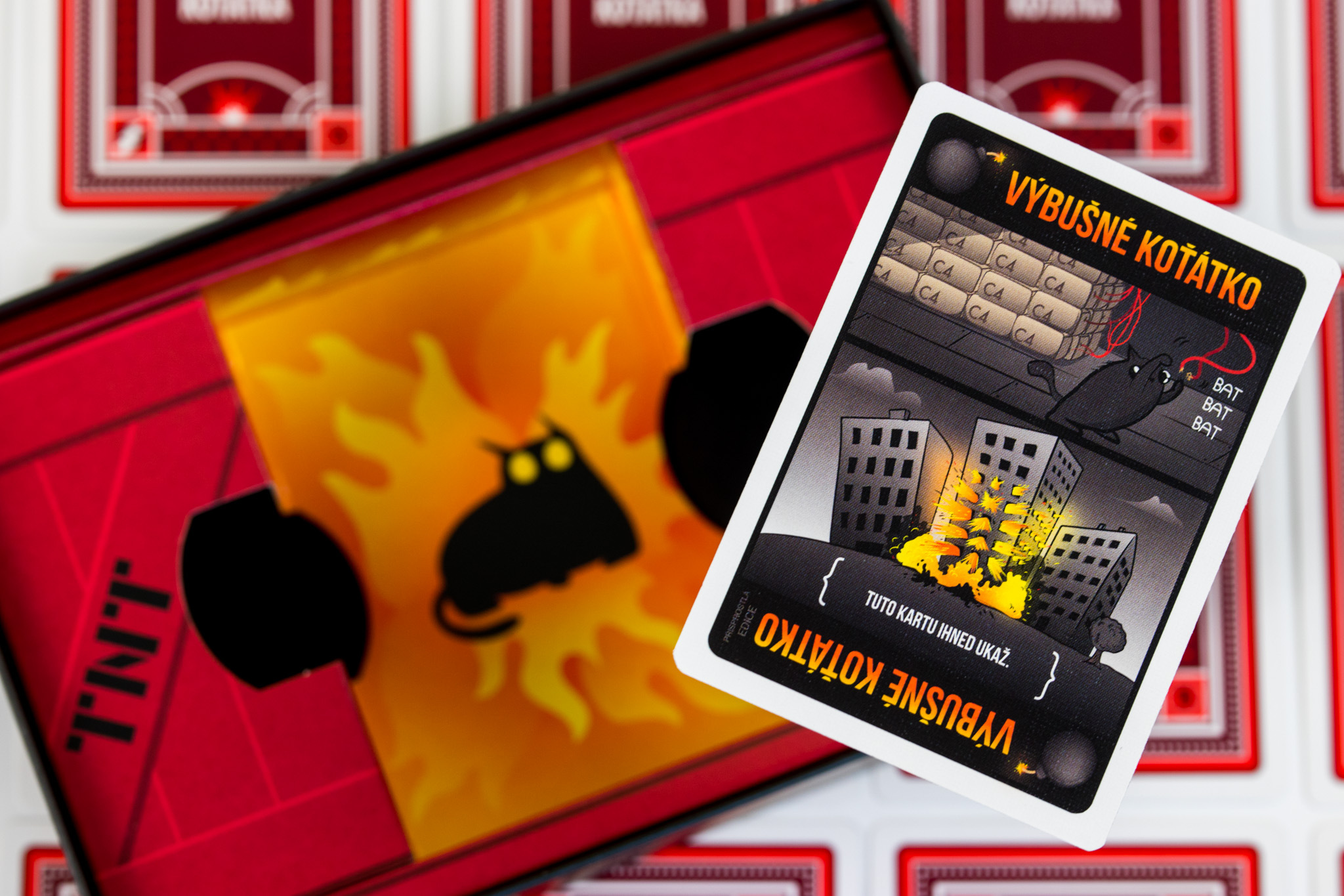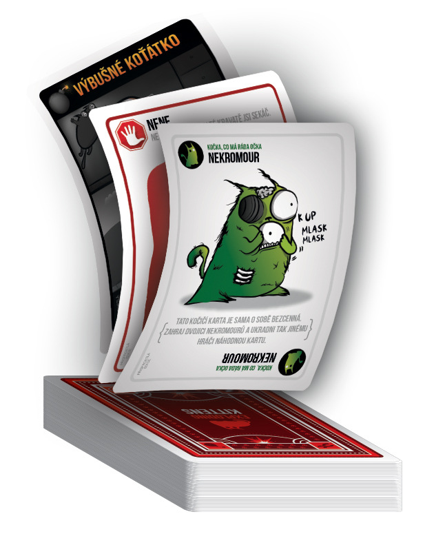O hře Výbušná koťátka Výbušná koťátka jsou extrémně strategickou verzí ruské rulety (jen s koťátky). Hráči si dobírají karty, dokud si někdo nelízne Výbušné koťátko, exploduje, umře a je vyřazen ze hry. Pokud ten hráč nemá kartu Zneškodni, která mu umožní zneškodnit koťátko pomocí laserového ukazovátka, podrbáním na bříšku nebo sendviče s šantou kočičí. Úkolem všech ostatních karet v balíčku je pomoci hráčům držet se Výbušným koťátkům z cesty (nebo je nastrčit do cesty ostatním).