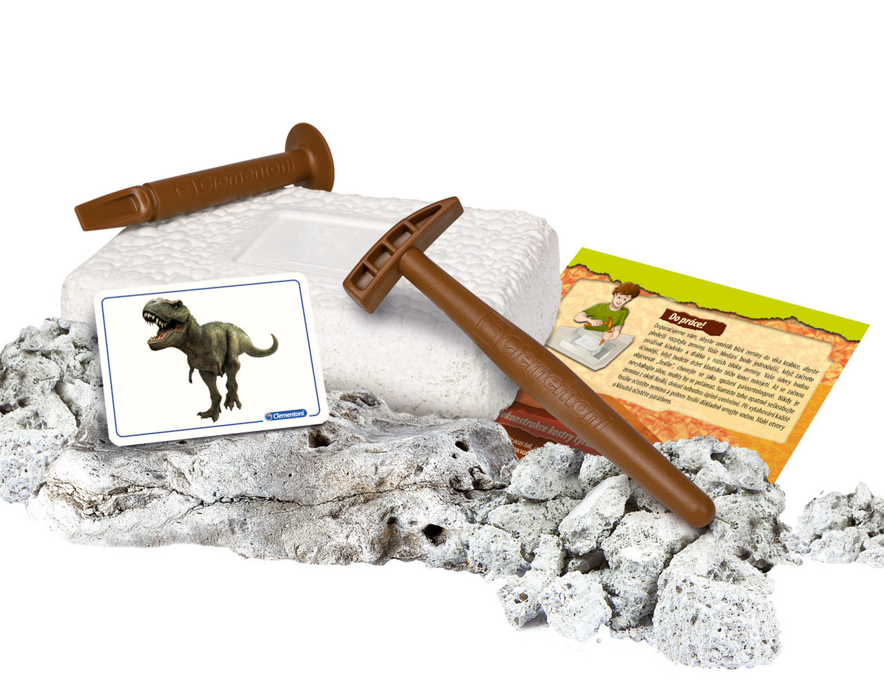 Archeologická sada z kolekce Science & Play LAB dává dětem příležitost stát se paleontologem a prozkoumat kostru Tyrannosauruse Rexe. Pomocí přiložených nástrojů opracujte kámen a objevte kosti, ze kterých si poskládáte svítící kostru T-Rexe. Při objevování postupujte podle návodu. Kostra je vyrobena z fluorescenčního materiálu, který ve tmě svítí. Sada pomáhá rozvíjet zručnost, tvořivost, fantazii a podporuje zájem o vědní obory. Sada obsahuje: kladívko, dlátko, blok zeminy s fosilií T-Rexe, ilustrovaný návod v češtině. Jazykové mutace: CZ, SK, PL, HU. Rozměry balení: 25,2 x 21 x 6,5 cm. Věk: 7+