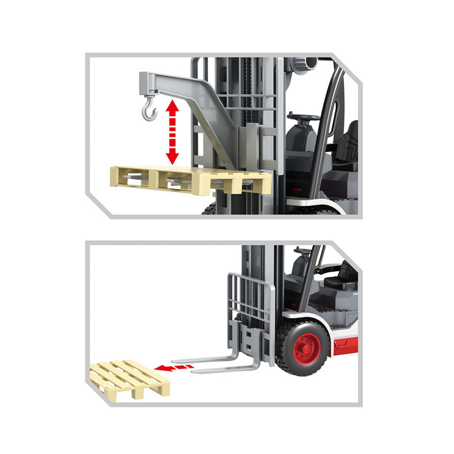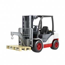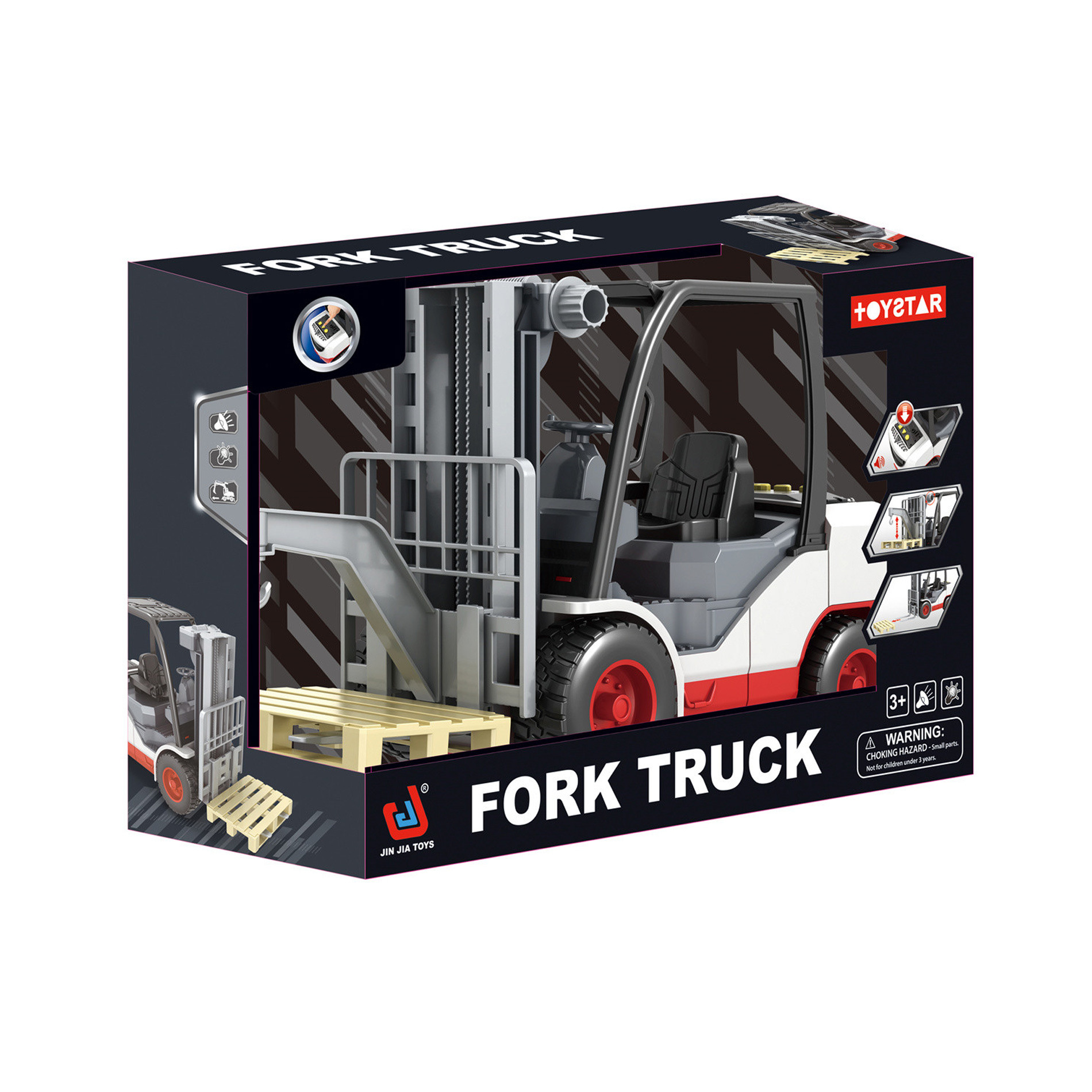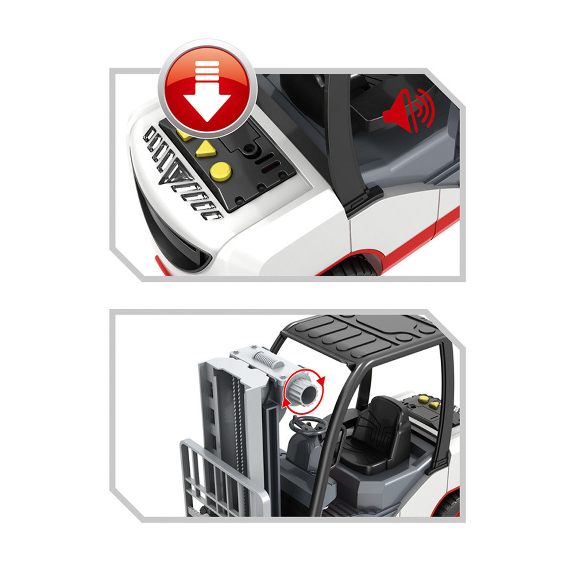 Vysokozdvižný vozík s manuálně pohyblivými částmi. Vozidlo má pogumovaná kola, která zlepšují jeho jízní vlastnosti. Je vyrobeno z kvalitních plastů, jezdí na setrvačník a jeho délka je 30 cm. Pomocí tlačítek aktivujeme světelný a zvukový efekt, je nutné použití 3 ks baterií typu AG13, které jsou součástí balení.
