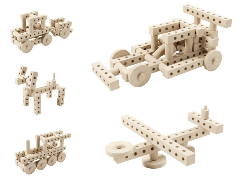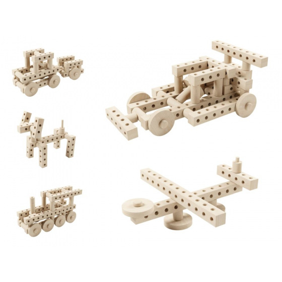 Složte si ze 67 dílků auta nebo zvířátka podle vašich představ. Nebo využijte některý z návodů na krabici a zabavte sebe i své děti na dlouhé hodiny dřevěnou kreativní zábavou.\nStavebnice CONSTRUCT obsahuje skládací a rozkládací modely autíček, zvířat a dalších modelů, zhotovené z bukových hranolů o rozměrech 32 x 32 mm v délkách od 32 do 384 mm s otvory. Jsou vzájemně kompatibilní a umožňují postavit desítky variant modelů. Je uložena v pevné kartónové krabici, která zajišťuje její dlouholetou životnost.