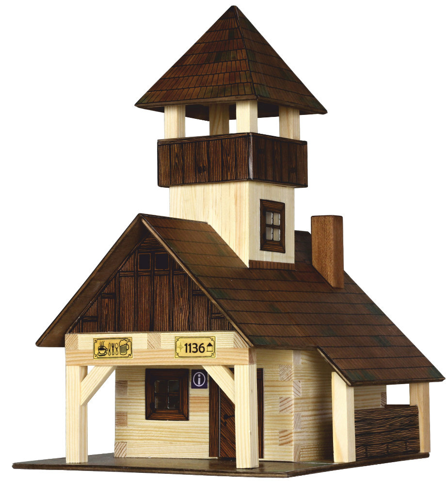 Dřevěná slepovací stavebnice Walachia - Rozhledna. Slepovací stavebnice Walachia jsou dřevěné modely domečků a staveb z Valašského kraje v měřítku 1:32. Základem jsou dřevěné hranolky 9x9 mm a k tomu jsou v sadě vždy všechny papírové doplňky - okna, dveře, střešní části atd. Pro lepení se používá lepidlo Herkules, není však součástí stavebnice. Přiložený je montážní návod a malé kapitoly z historie lidové architektury. Níže je označení obtížnosti číslem 1 - 5, přičemž 1 je nejlehčí. Rozměry: 13 x 13 x 41 cm Počet dílů: 124 Obtížnost: 4