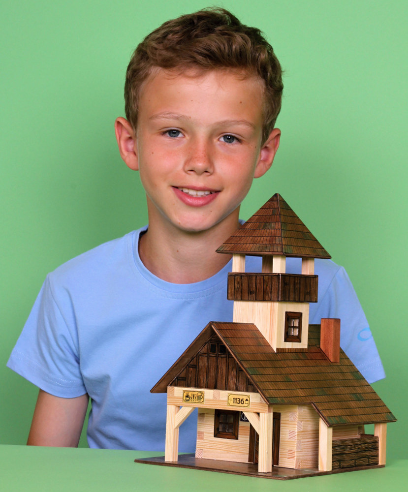 Stavebnice z masivního bukového dřeva ( prům. 15 mm ). Lze ji skládat i rozkládat. Z této stavebnice postavíte mnoho variant staveb. Ve stavebnicích WALACHIA® naleznete vše potřebné k sestavení. Jsou zde uloženy dřevěné hranolky o průřezu 9x9mm daných délek ke stavbě roubených stěn, díly na štíty a střechy, kartonové výseky oken a dveří i papírové potisky, plochy štítů, střech, stříšek, dveří, oken a dlažeb, folie oken a brusný papír na opracování dřevěných dílů ( kvalita ploch však opracování potřebuje minimálně ). Součástí stavebnice je podrobný schematický montážní plán. Počet dílů: 184.