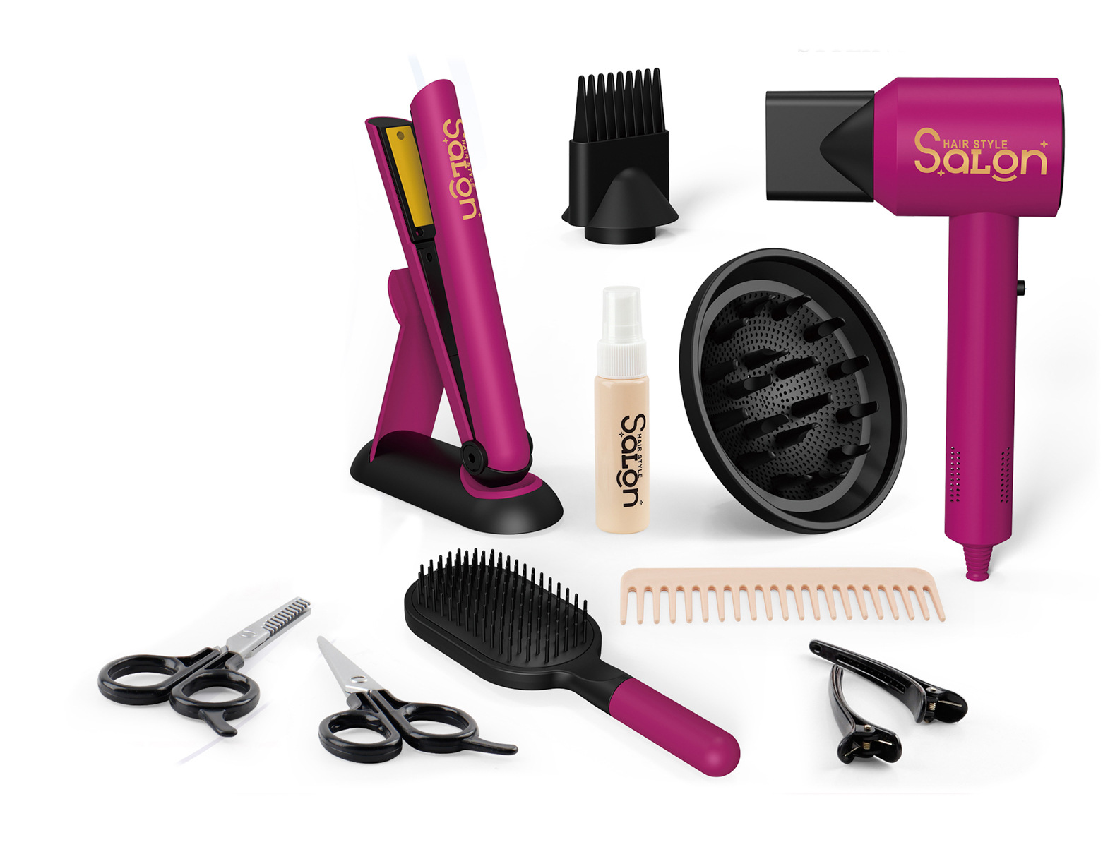 Kosmetický set s fénem a žehličkou – perfektní doplněk ideální pro malé stylistky a parádnice. Set obsahuje fén, žehličku, kartáč, hřeben, 2x nůžky, 2x sponku, sprej a nástavce. Fén funguje na 2x AA baterie (nejsou součástí), žehlička na 2x AAA baterie (nejsou součástí). Rozměry balení: 46,5 x 7 x 33 cm. Věk: 3+