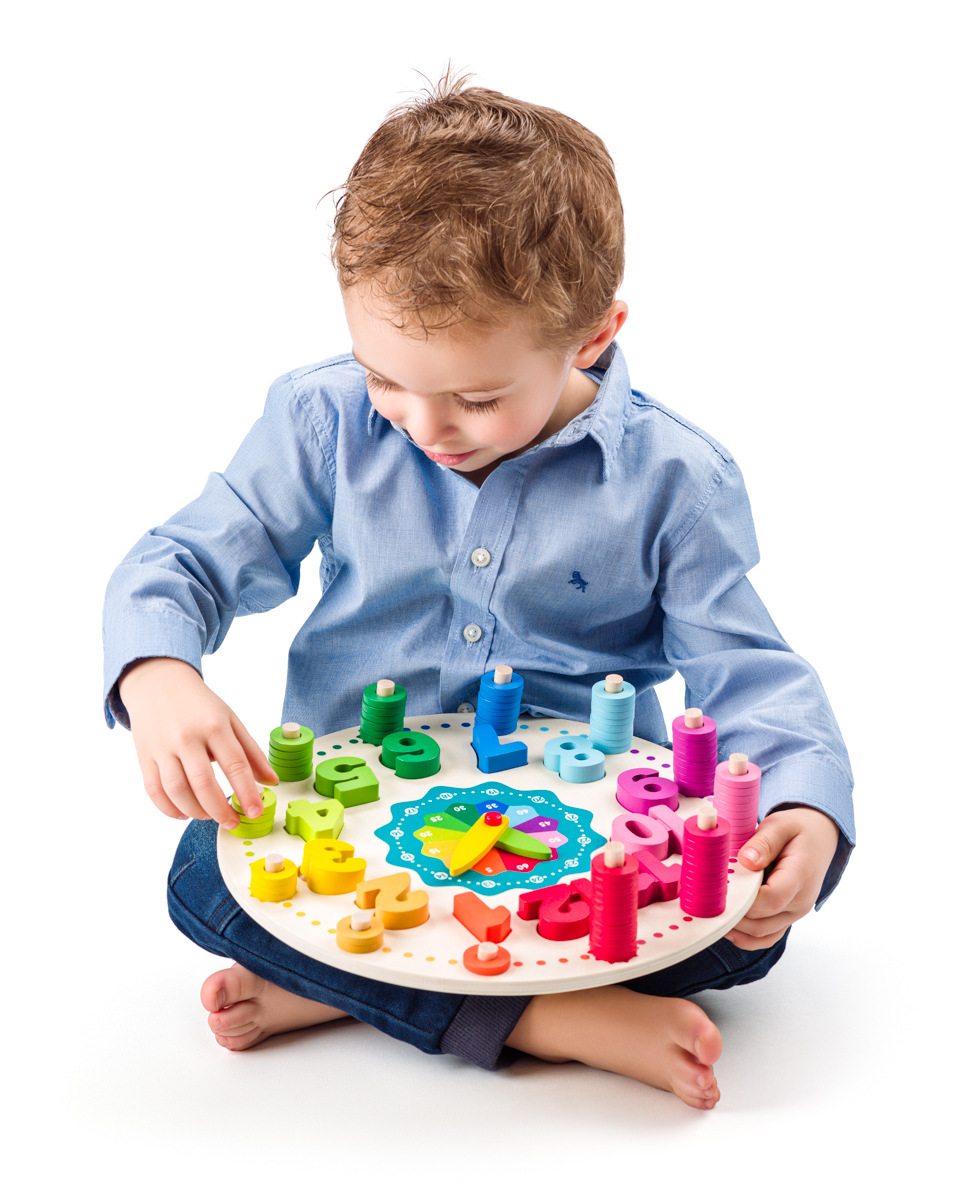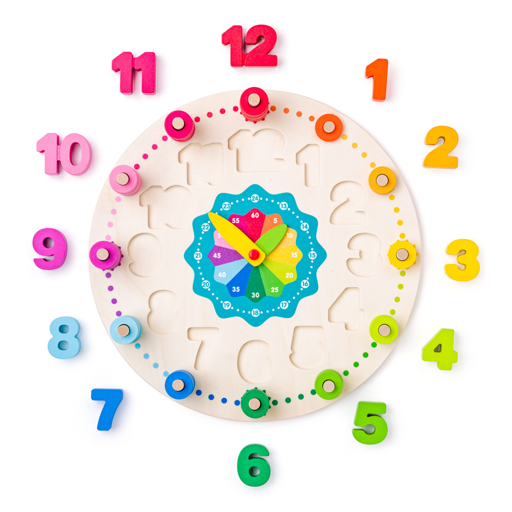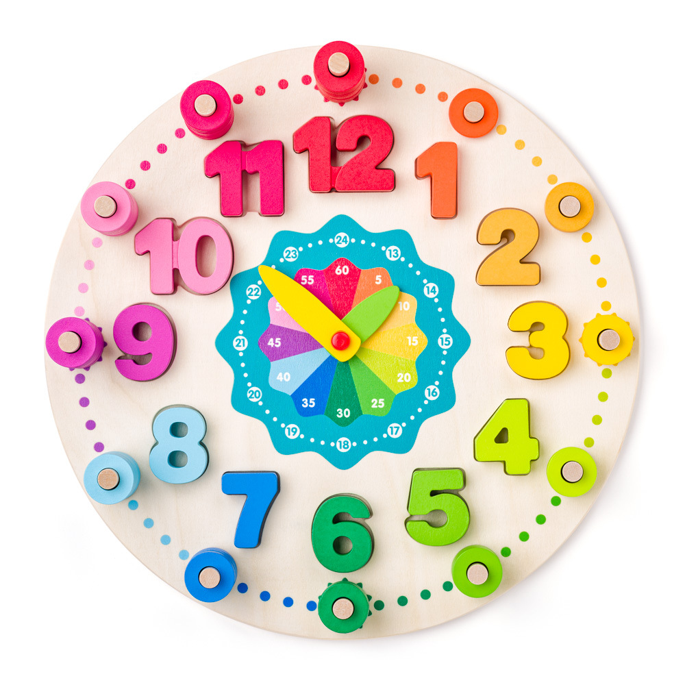 Didaktická hračka, se kterou se dítě naučí vnímat hodiny jako pomůcku pro měření času. Naučí se poznávat číslice a díky barevným kroužkům i hodnotu, kterou představují.| Věk: 3+ | Rozměr:průměr 30 cm, výška 7,5 cm.