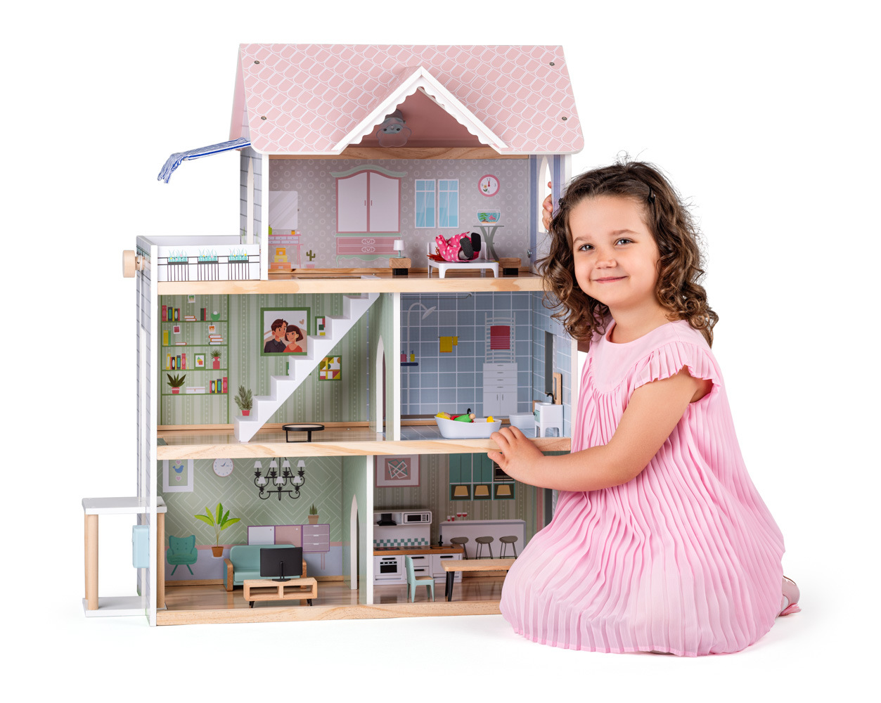 Kvalitní třípatrový domeček pro panenky typu Barbie (30 cm) dodáváme včetně zobrazeného příslušenství (18ks). Nábytek je vyroben z kombinace materiálů dřevo/ plast/ textil. Z přízemí do prvního patra se mohou panenky svézt výtahem. Panenky nejsou součástí výrobku. K příslušenství domečku patří rovněž pergola se zahradním nábytkem a markýzou.| Věk: 3+ | Rozměry: 75 x 39 x 120 cm | Pergola: 30 x30 x 42 cm