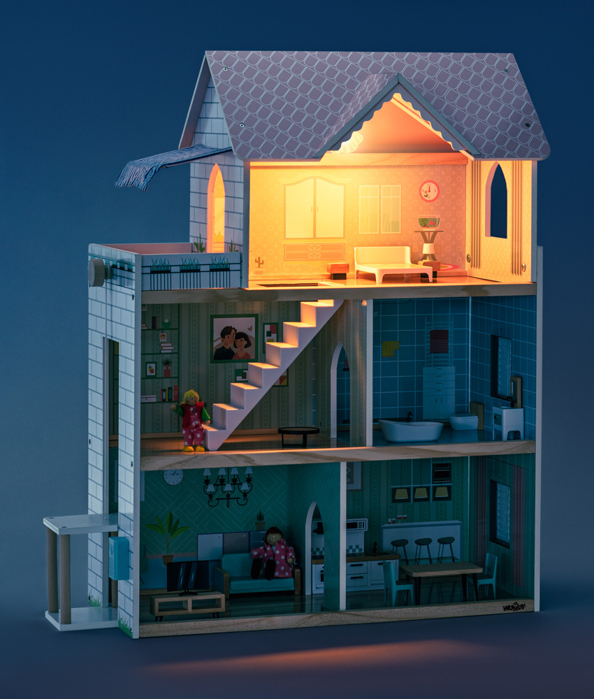 Nový design domečku vznikl ve spolupráci s českou výtvarnicí a na první pohled zaujme svojí barevností. Tento kvalitní třípatrový domeček je určen pro panenky typu Barbie (30 cm) a dodáváme ho včetně zobrazeného příslušenství (7ks). Nábytek je vyroben z kombinace materiálů dřevo/ plast/ textil. Z přízemí do prvního patra se mohou panenky svézt výtahem. Panenky nejsou součástí výrobku. Příslušenství domečku: křeslo se stolkem, stůl a dvě židle, postel, vana. | Rozměry: 74,5 x 30 x 116cm | Věková kategorie: 3+| Toto autorské dílo je registrováno u Art&Copyright pod číslem 204-04-21-01 ze dne 21.1.2021.