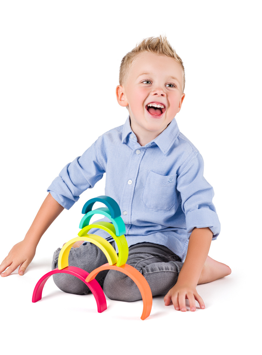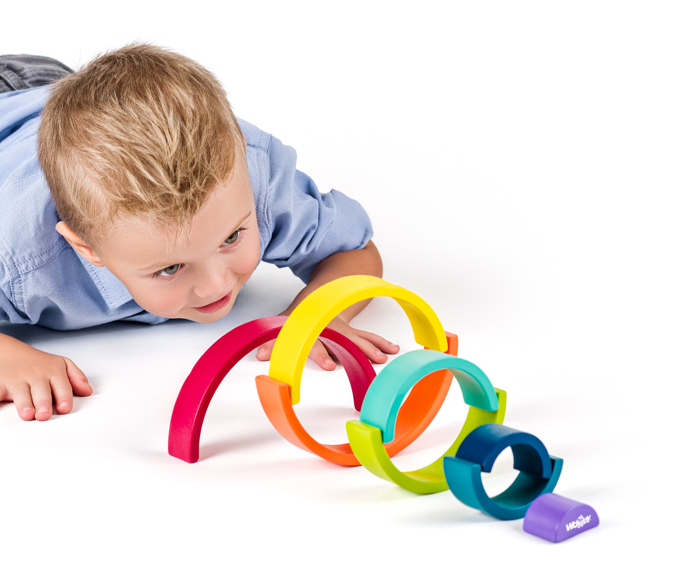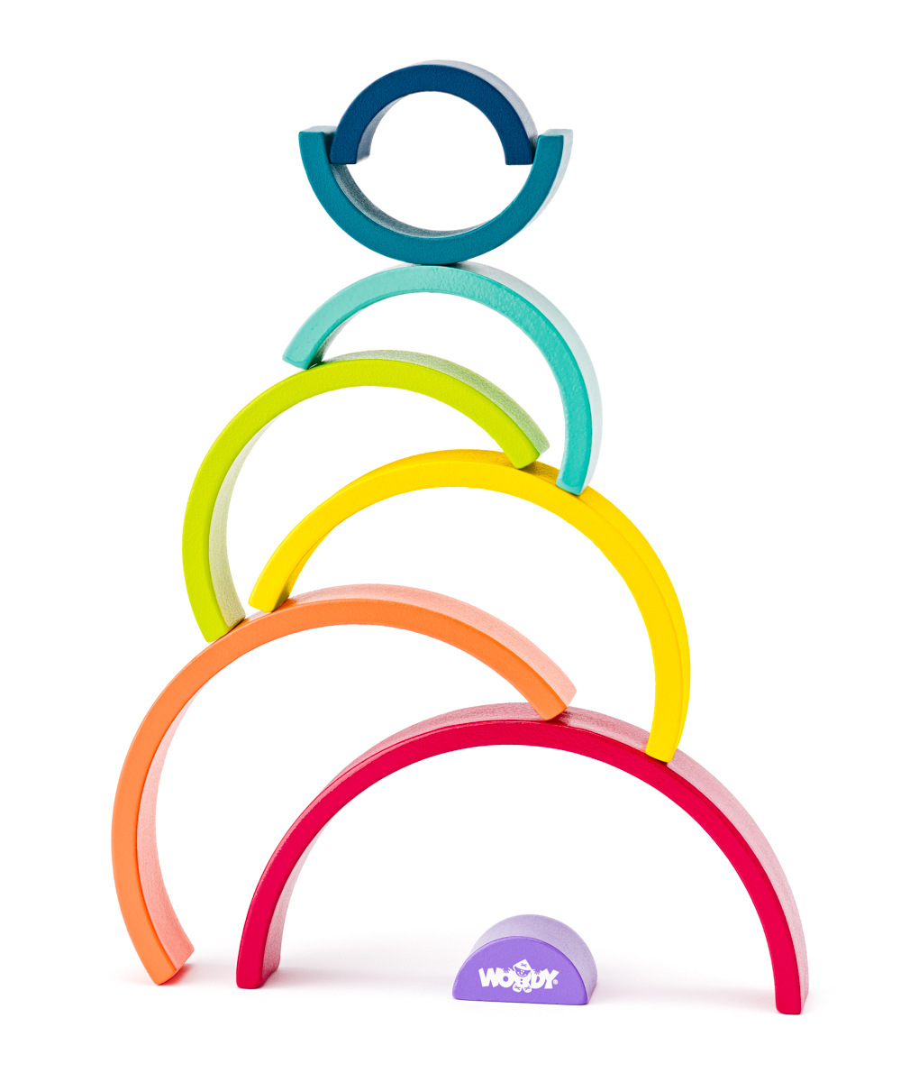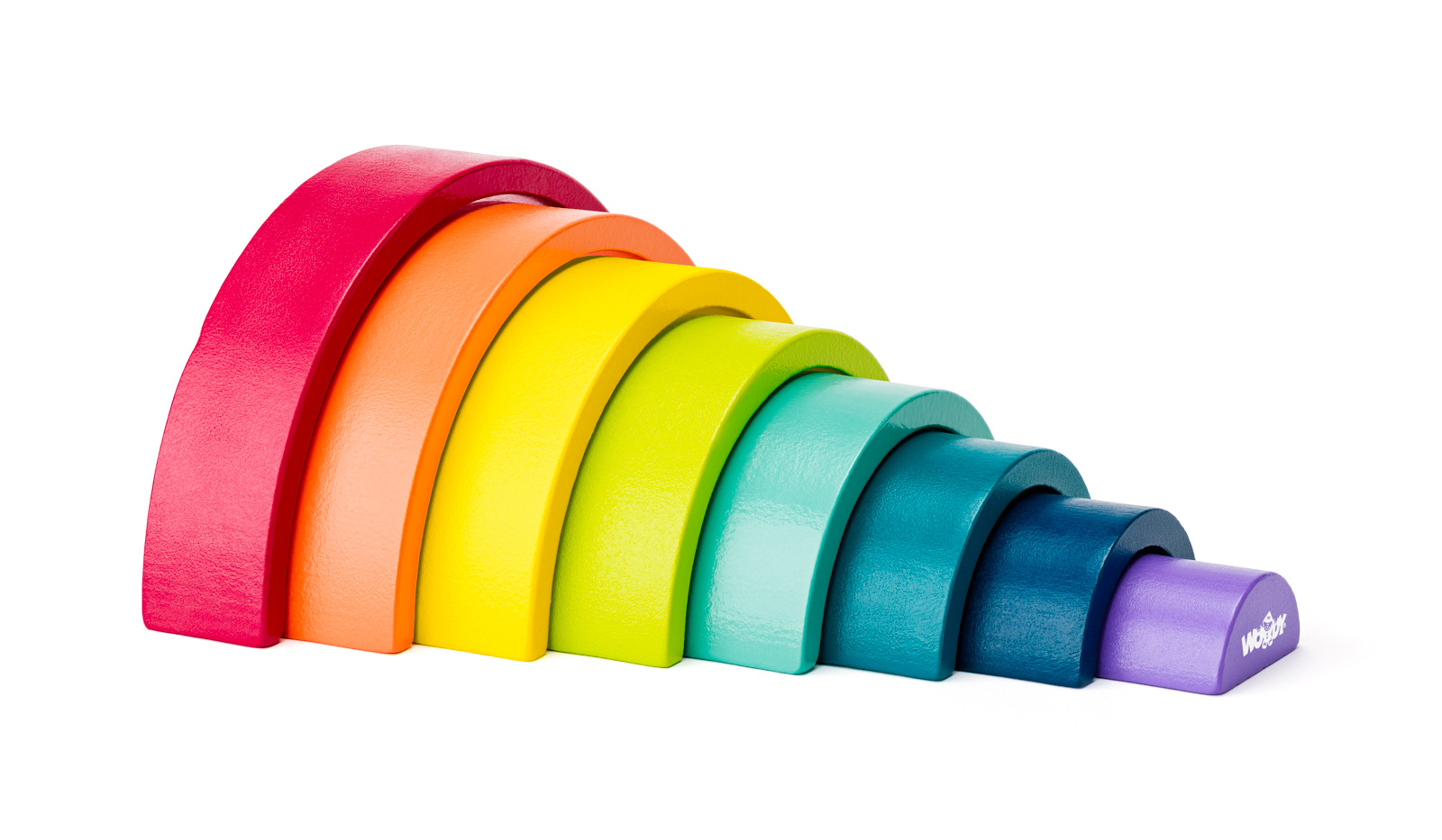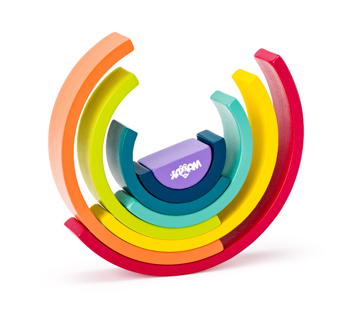 Skládačka a balanční hra v jednom. Dítě si s touto jednoduchou skládačkou osvojí hned několik dovednosti: motorické a intelektové. Tím, že poskládá všechny oblouky duhy od největšího k nejmenšímu trénuje logiku. Oblouky duhy však může dítě vrstvit v prostoru na sebe jako balanční hru a tím rozvíjet jemnou motoriku. | 1+| Rozměr: 16,5 x 3 x 8,4 cm
