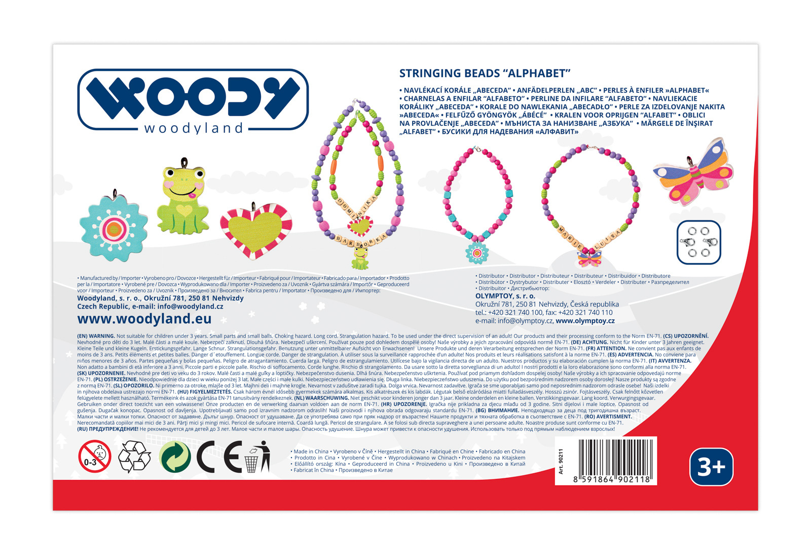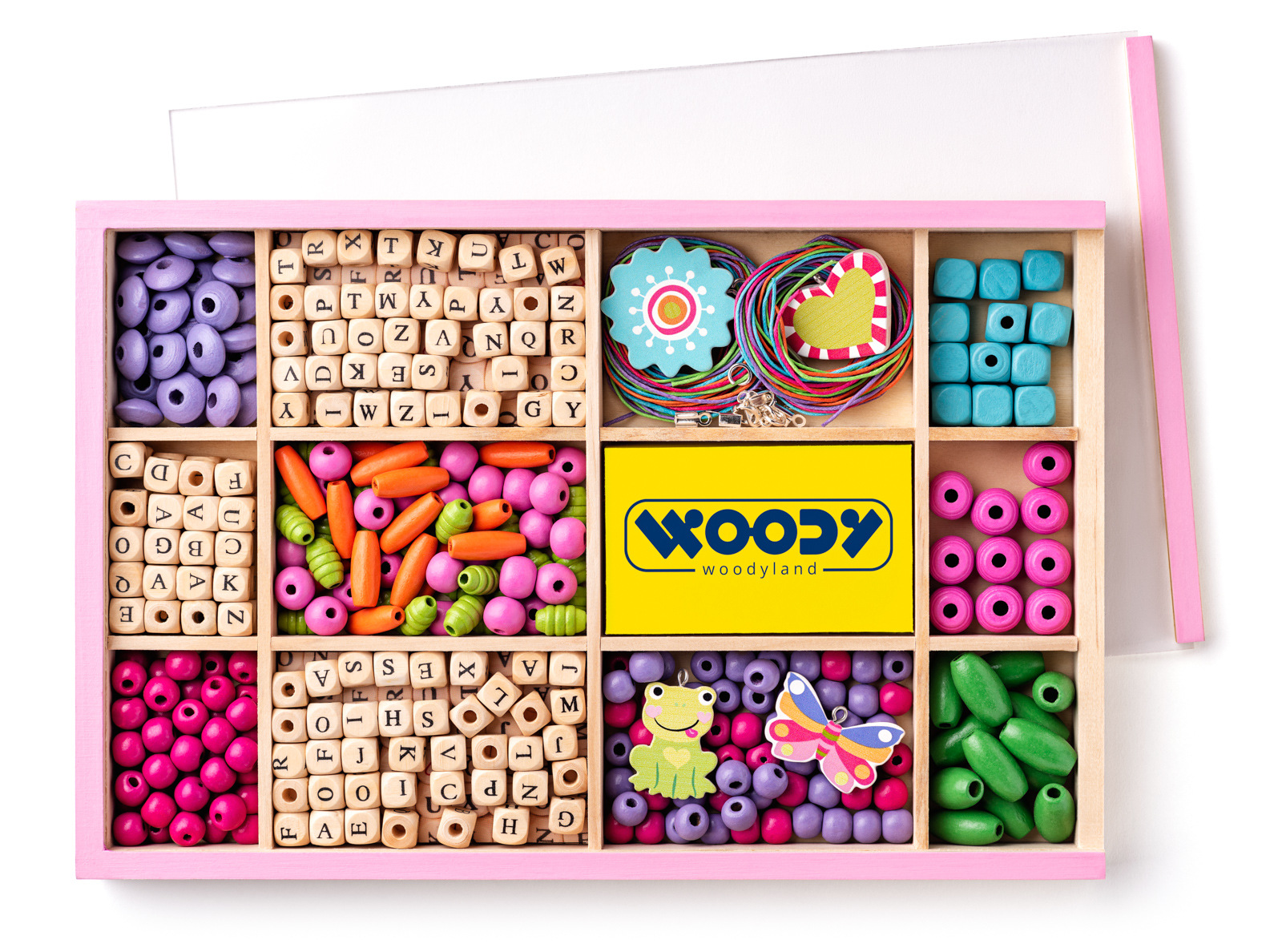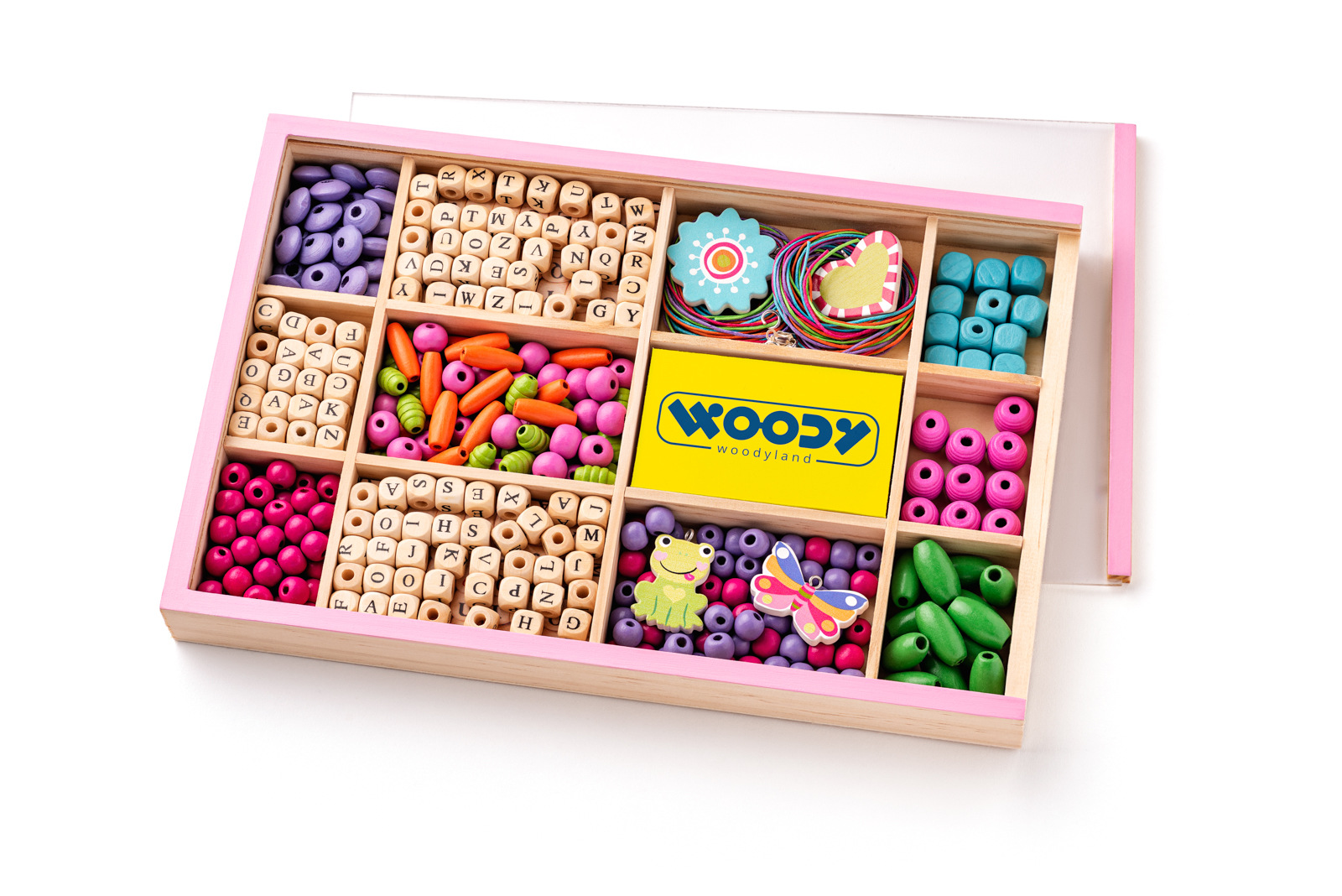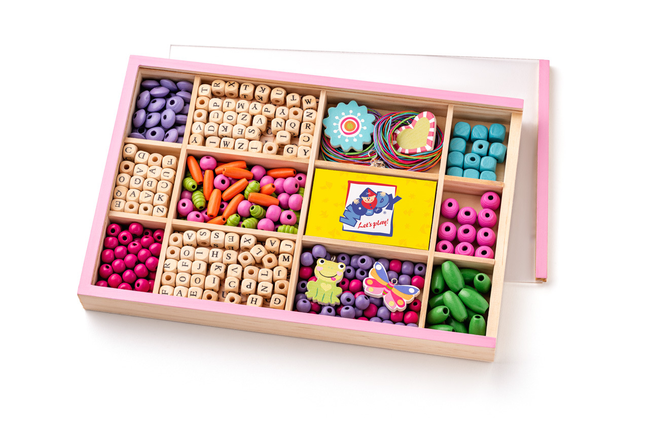 Sada obsahuje: barevné korálky různých tvarů, korálky s motivem ABC, květin, srdíček, zvířátek a šňůrky k navlékání se zapínáním. Vše umístěno v praktické dřevěné krabičce se zasouvacím víkem z plexiskla. Rozměr: 29 x 19,2 x 3 cm. Věk: 3+