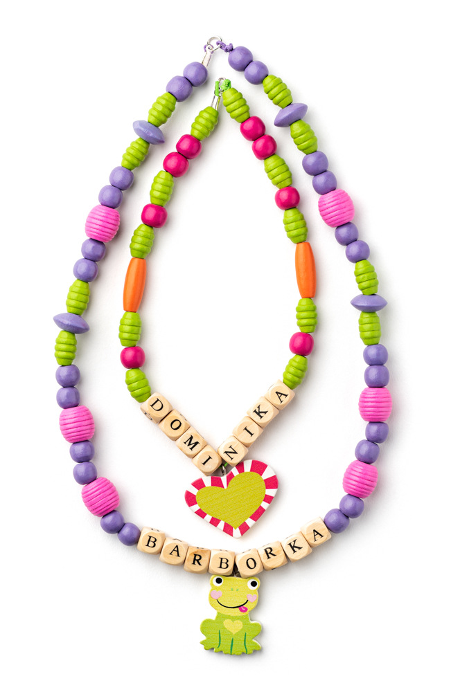 Sada obsahuje barevné korálky různých tvarů, korálky s motivem květin a srdíček a šňůrky k navlékání. Dřevěné srdíčko, v němž jsou korálky umístěny, slouží zároveň jako rámeček na fotografii, který je vybaven kováním na zavěšení.| Věk: 3+ | Rozměr žabky: 18 x 19 x 1,9 cm